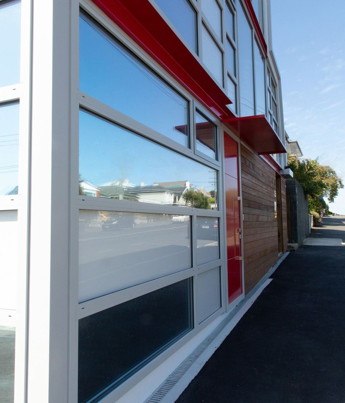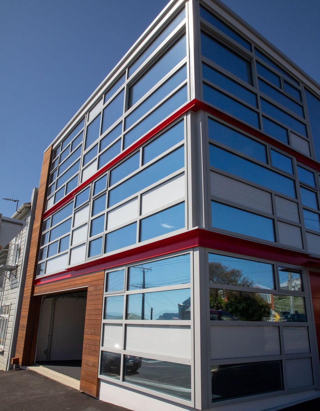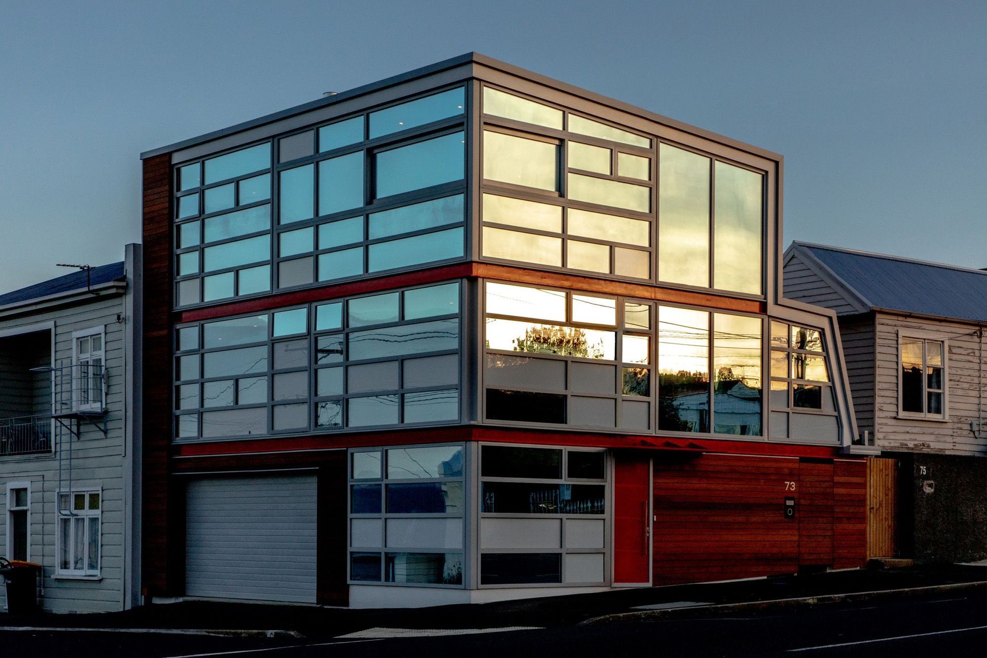 ArchiPro Project Summary - Three-storey townhouse in Dunedin featuring a striking combination of concrete, steel, and mirrored glass, designed to enhance spatial perception and adapt to its surroundings, with stunning views of the city and Otago Harbour.