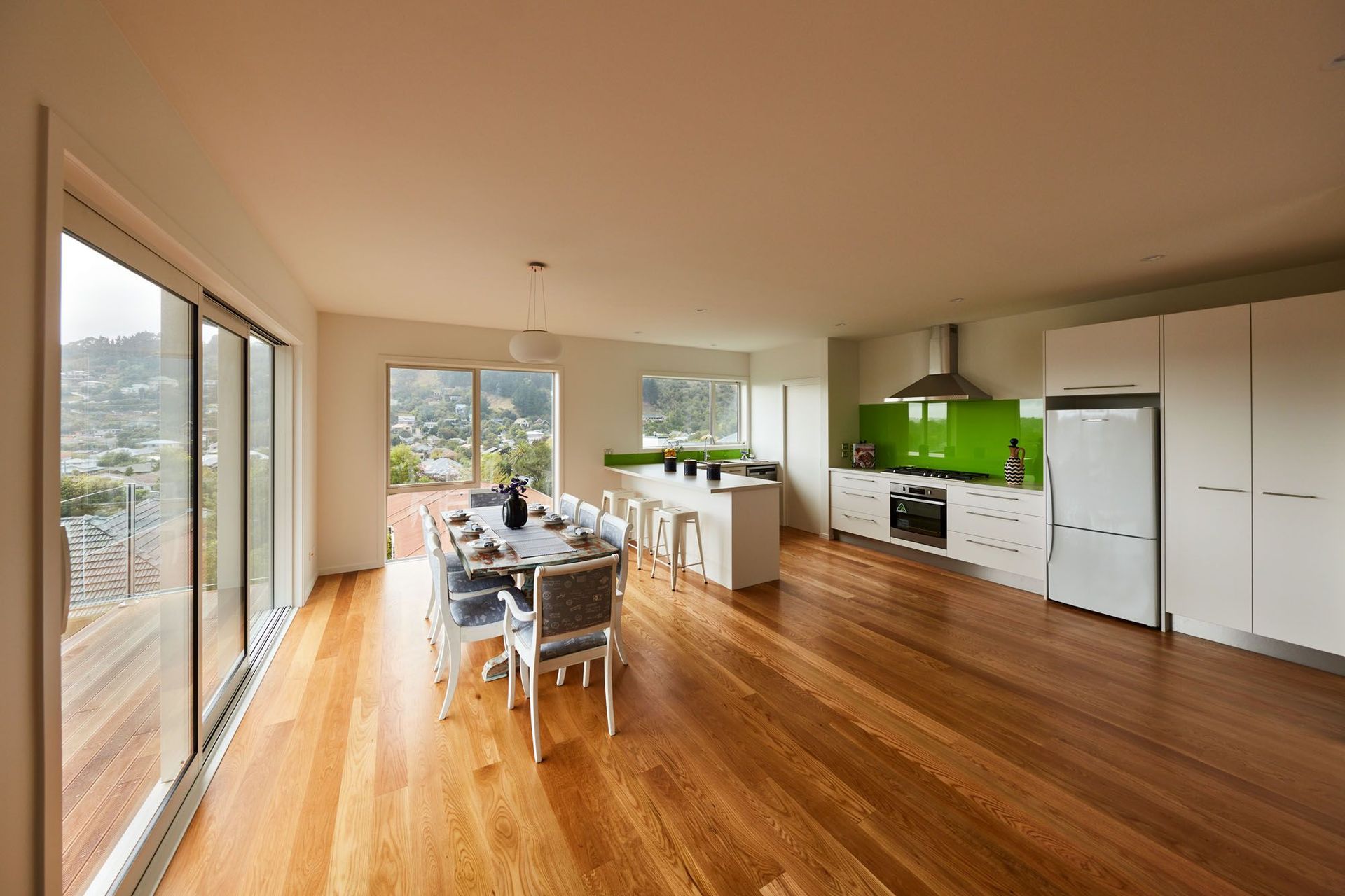 ArchiPro Project Summary - Glenview House: A modest yet functional hillside home designed to maximize stunning views on a challenging site, featuring timber weatherboard cladding and expansive American Oak flooring throughout the living area.