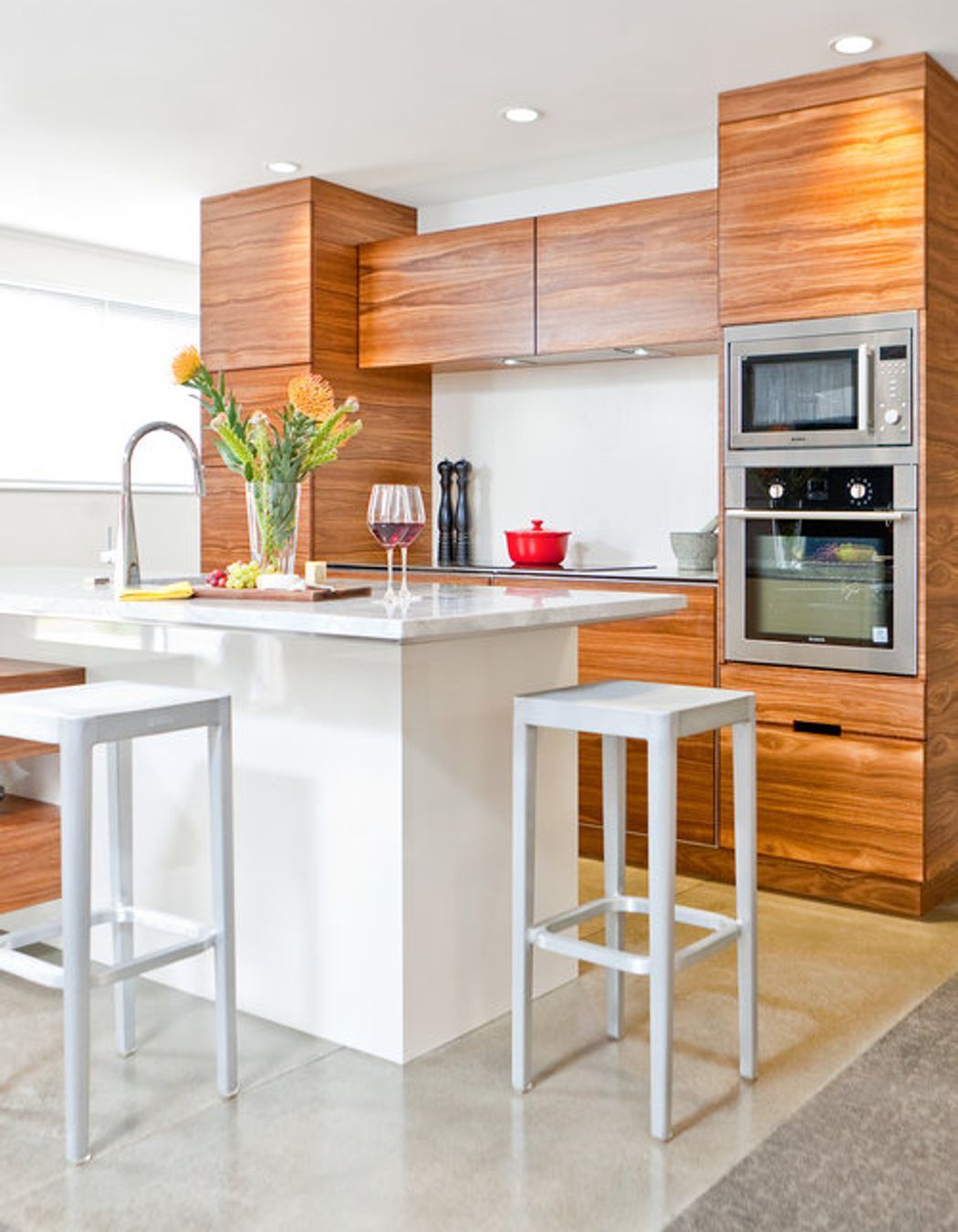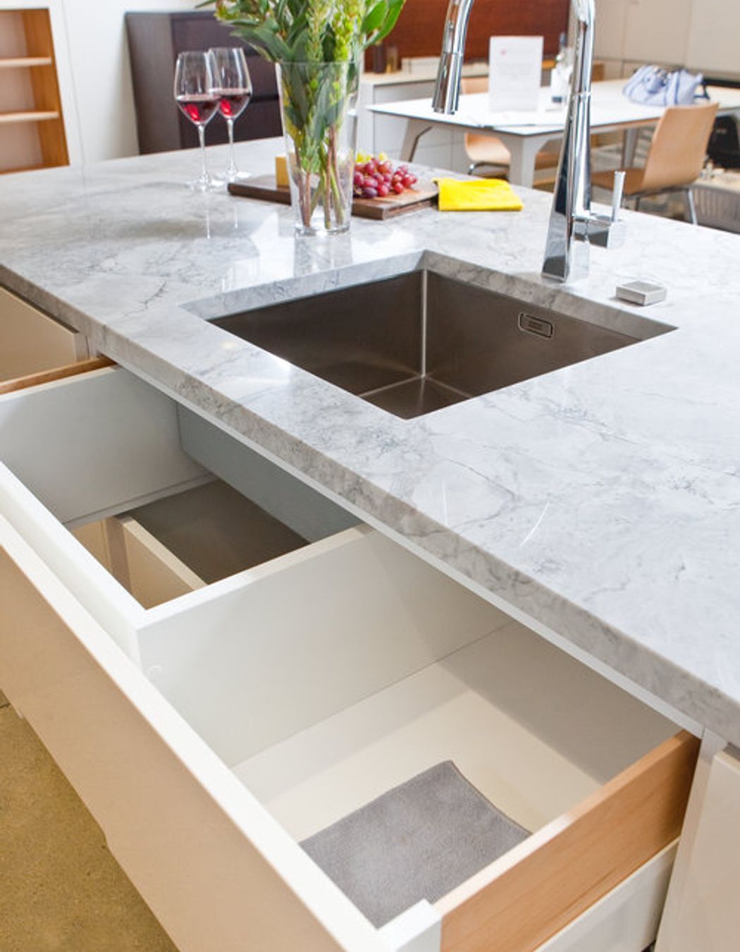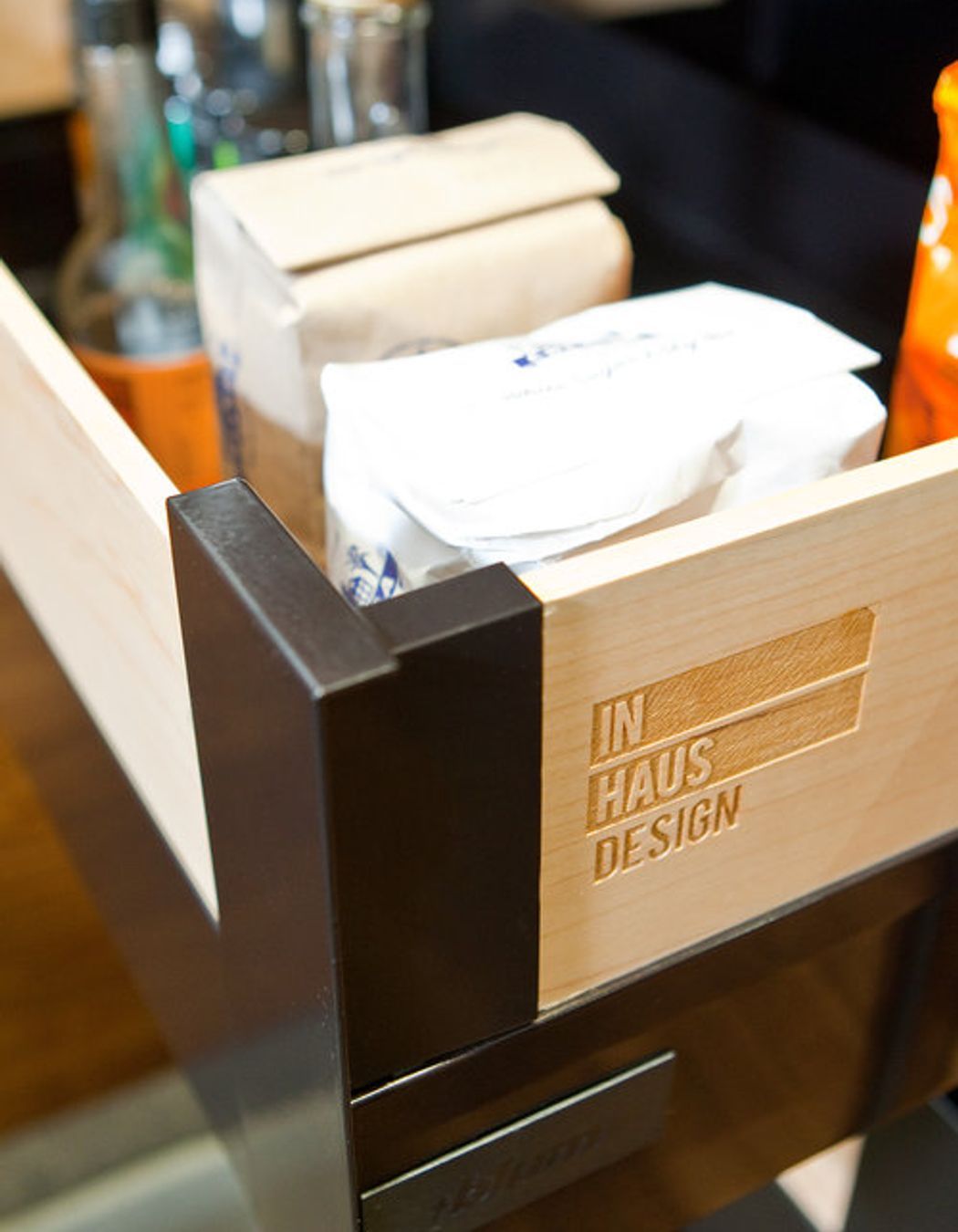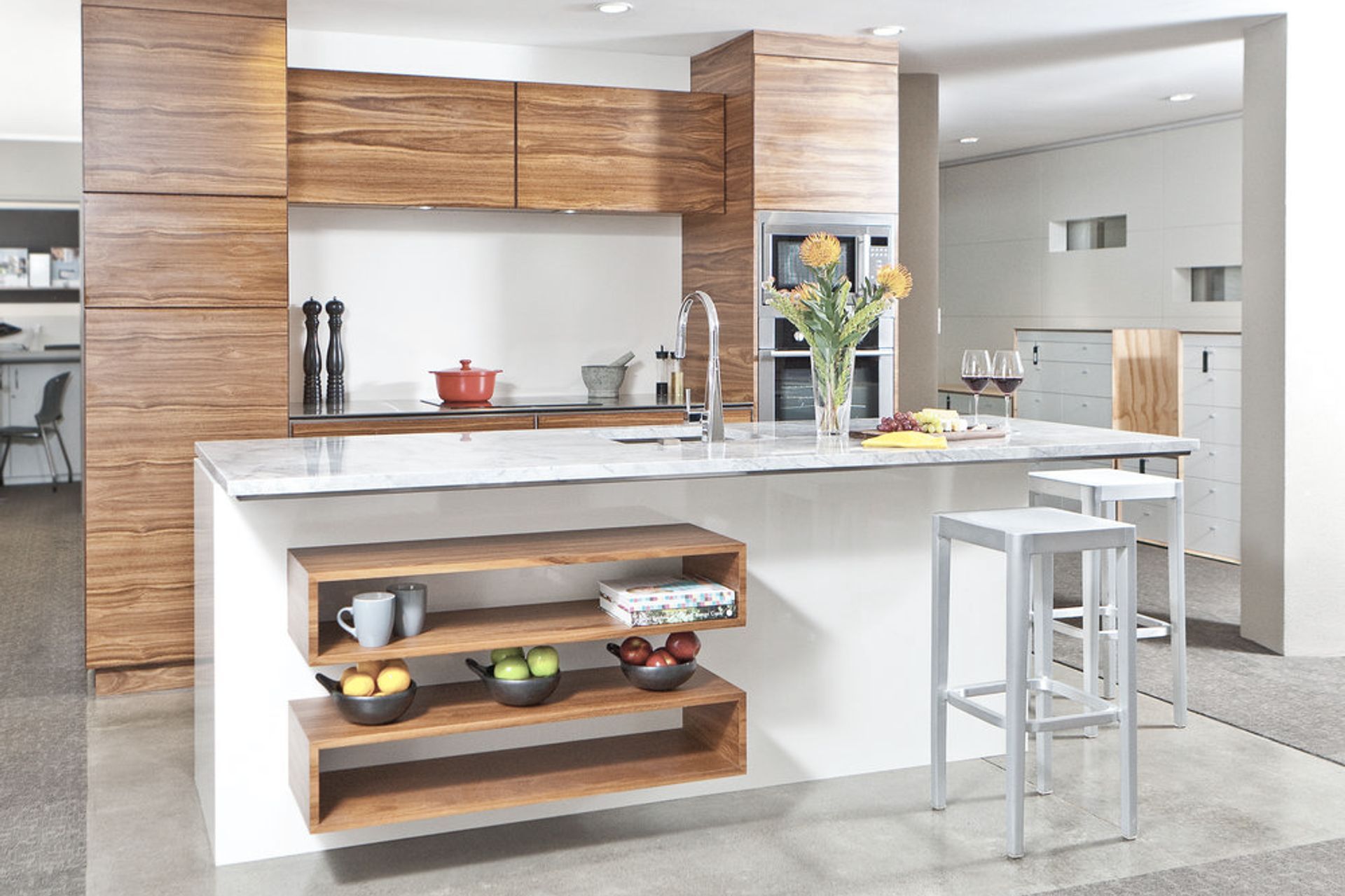 ArchiPro Project Summary - Innovative showroom kitchen showcasing experimental materials and design details, featuring advanced Blum hardware, electronic opening cupboards, and a striking combination of hand-stitched veneer and solid timber elements.