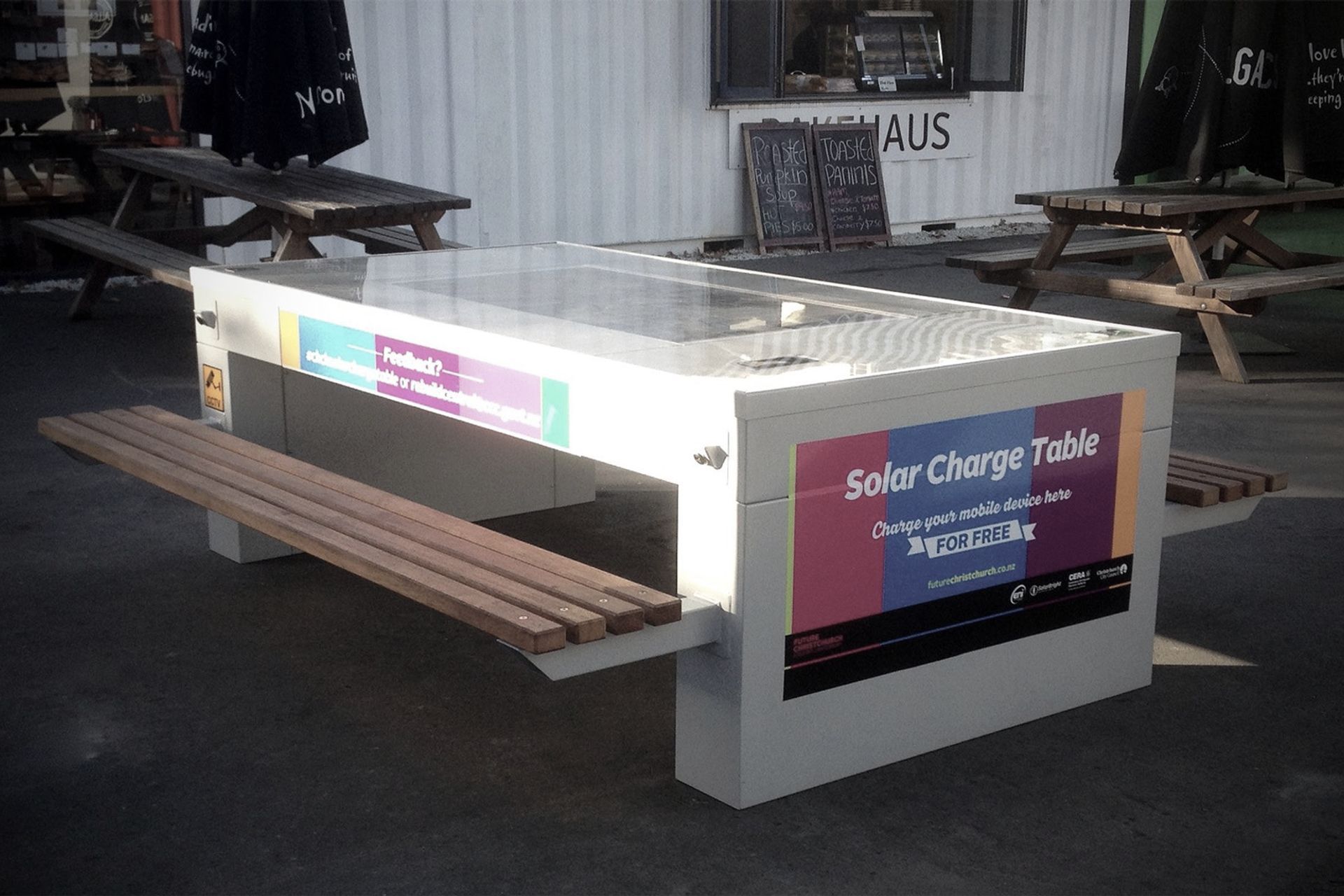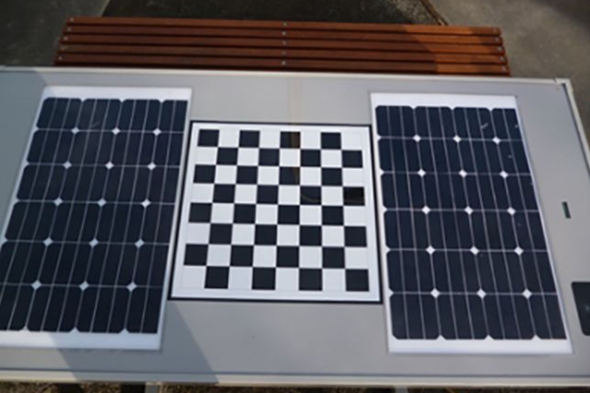 ArchiPro Project Summary - Innovative solar picnic table designed for community use, featuring USB charging and wireless charging pads, located in Paeroa Reserve, complete with a chess board for added recreational functionality.