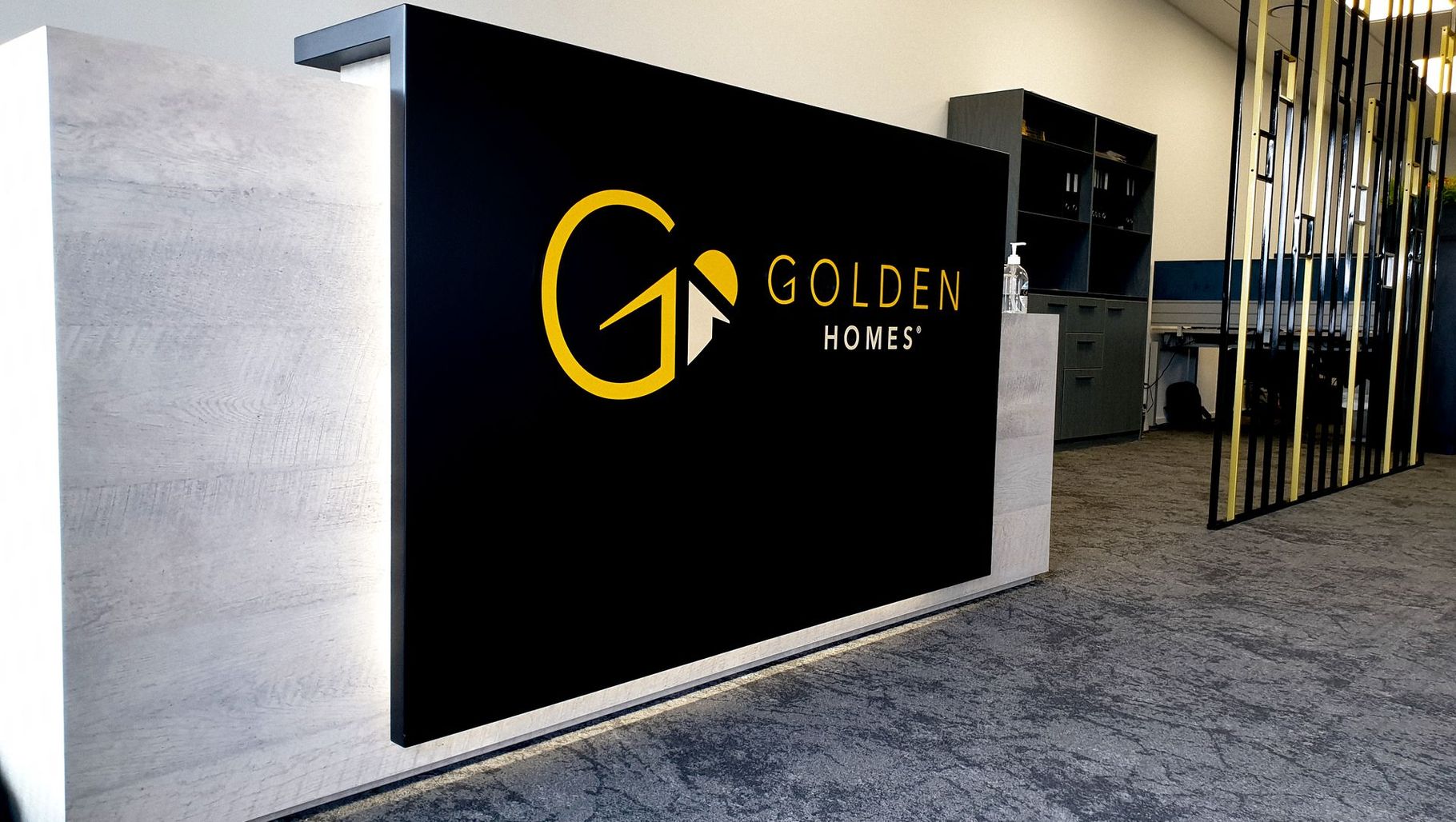 ArchiPro Project Summary - Elegant office fit-out for Golden Homes, featuring a floral reception design and sophisticated finishes, completed during the challenges of the Covid-19 lockdown.