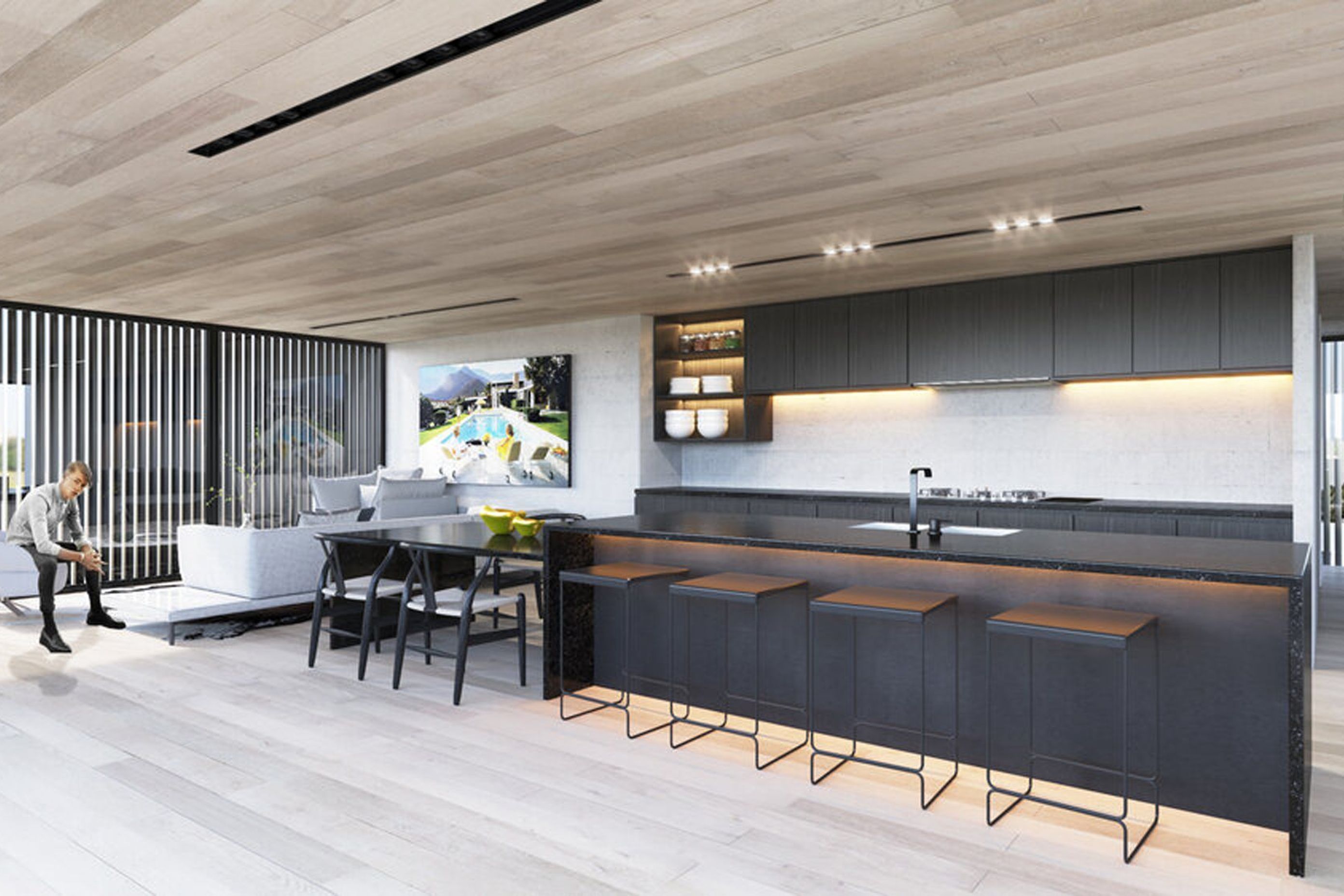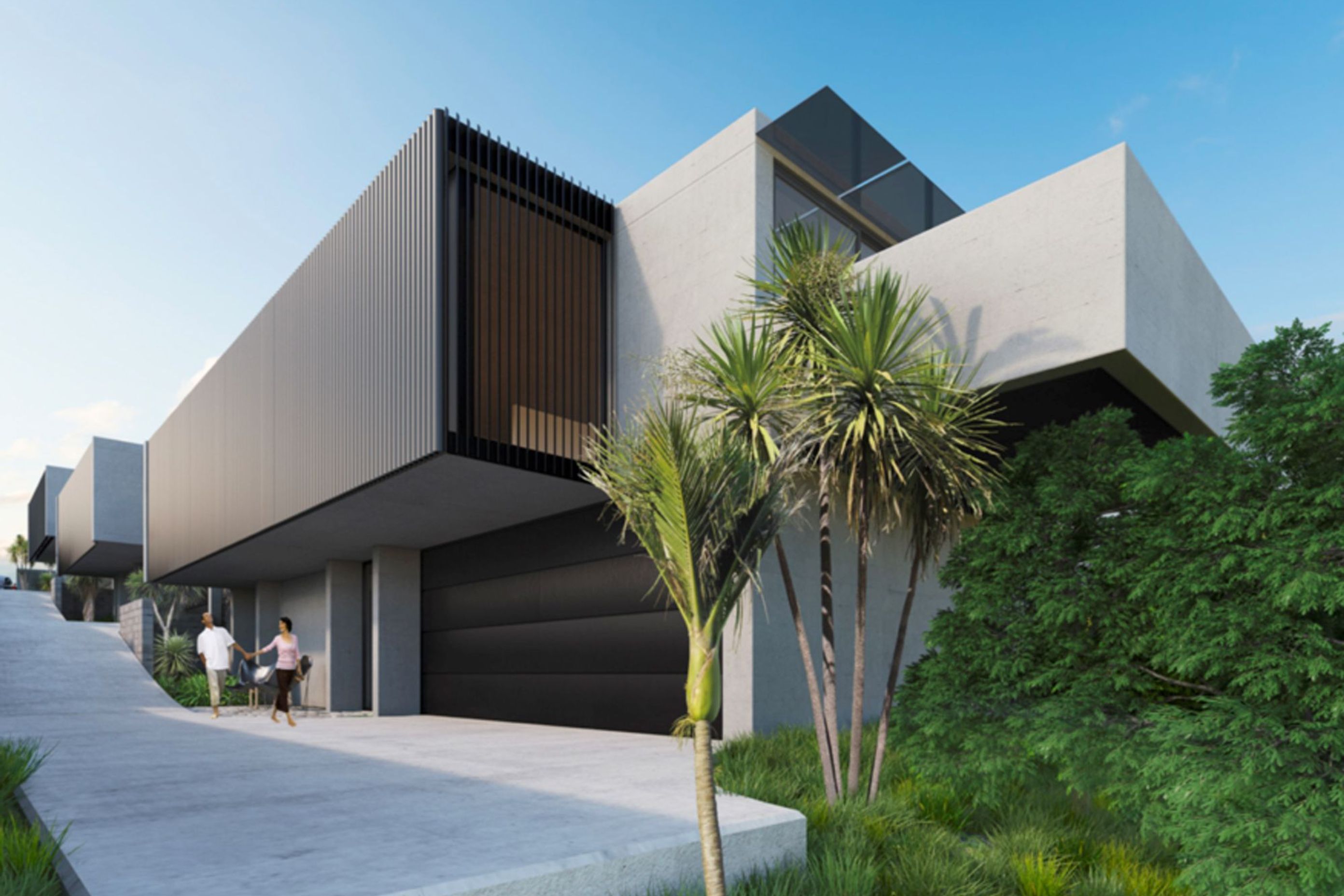 ArchiPro Project Summary - A trio of contemporary homes on Lake Pupuke, featuring industrial exteriors, luxurious interiors, and thoughtful design, including 3 bedrooms plus study, modern amenities, and private access within a native-focused landscape.