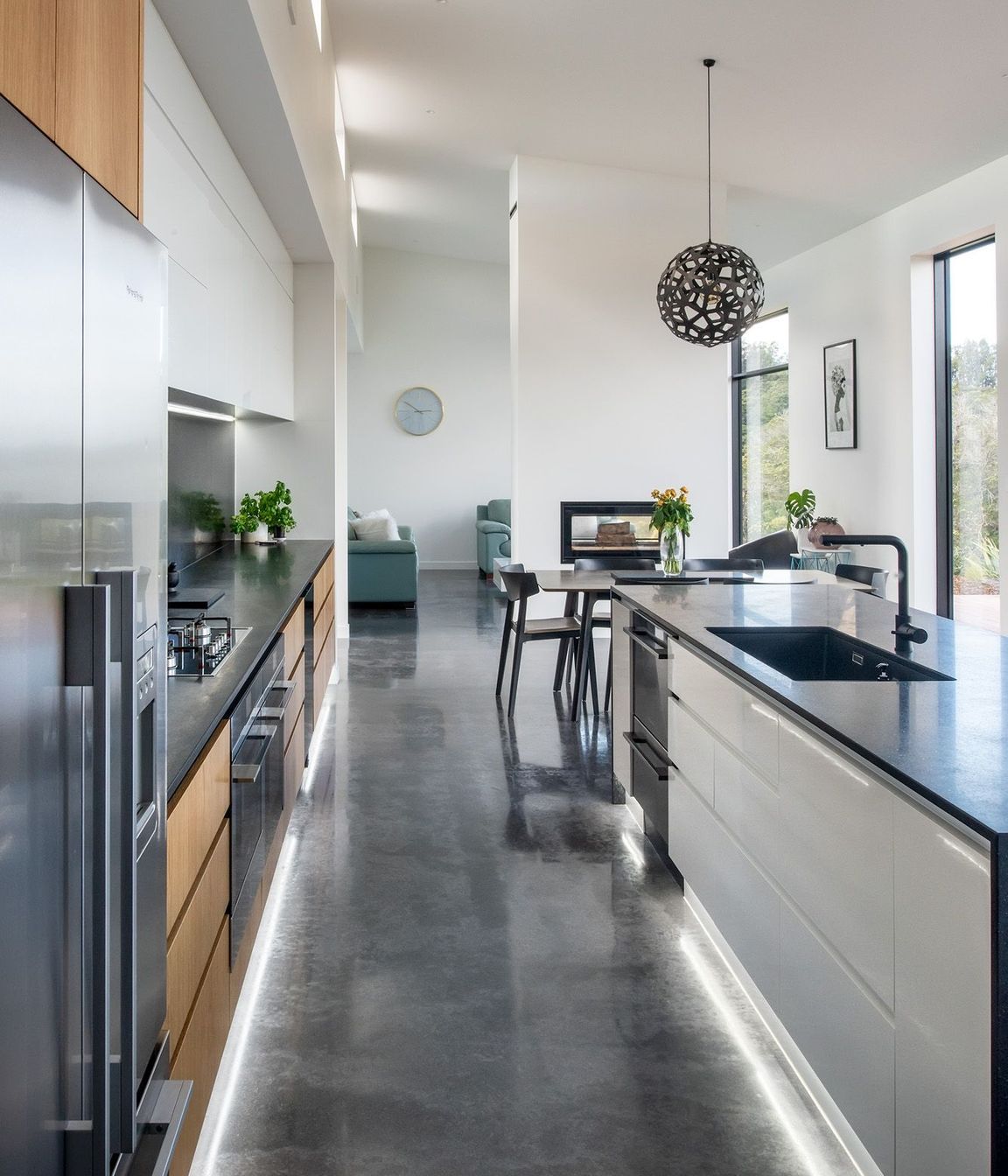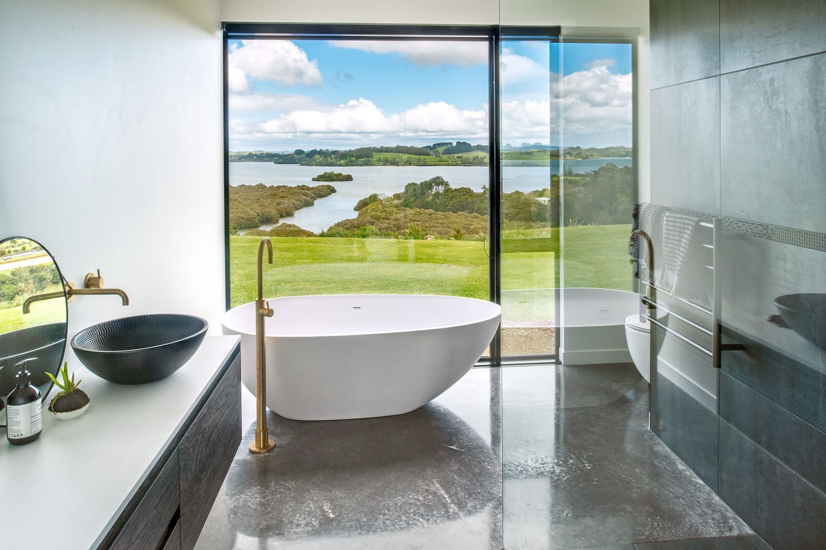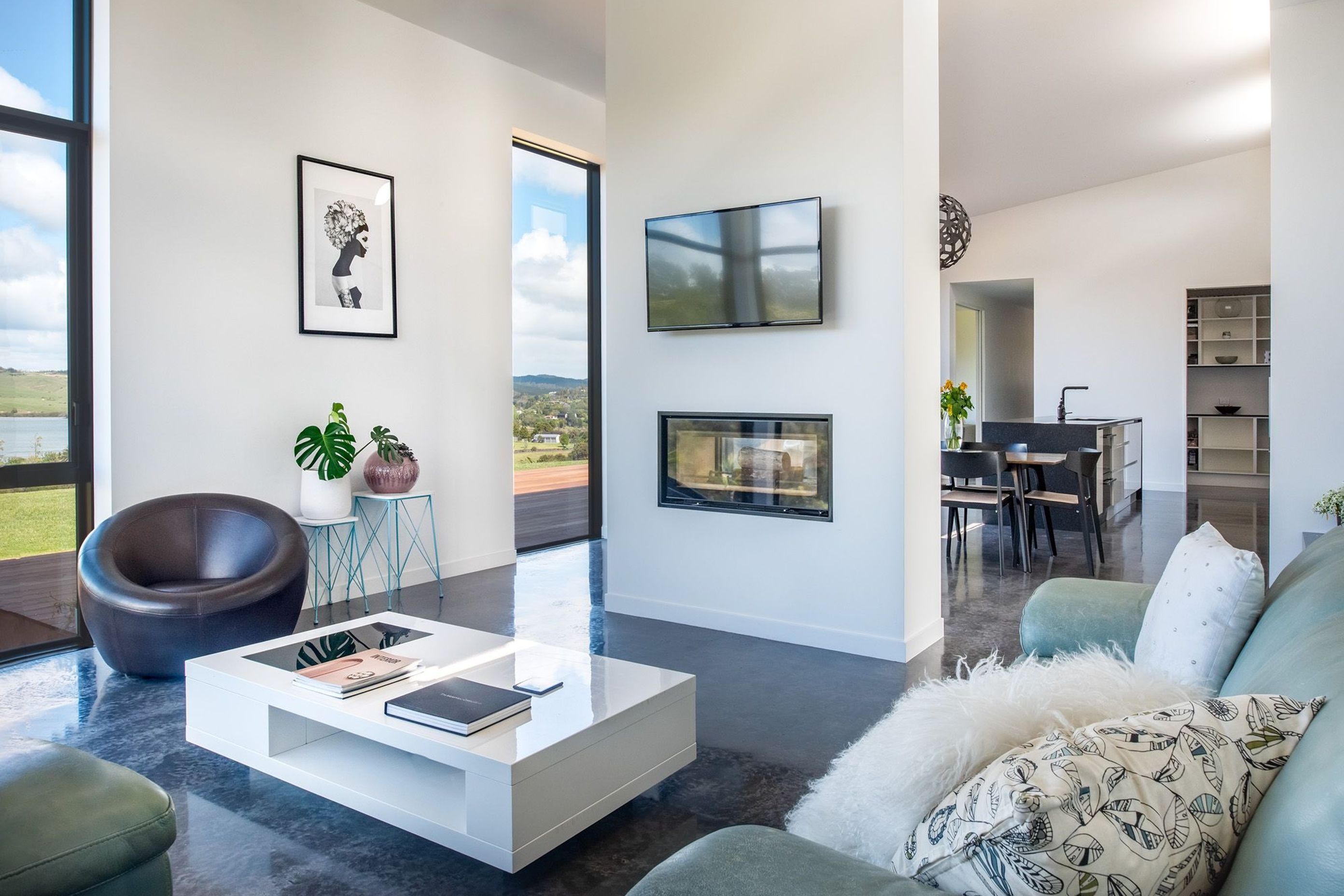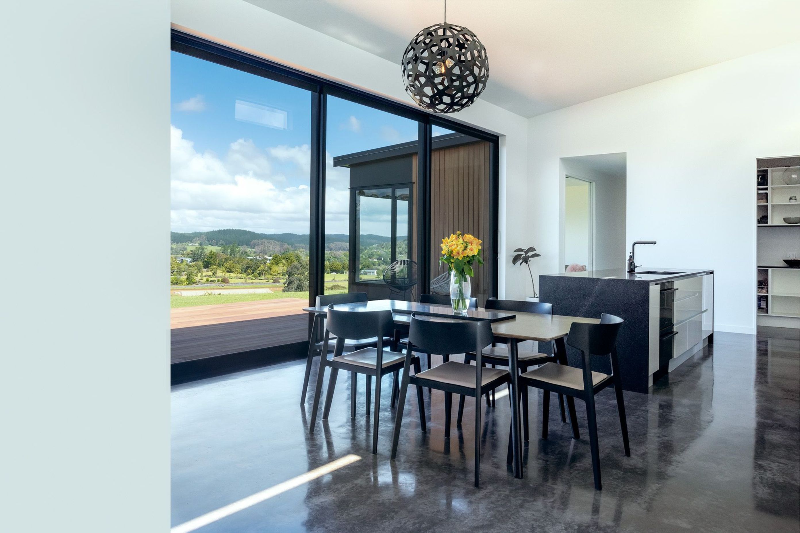 ArchiPro Project Summary - Goldie House: A modern residence by JK BUILDS LTD, featuring stained cedar and black Titan Panel for a striking façade, expansive glazing, and polished concrete floors, all designed to maximize stunning views over the Kerikeri inlet.