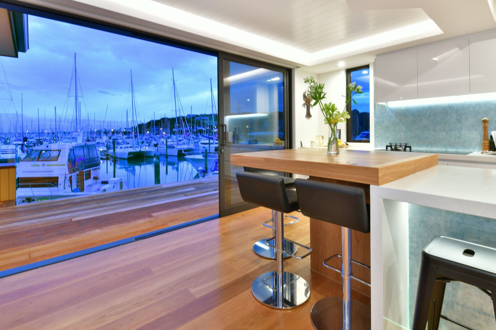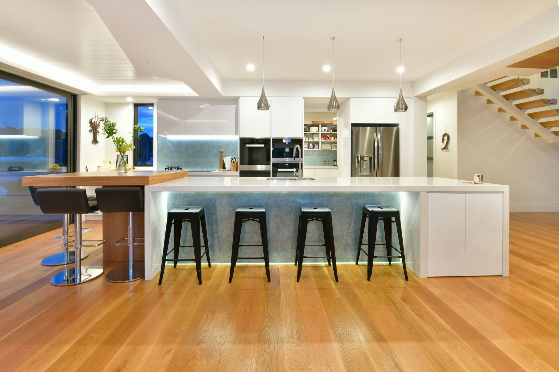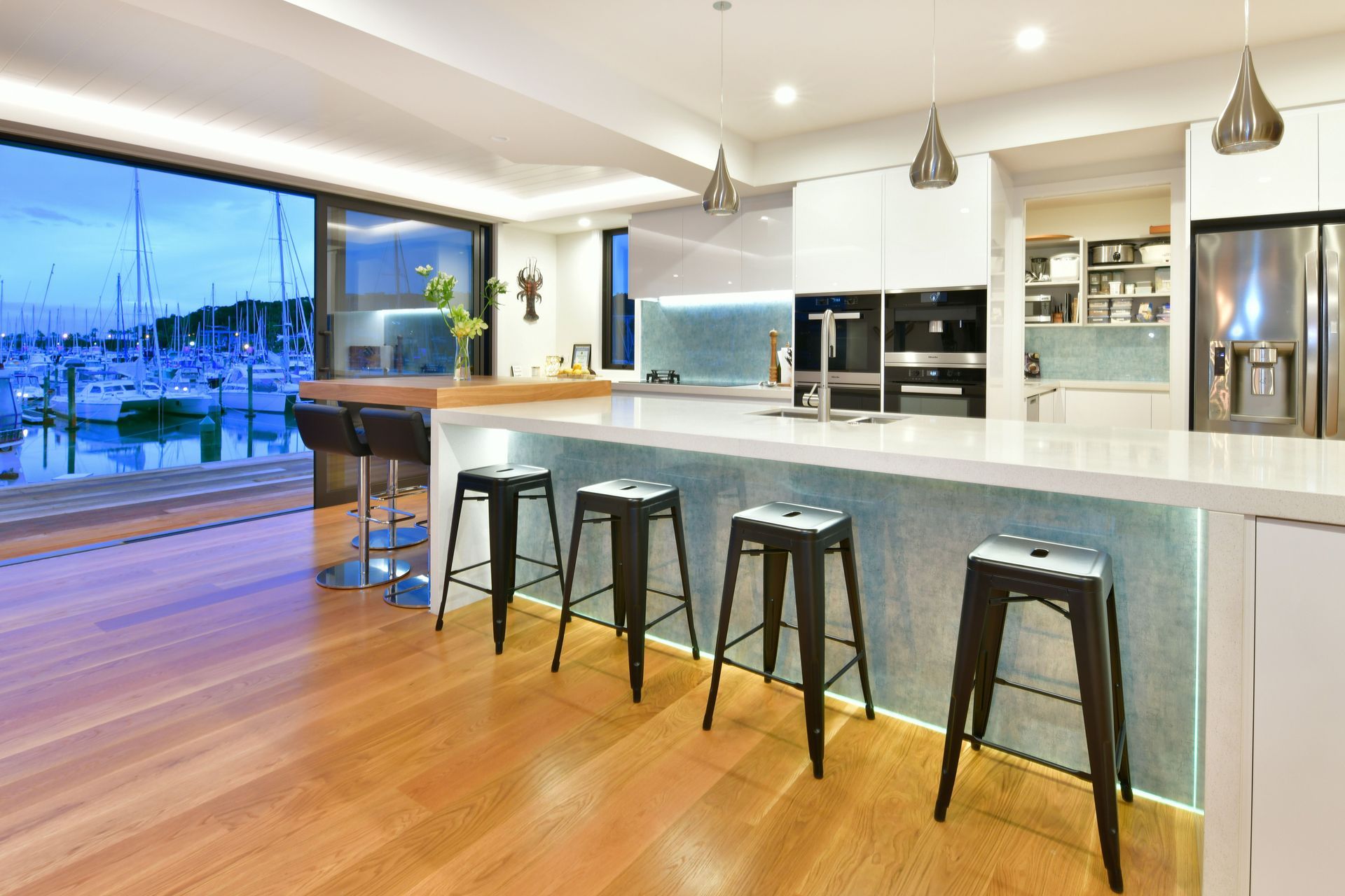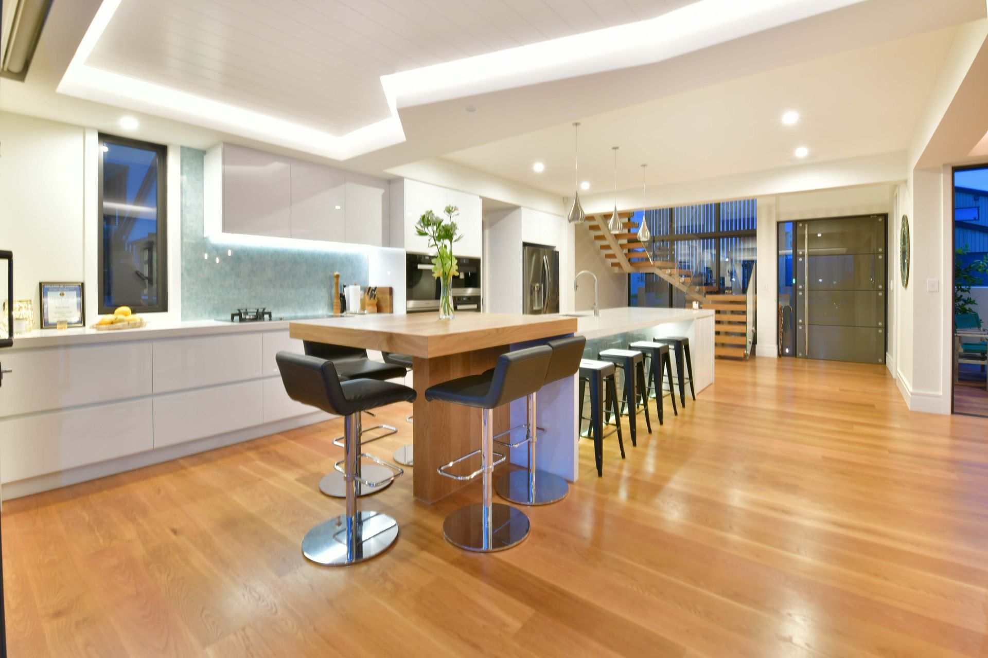 ArchiPro Project Summary - Elegant harbour front home featuring premium oak timber flooring and meticulously finished wooden elements, including a striking feature ceiling paneling, a wooden kitchen bench, and solid oak stairs, all treated with Osmo Polyx oil for lasting beauty.