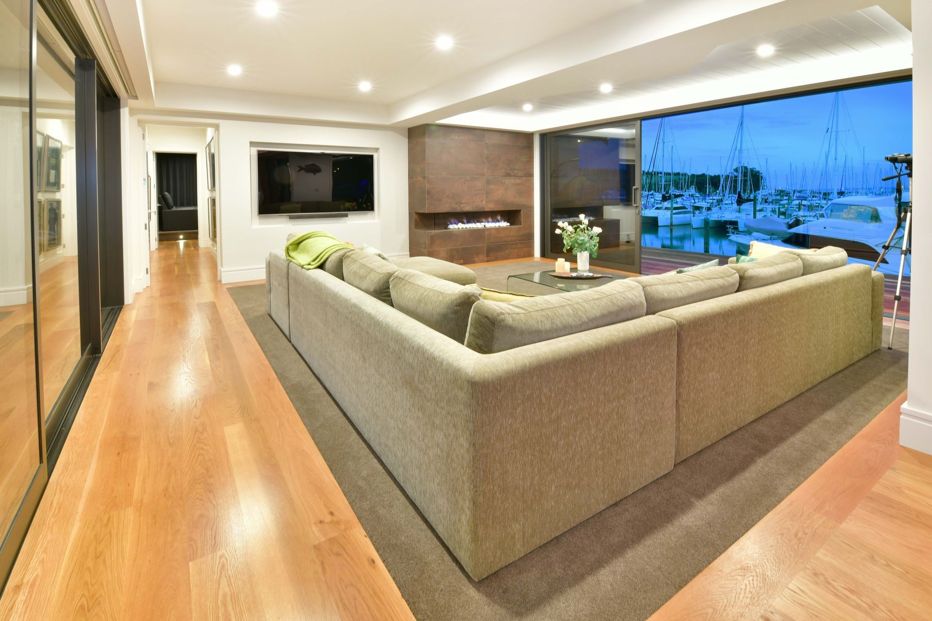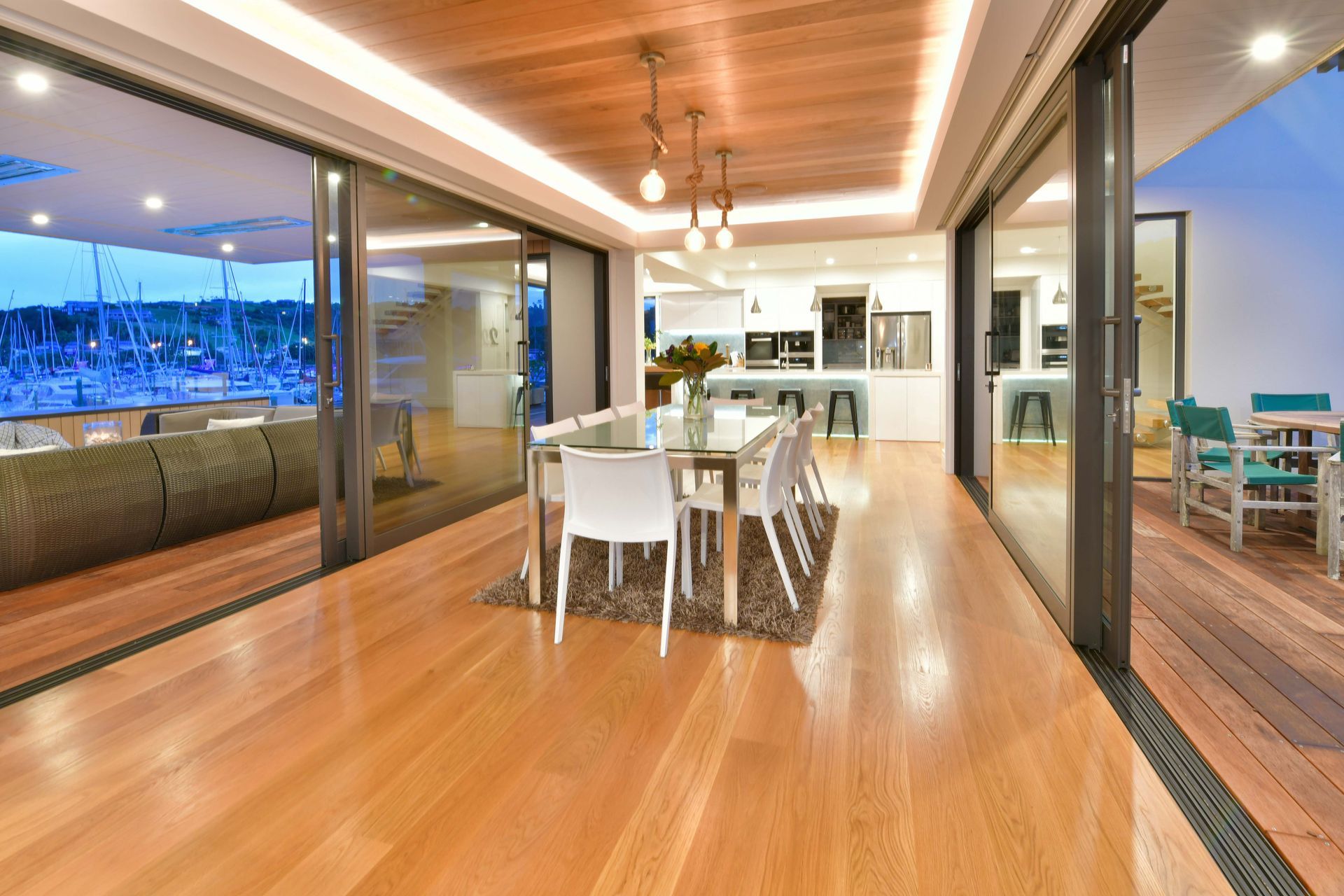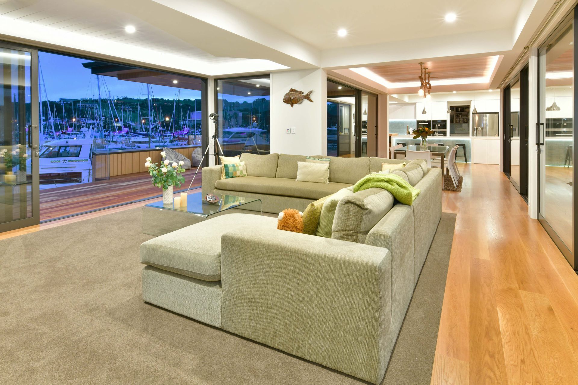 ArchiPro Project Summary - Elegant harbour front home featuring premium oak timber flooring and meticulously finished wooden elements, including a striking feature ceiling paneling, a wooden kitchen bench, and solid oak stairs, all treated with Osmo Polyx oil for lasting beauty.