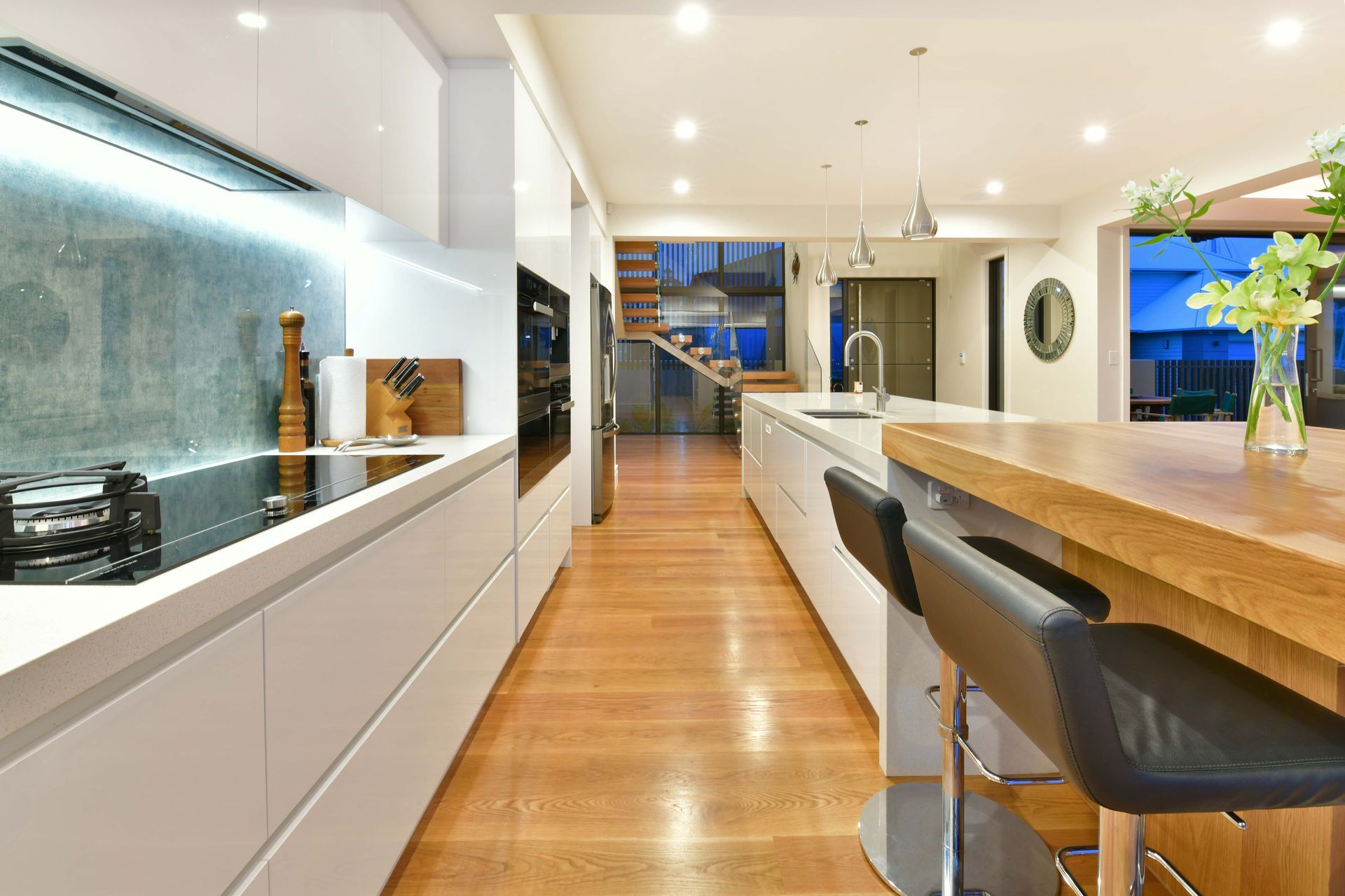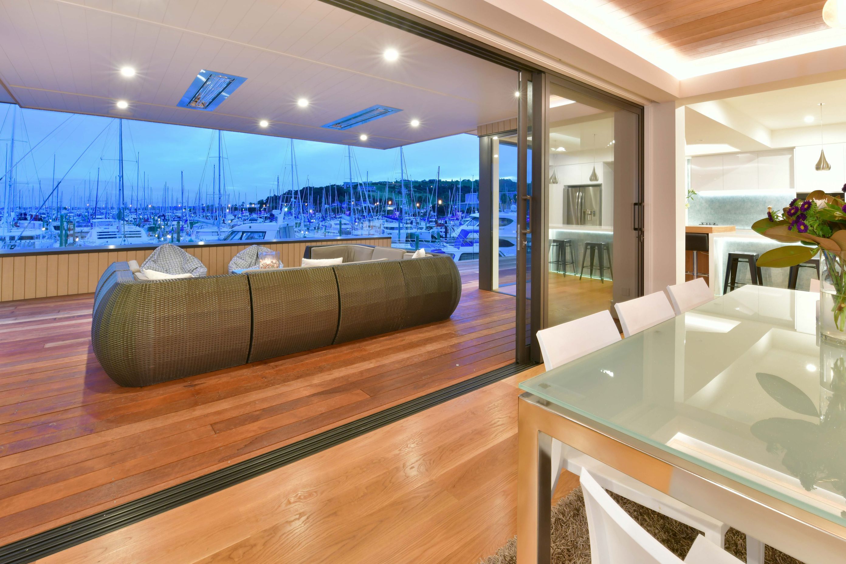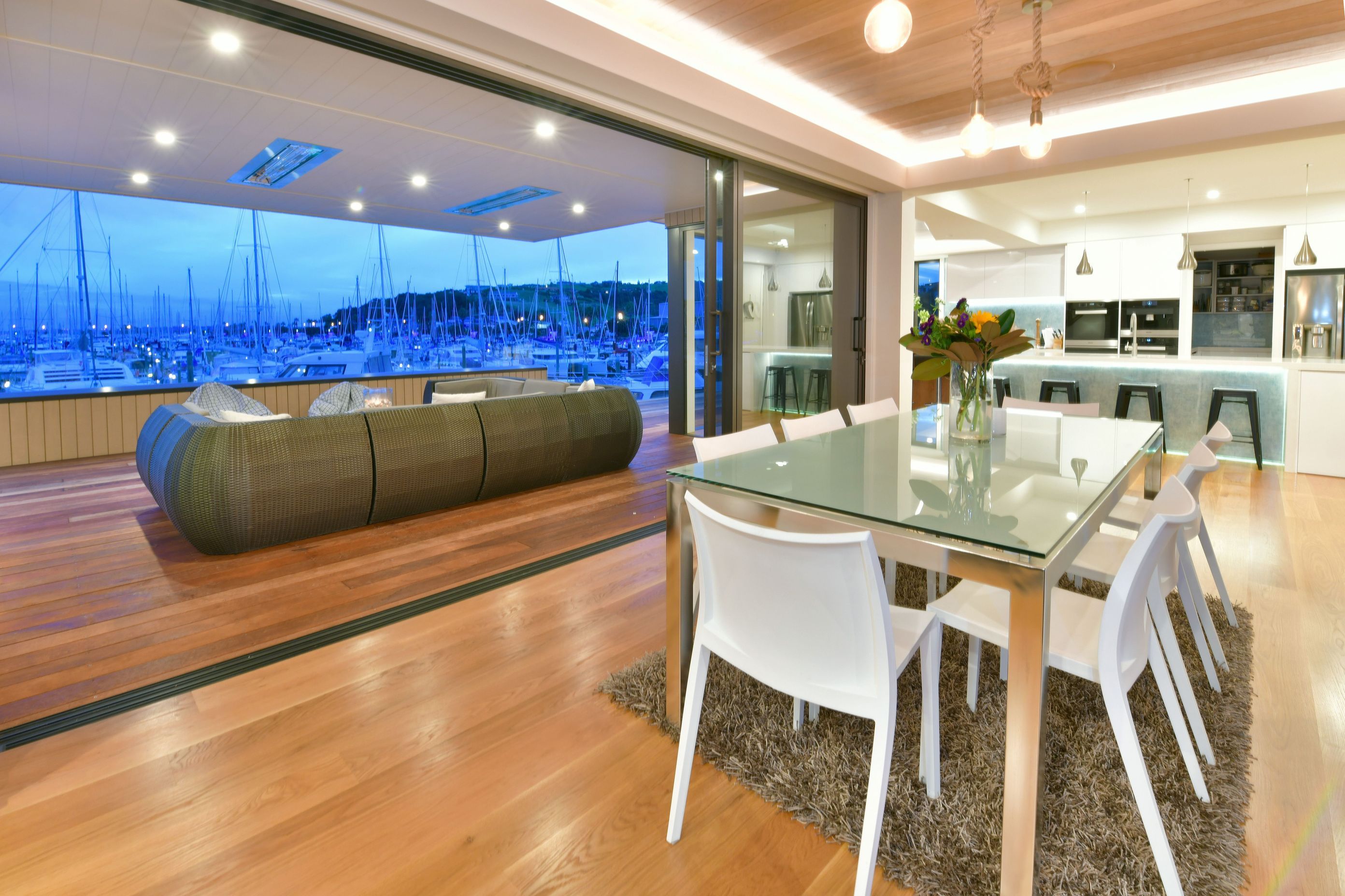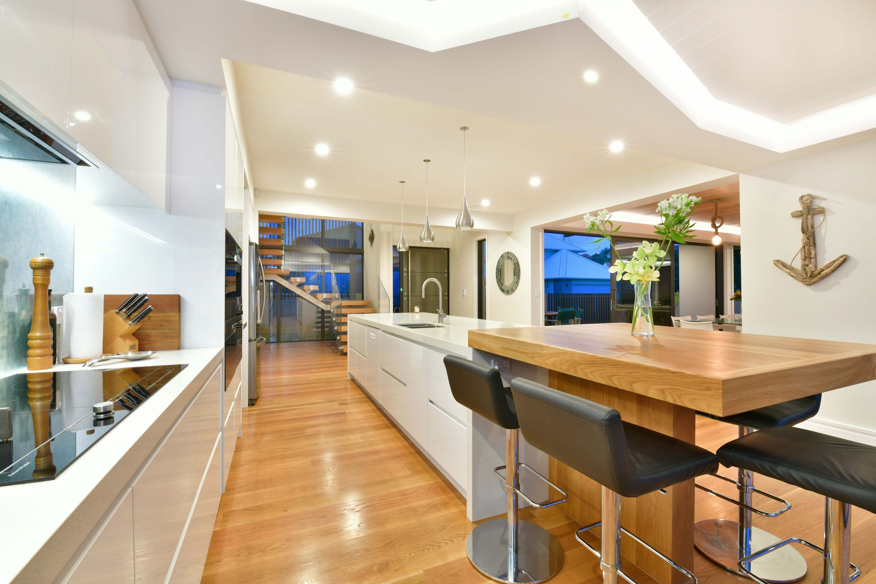 ArchiPro Project Summary - Elegant harbour front home featuring premium oak timber flooring and meticulously finished wooden elements, including a striking feature ceiling paneling, a wooden kitchen bench, and solid oak stairs, all treated with Osmo Polyx oil for lasting beauty.
