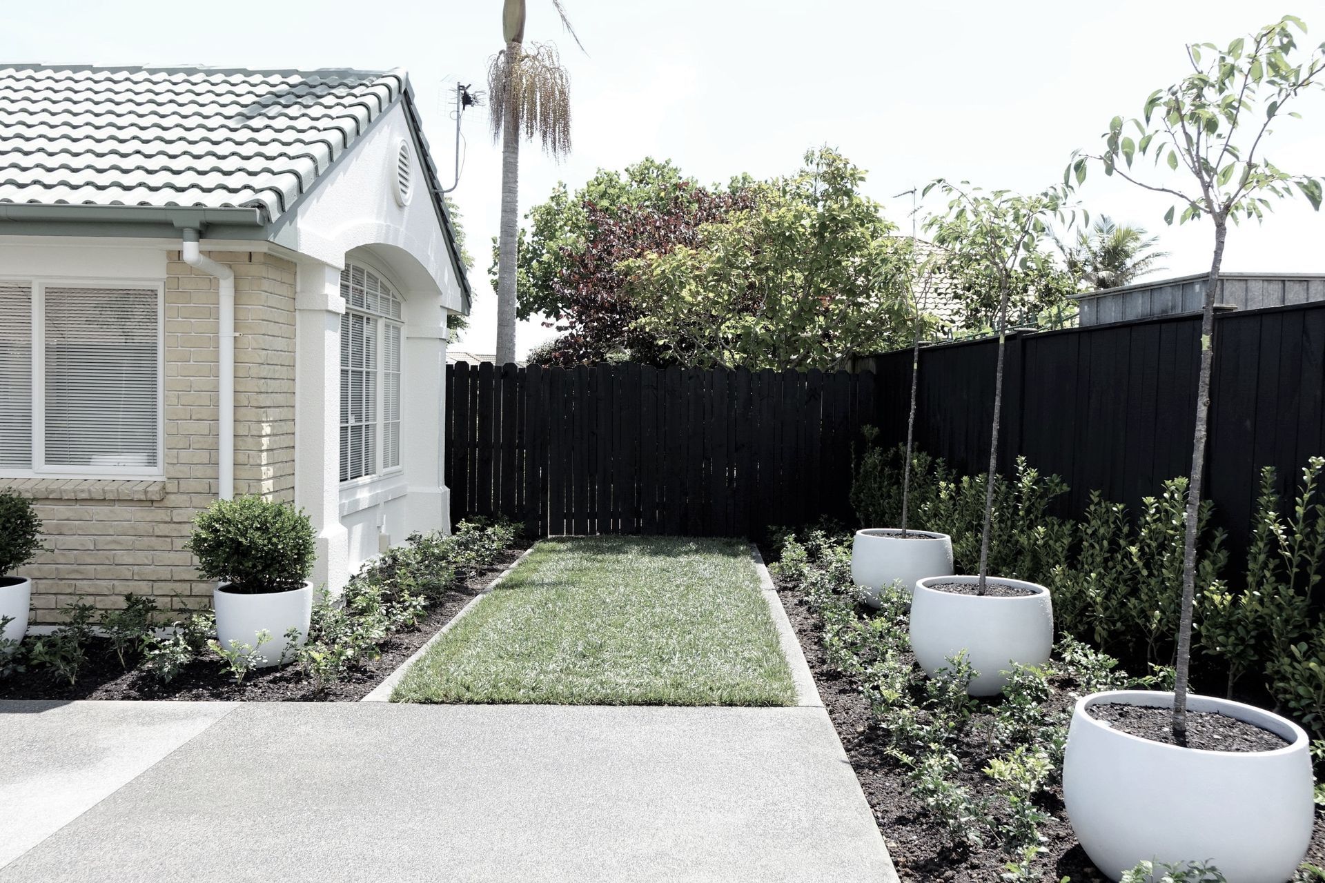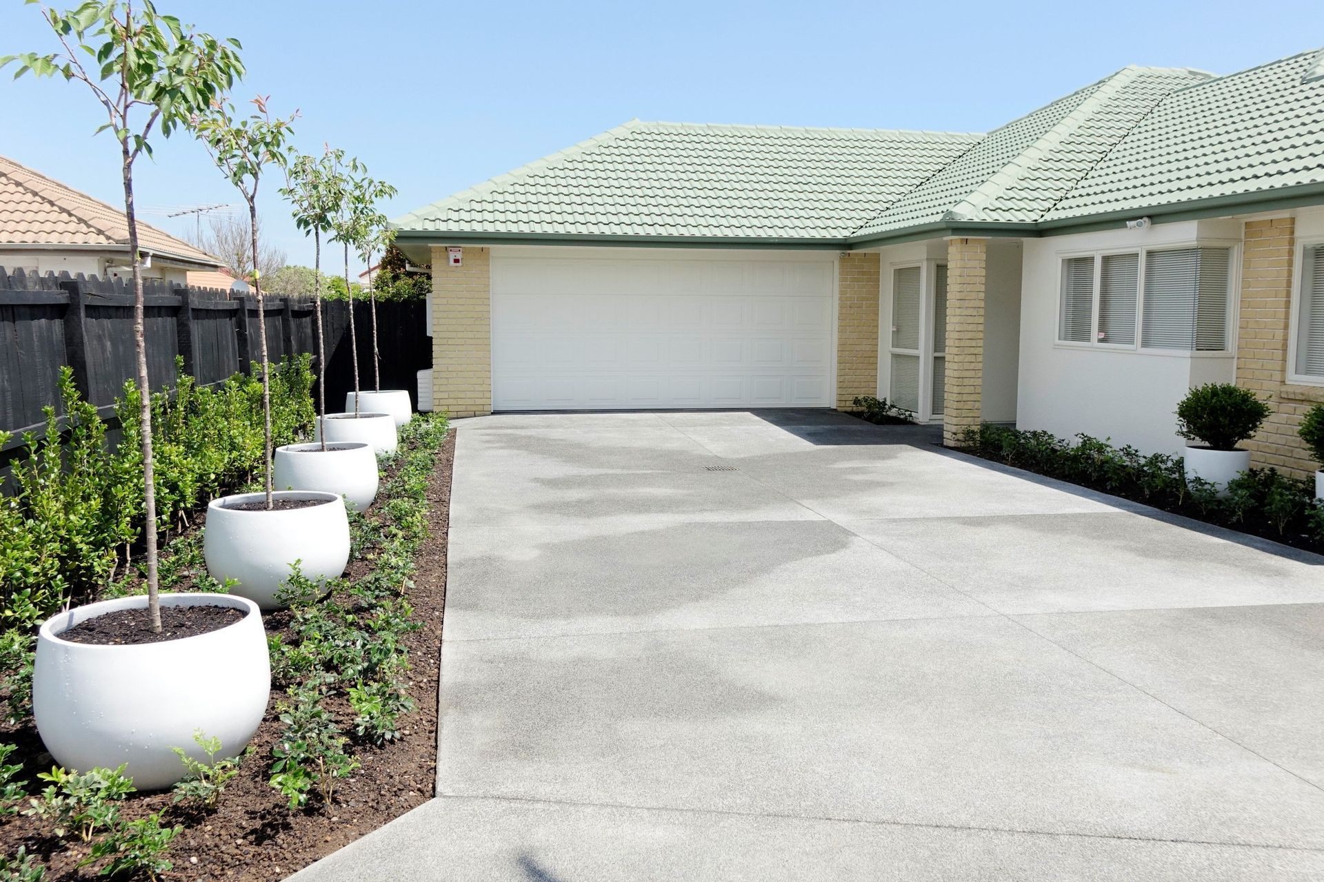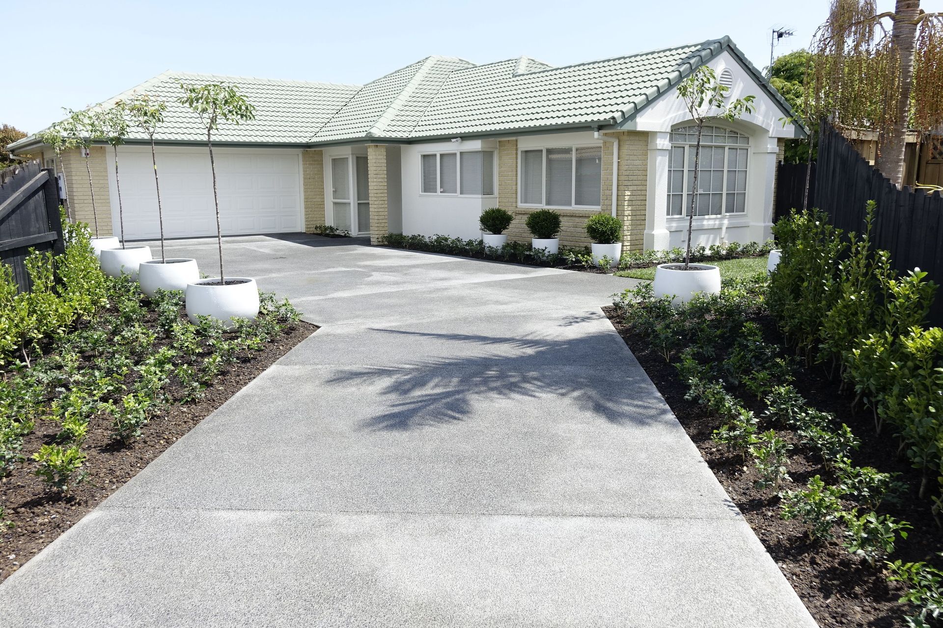 ArchiPro Project Summary - Complete outdoor redesign in Golflands, Auckland, featuring a contemporary entrance, new driveway, lawn area, and garden layout, utilizing existing architecture for a stylish aesthetic and enhanced functionality.