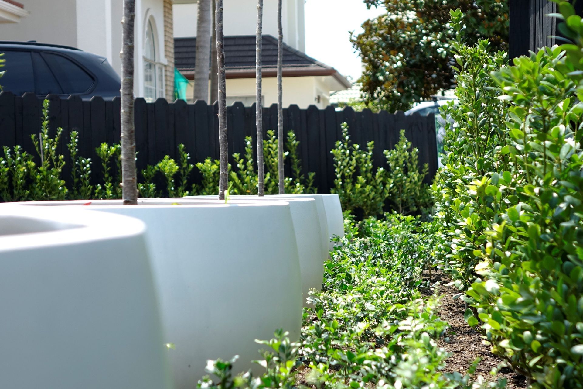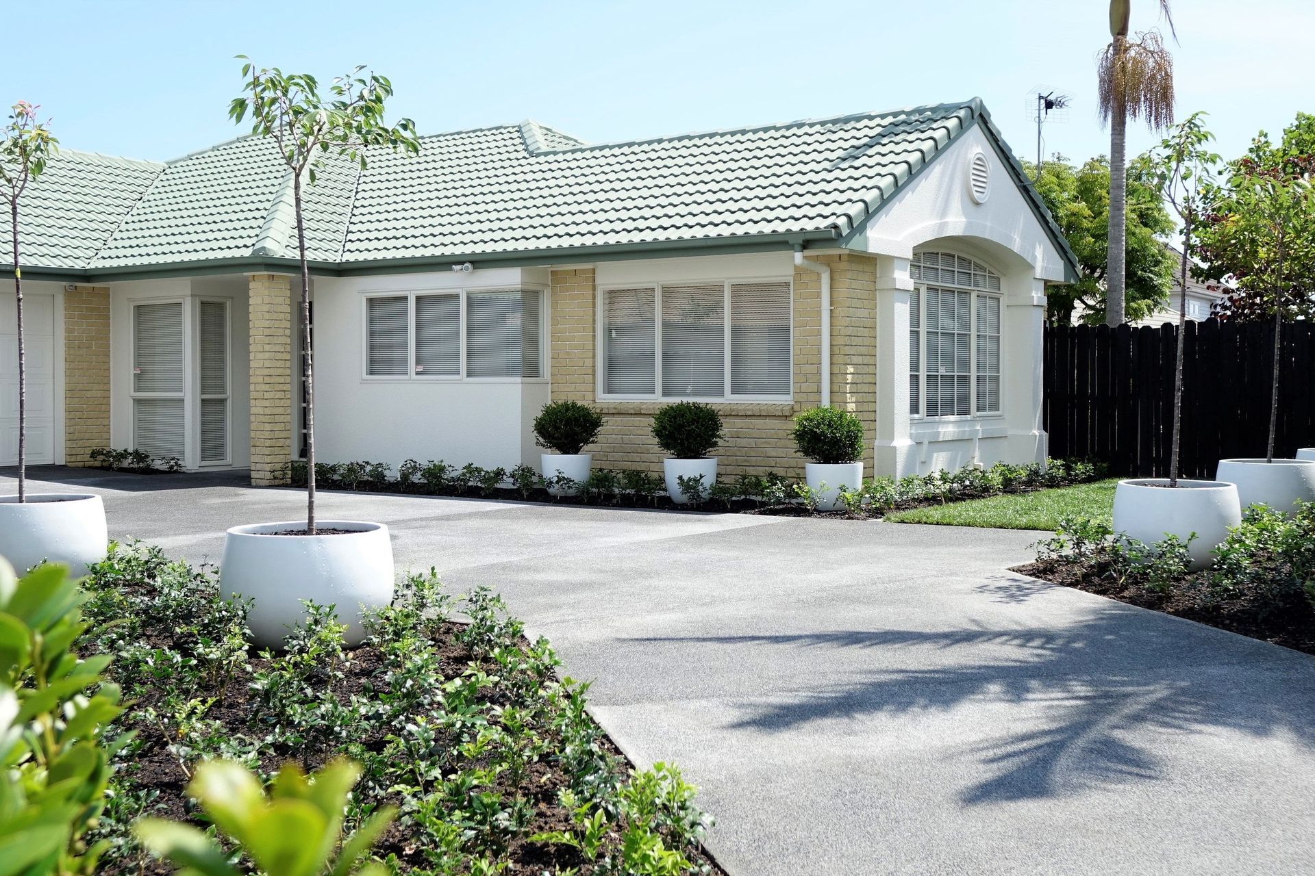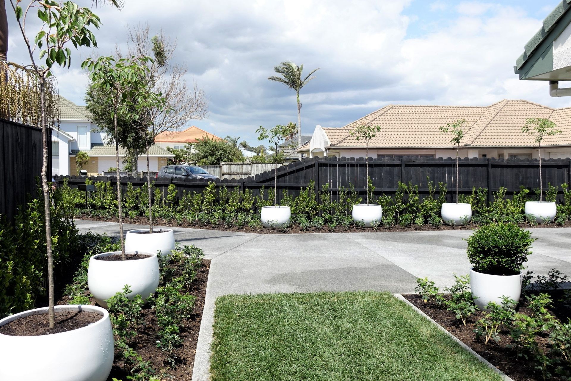 ArchiPro Project Summary - Complete outdoor redesign in Golflands, Auckland, featuring a contemporary entrance, new driveway, lawn area, and garden layout, utilizing existing architecture for a stylish aesthetic and enhanced functionality.
