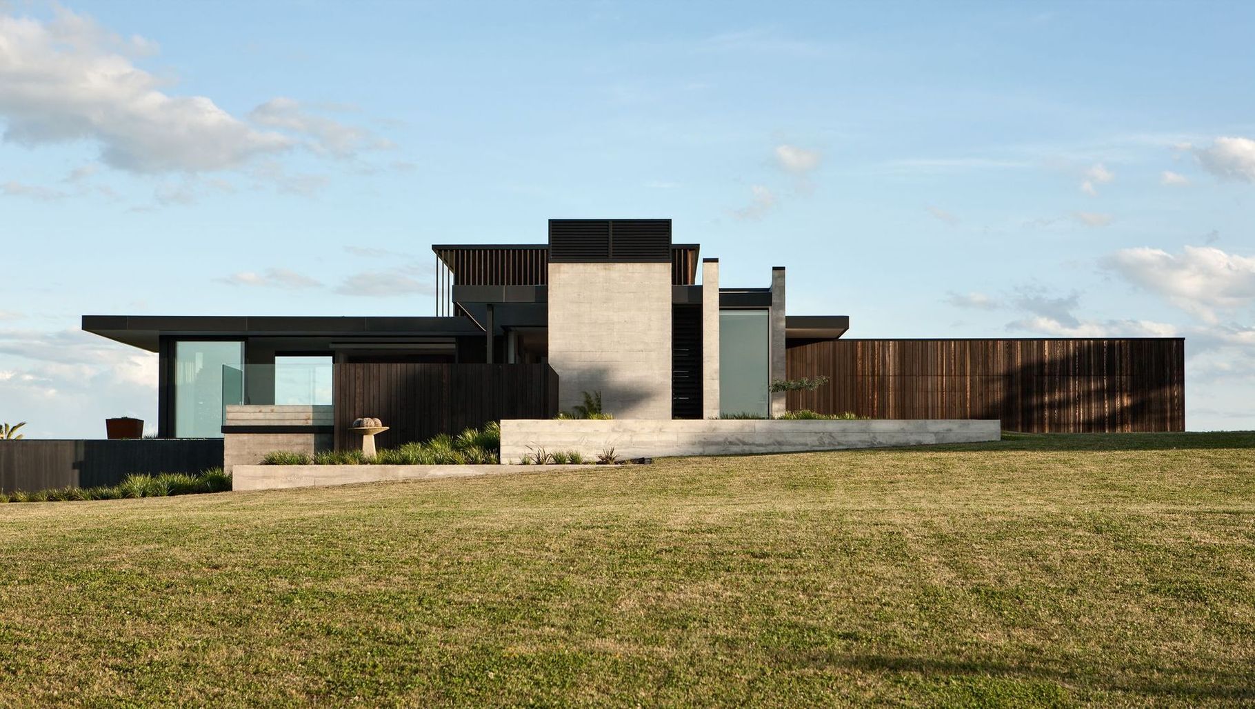 ArchiPro Project Summary - Elevated residence harmonizing with rural landscape, featuring sculptural concrete and cedar design, distinct public and private spaces, and adaptable living areas for family gatherings or intimate living.