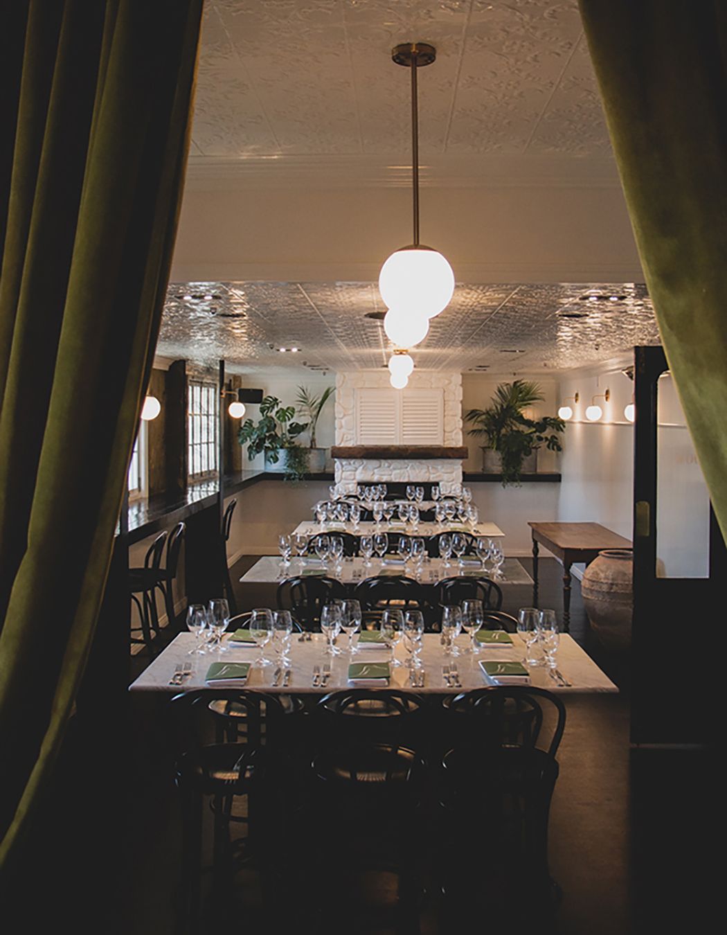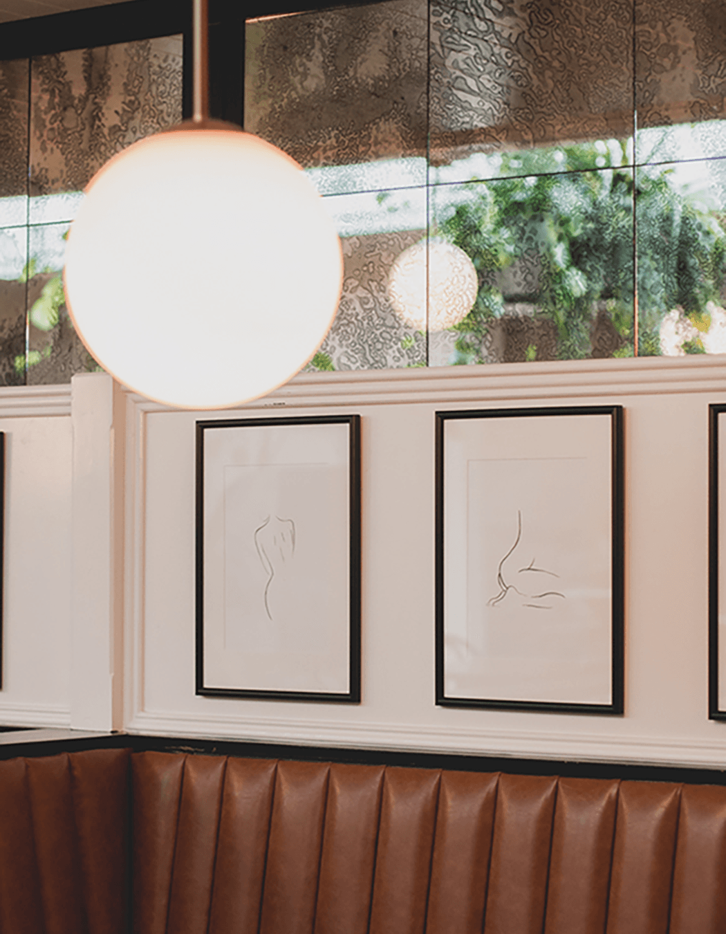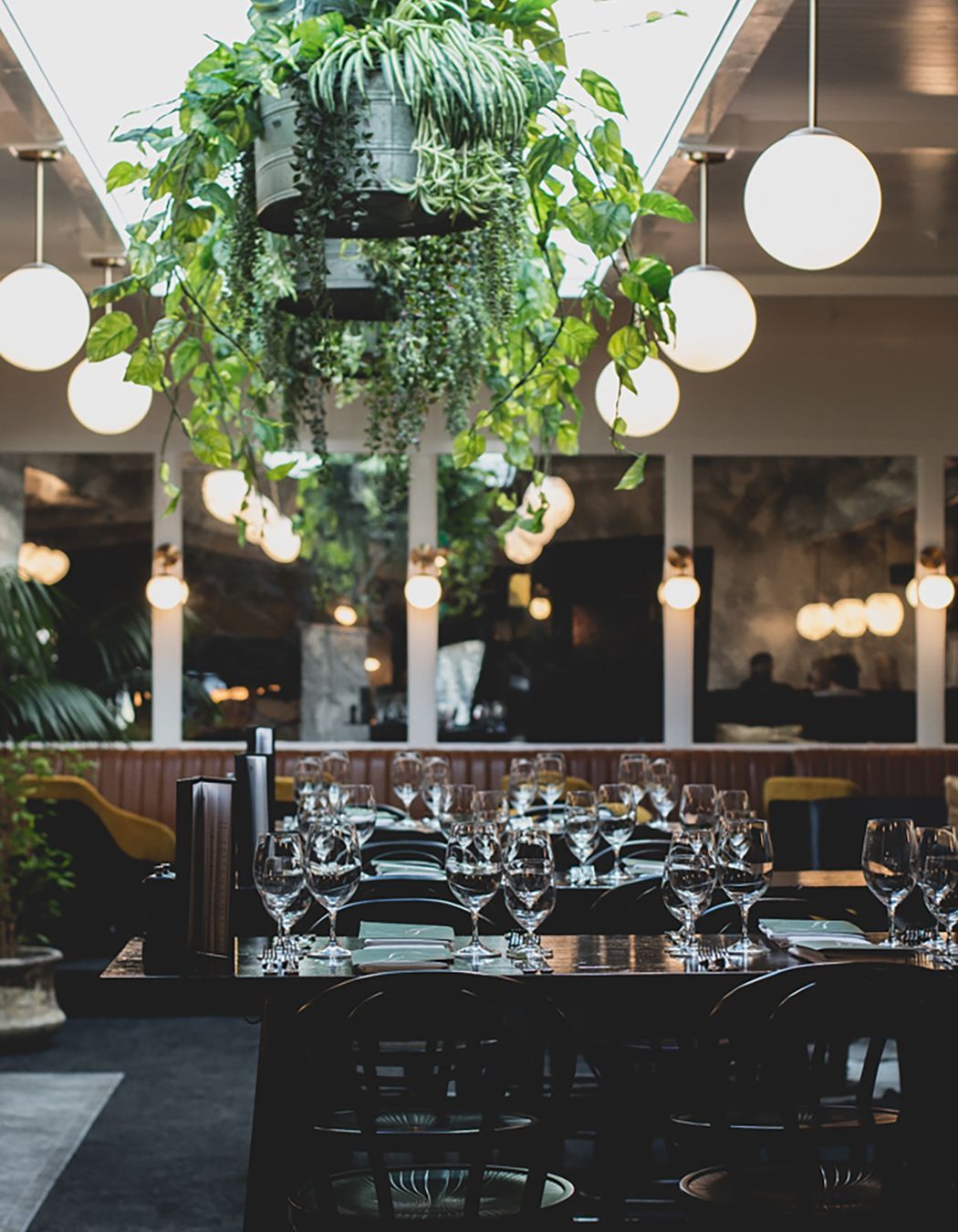 ArchiPro Project Summary - A fresh and inviting French-inspired bistro featuring a skylight and extensive planting, transforming a dark space into a vibrant dining experience while maintaining an intimate atmosphere.