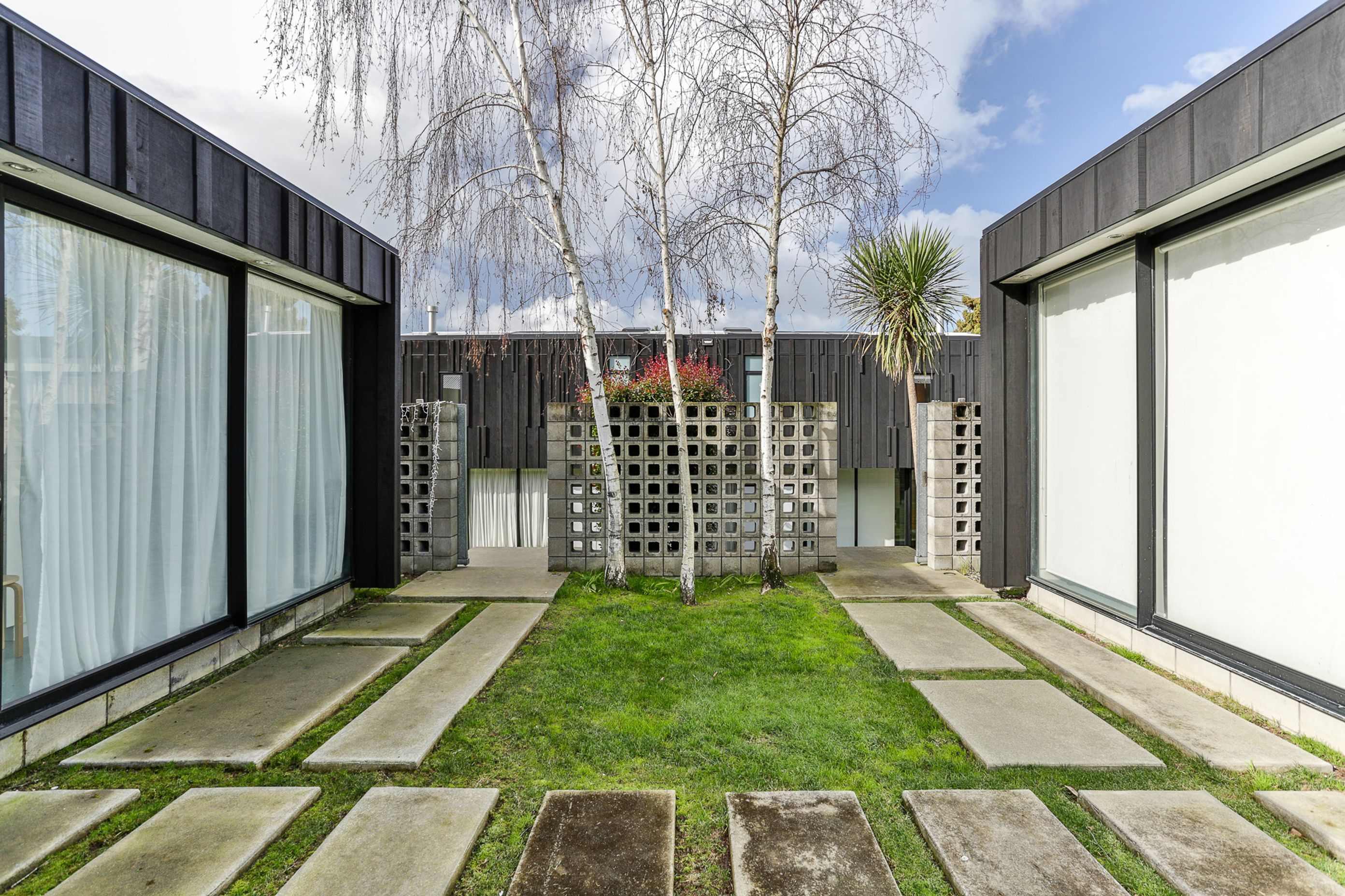 ArchiPro Project Summary - Award-winning multi-unit residential development featuring two townhouses designed for two families, incorporating a central courtyard, studio spaces, and thoughtful landscaping while preserving existing trees and respecting local zoning regulations.