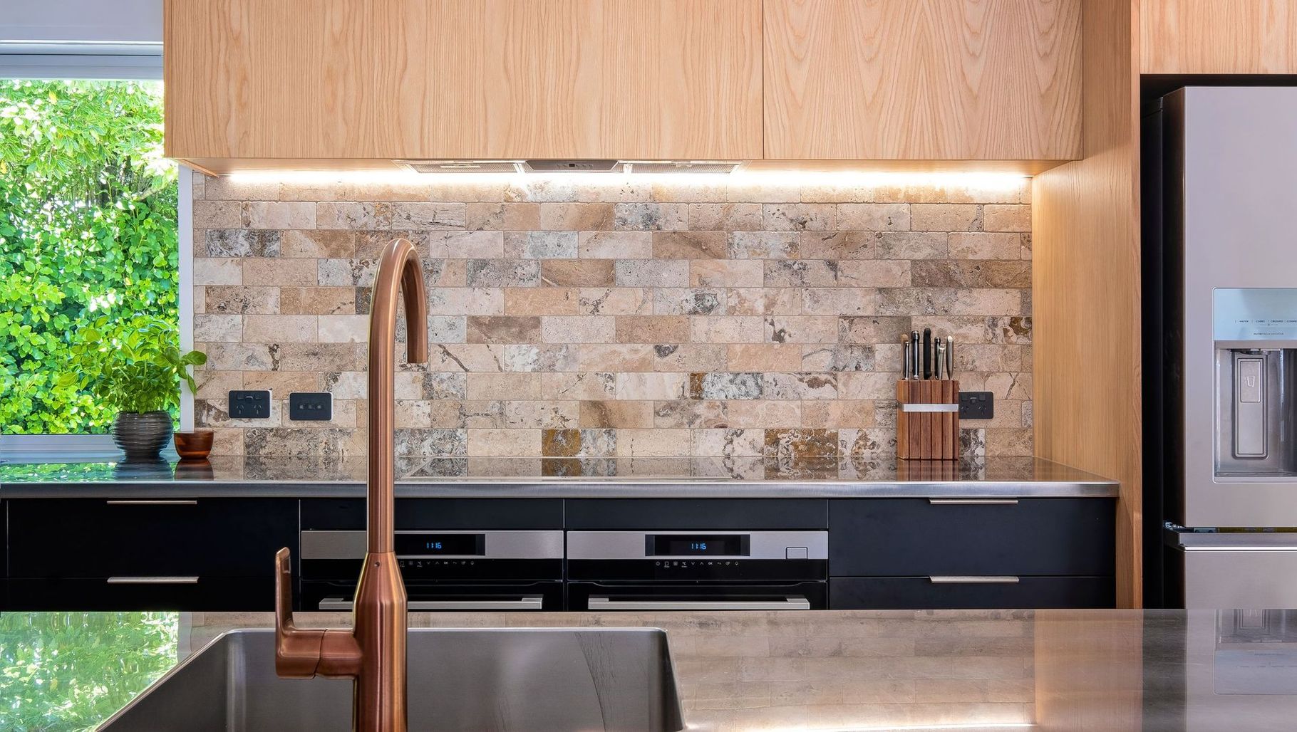 ArchiPro Project Summary - A modern kitchen design featuring a striking combination of oak veneer and pitch black acrylic, balancing functionality with contemporary aesthetics for a timeless appeal.