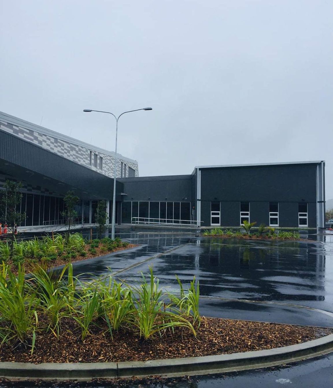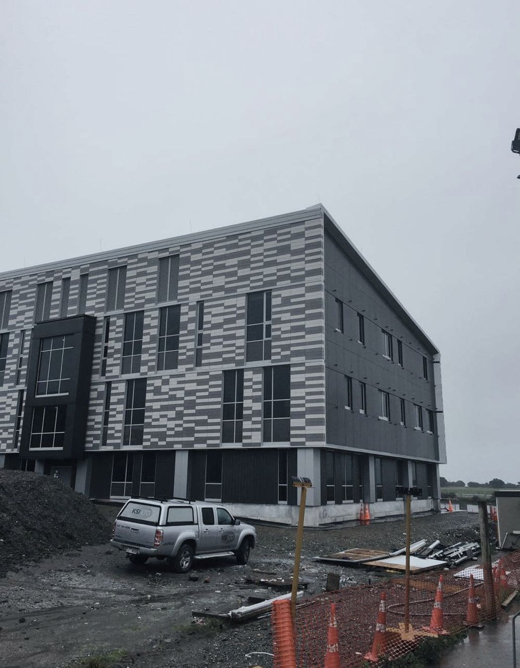 ArchiPro Project Summary - Greybase Hospital features K15 Kingspan Insulation over Vaproshield waterproofing, complemented by a rail and bracket system with Alpolic ACM or Maxclad Ceramic Tiles, along with custom window flashings and seismic inter-storey flashings by KSI Ltd.