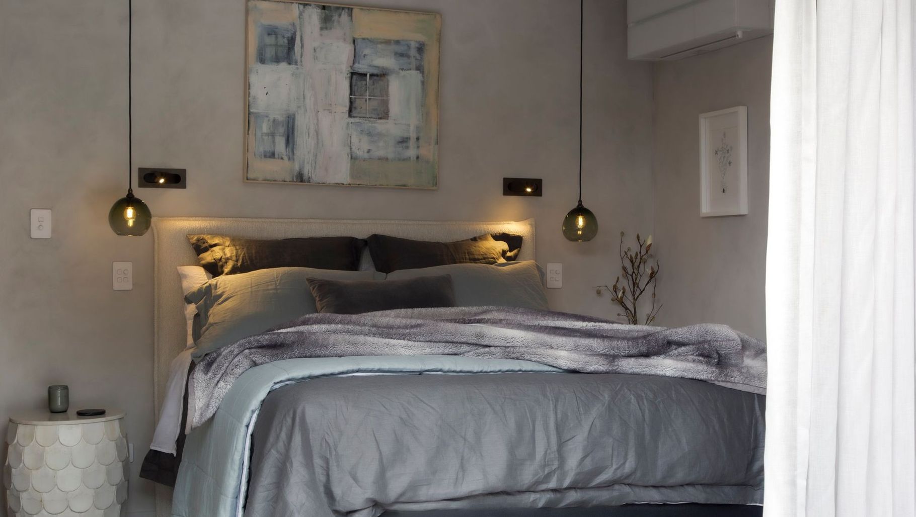 Monmouth dimmable pendants, paired with elegant pull-out reading lights, turn this bedroom into a haven of rest and relaxation. The carefully chosen linen bedding, custom wall art, and unique bedside tables create a warm ambiance throughout the space, sure to delight any guest.