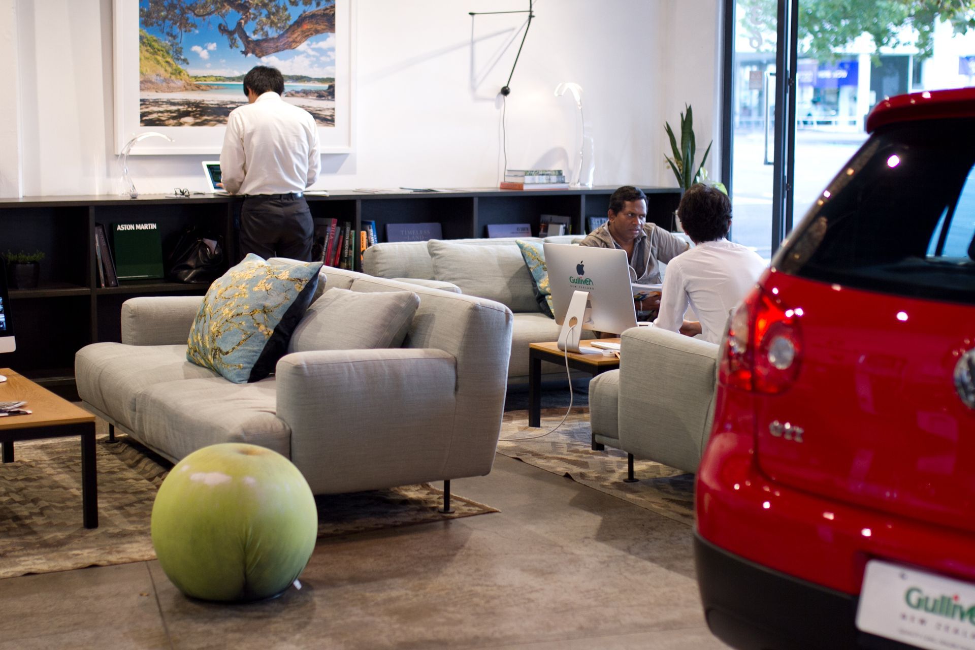 ArchiPro Project Summary - A sophisticated blend of locally made wool upholstered seating and cloud-styled lighting enhances the ambiance of Gulliver International's first New Zealand showroom, creating a welcoming finance area that complements the automotive display.