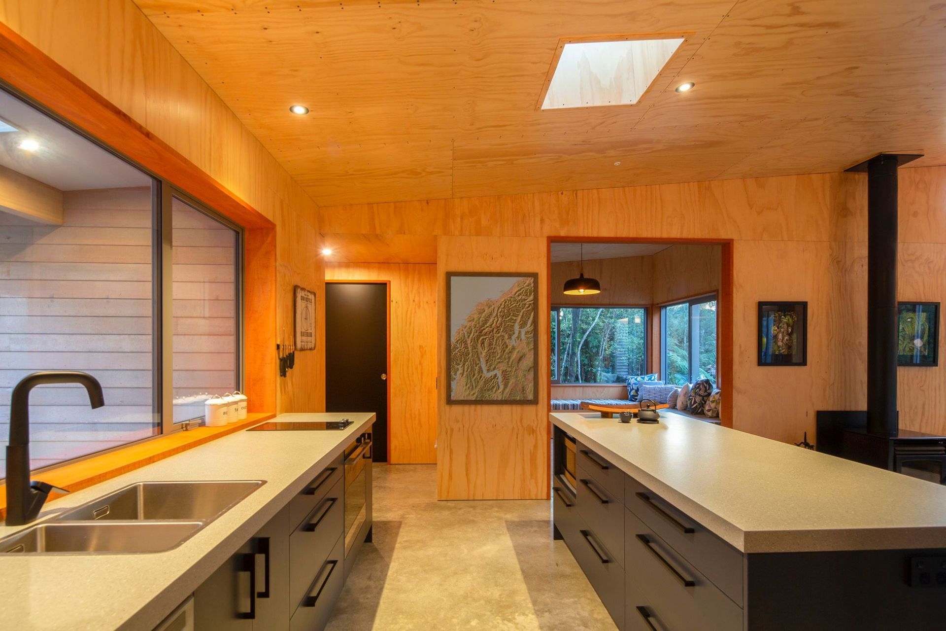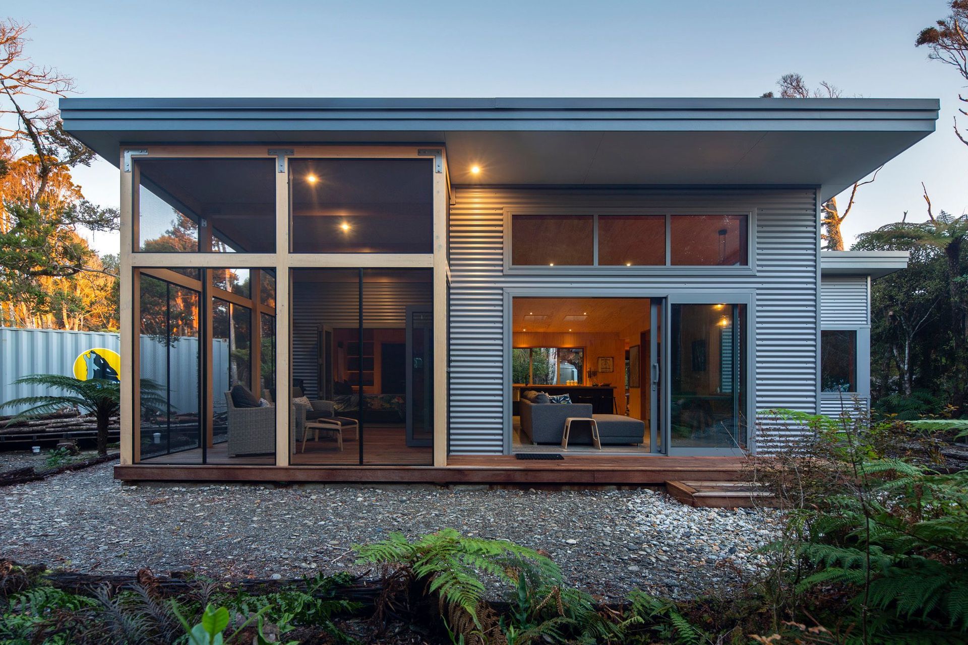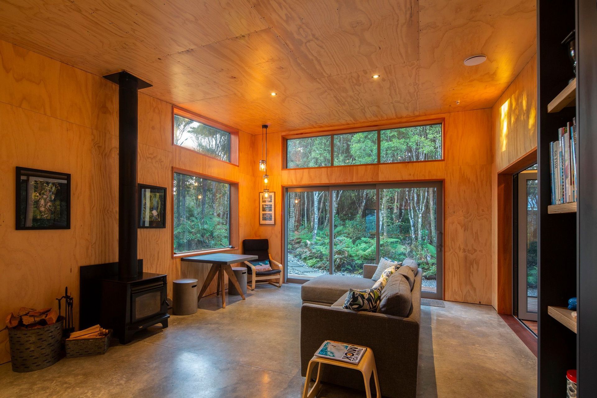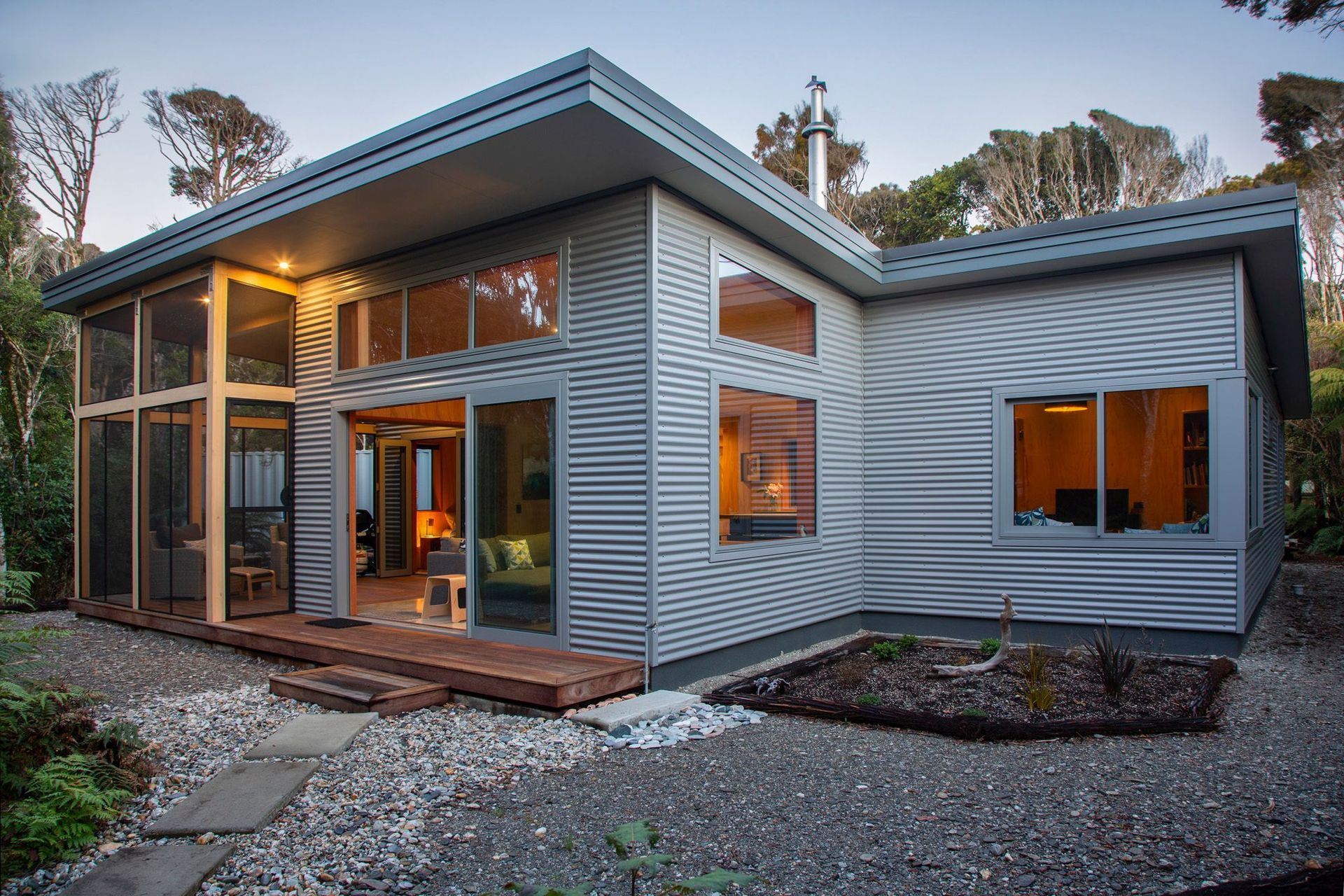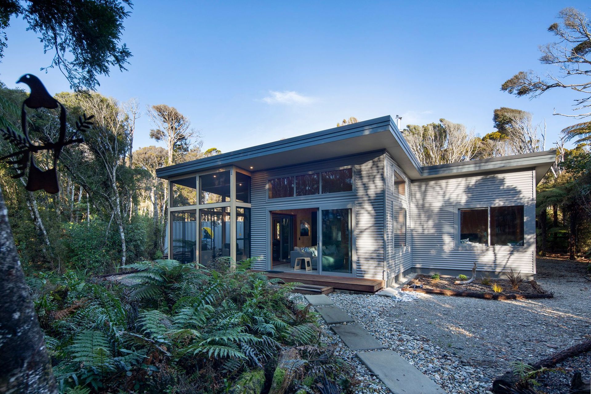 ArchiPro Project Summary - A challenging build in a stunning remote location, featuring a MAXRaft slab, SIP panel construction, double-glazed joinery, and a unique outdoor area, all harmoniously integrated into the breathtaking West Coast native bush.