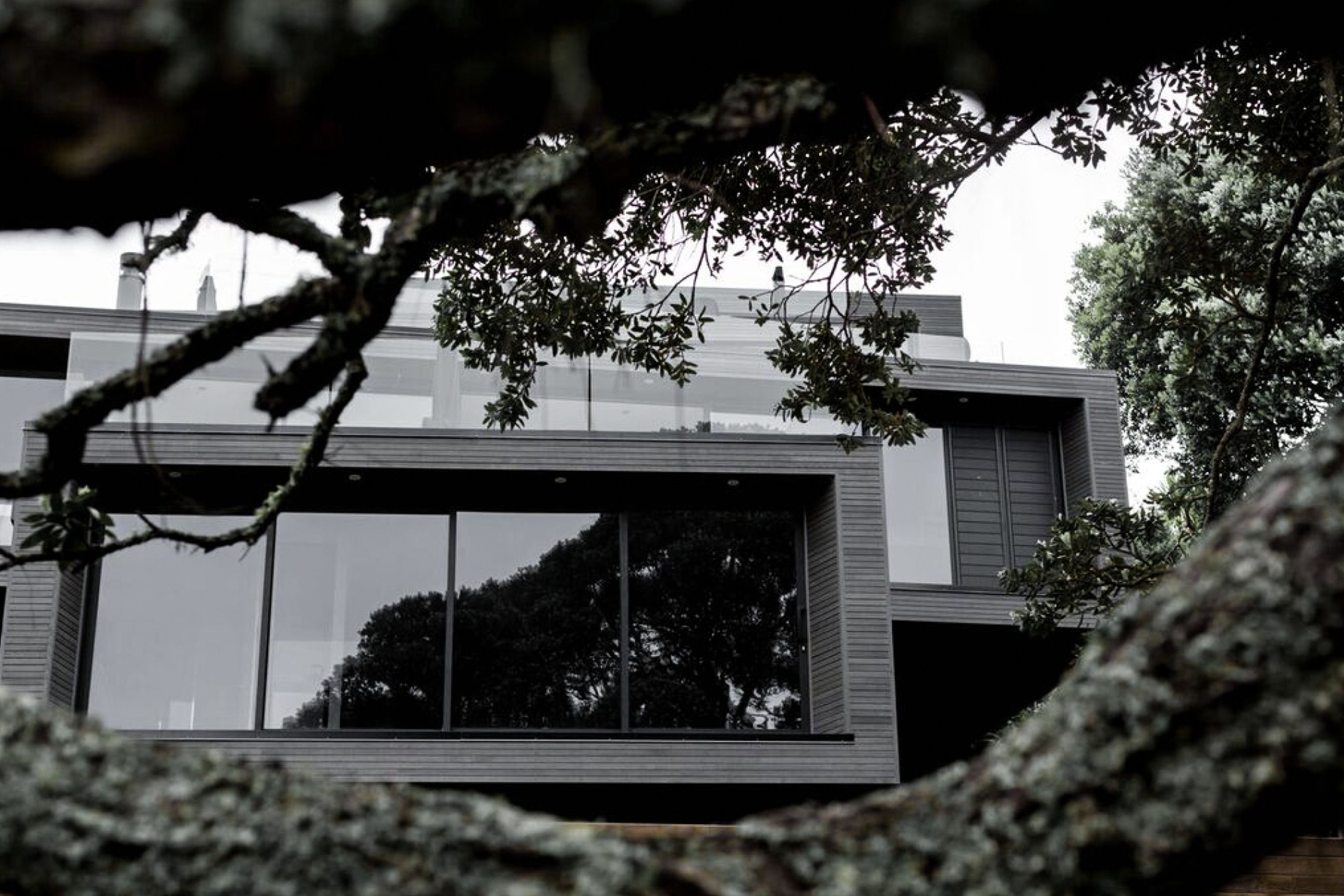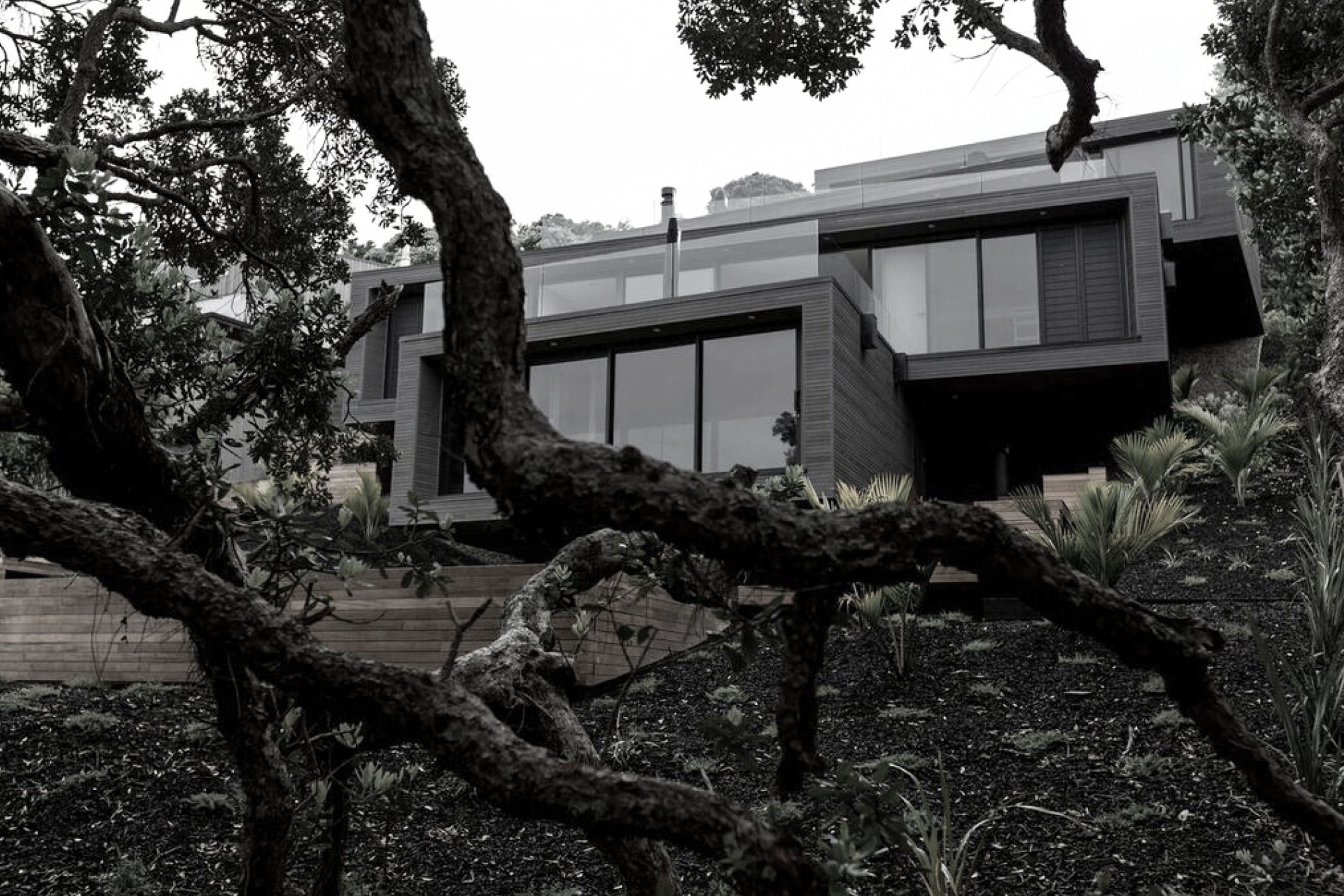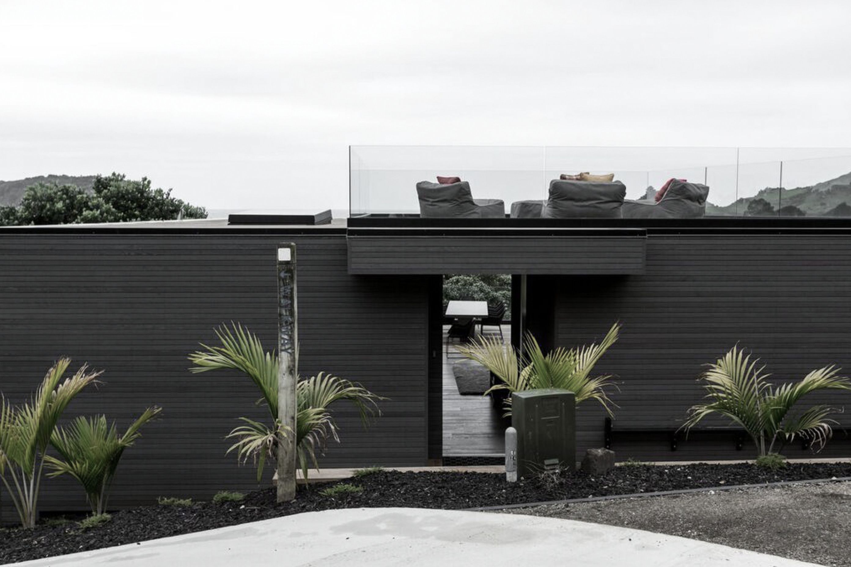 ArchiPro Project Summary - A stunning Hahei Beach House designed to enhance privacy and views, featuring floating roof structures and unique black finger-like foundations inspired by the ancient Pohutukawa tree on the property.
