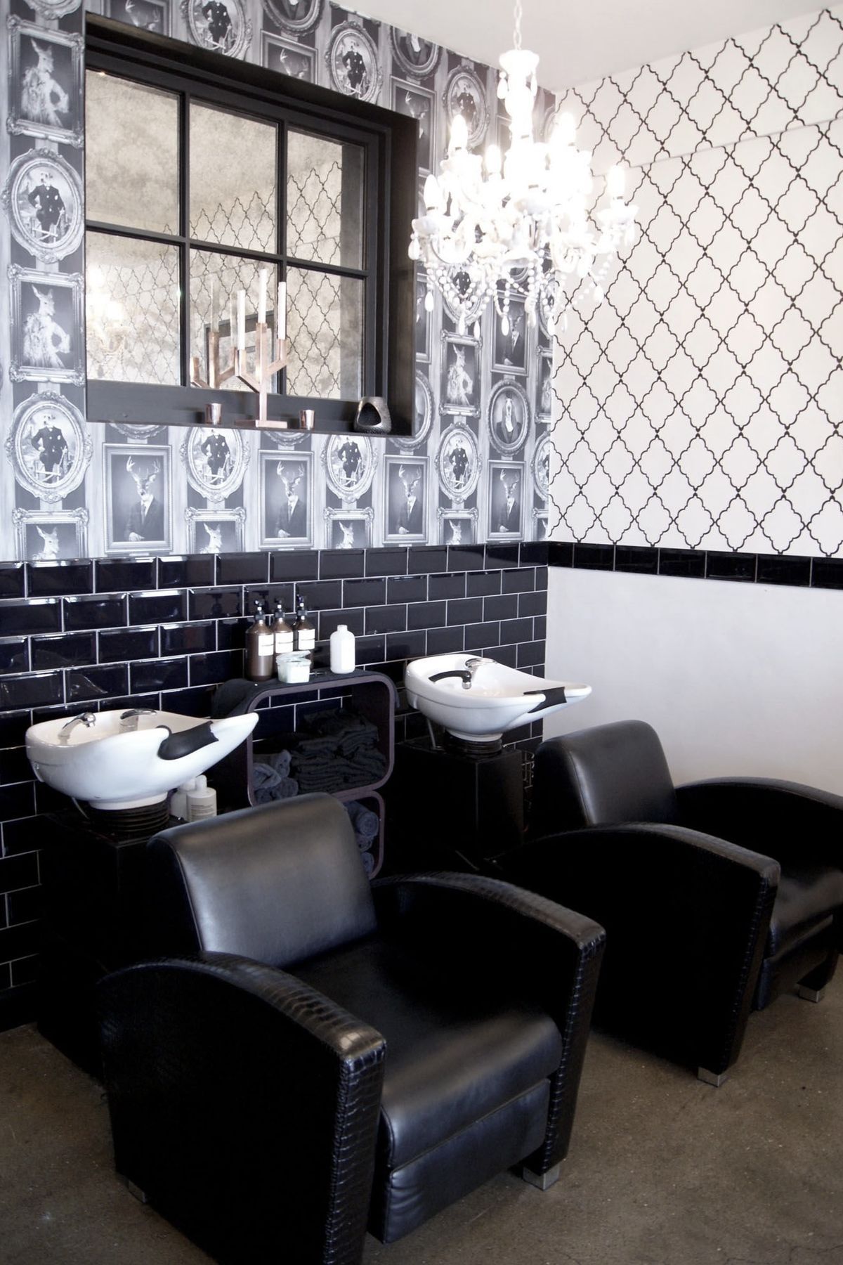 ArchiPro Project Summary - A vibrant hair salon transformation featuring high-impact wallpaper, glossy black tiles, and repurposed furnishings, creating a stylish backdrop for a unique art collection while incorporating playful elements like dog-themed wallpaper and elegant accents.