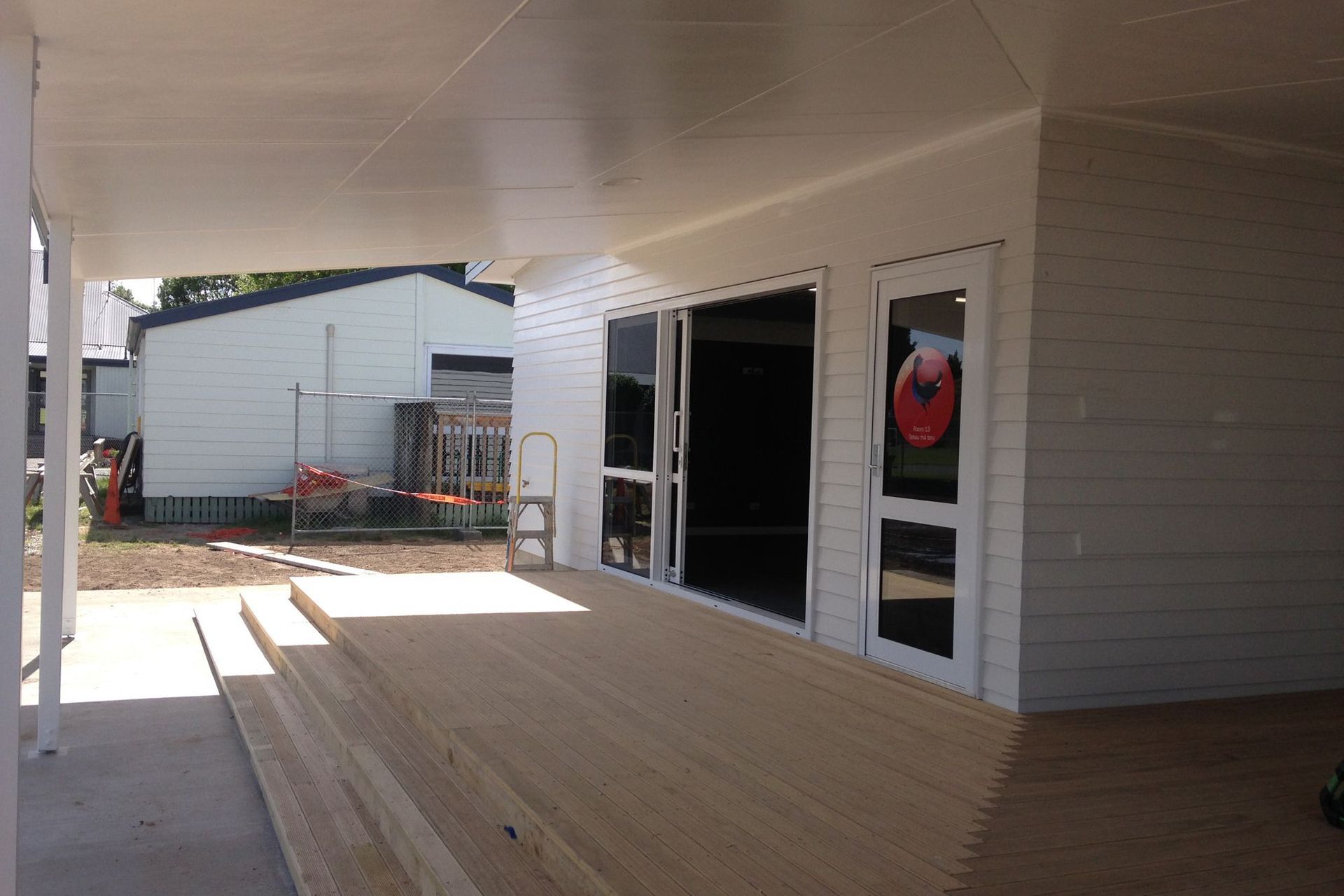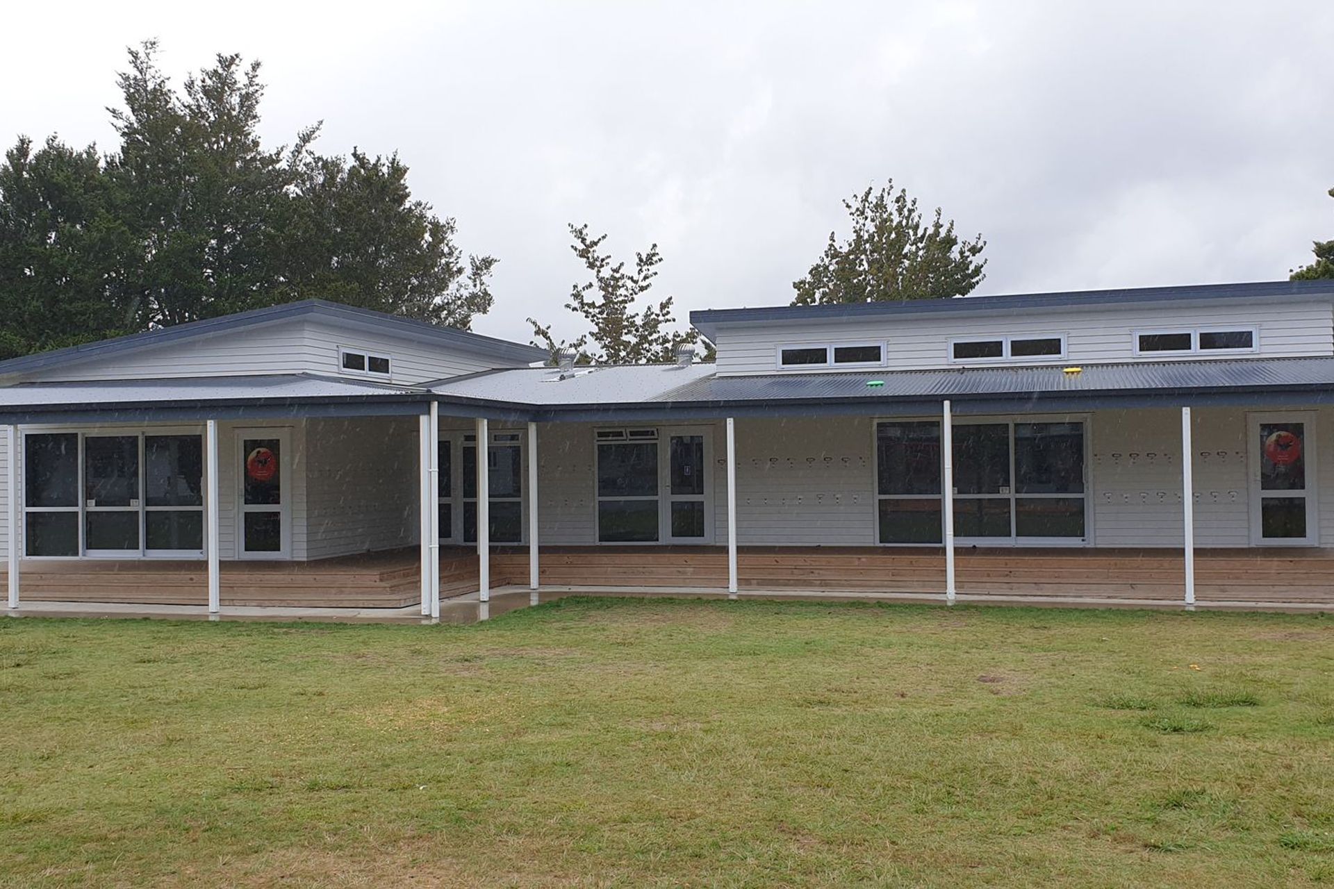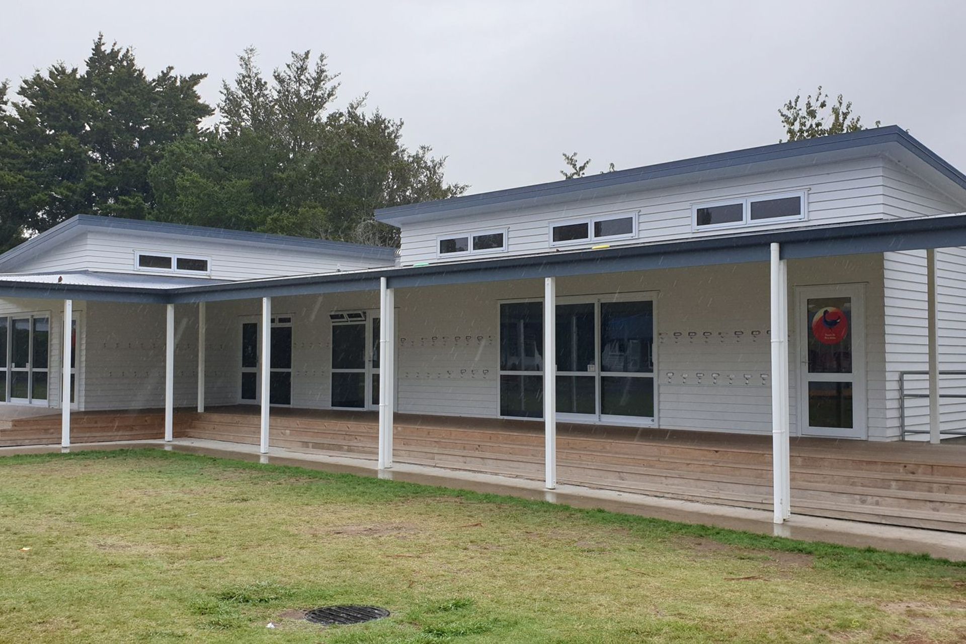 ArchiPro Project Summary - Construction of two new classrooms at Hamilton West School, featuring modern design elements and a large timber-framed veranda, completed in 2017 for the Ministry of Education with a project value of $469K.