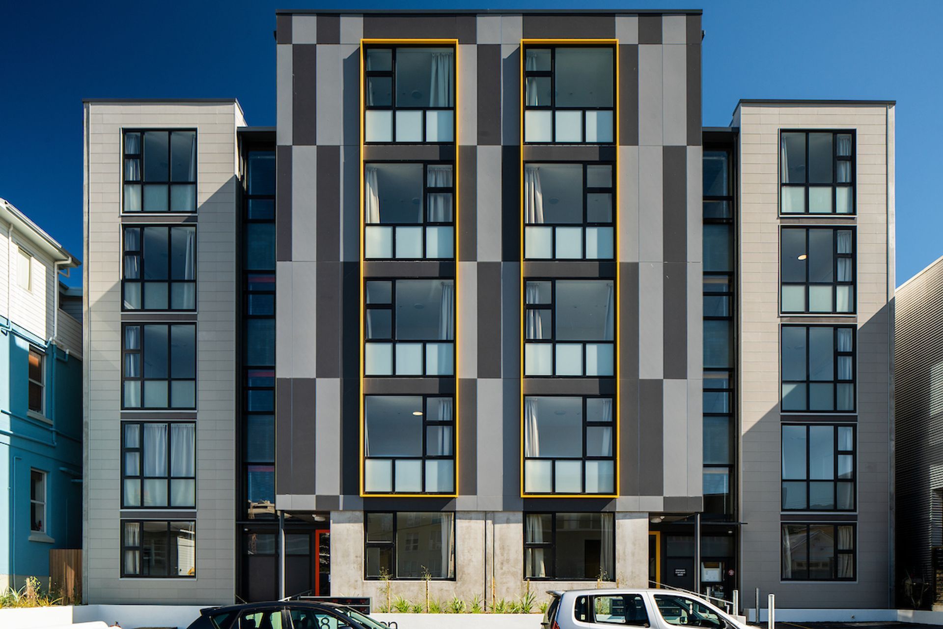 ArchiPro Project Summary - Five-storey social housing development in central Wellington featuring 20 thoughtfully designed one-bedroom apartments, a shared community room, and sunny outdoor decks, all while adhering to Housing New Zealand guidelines.