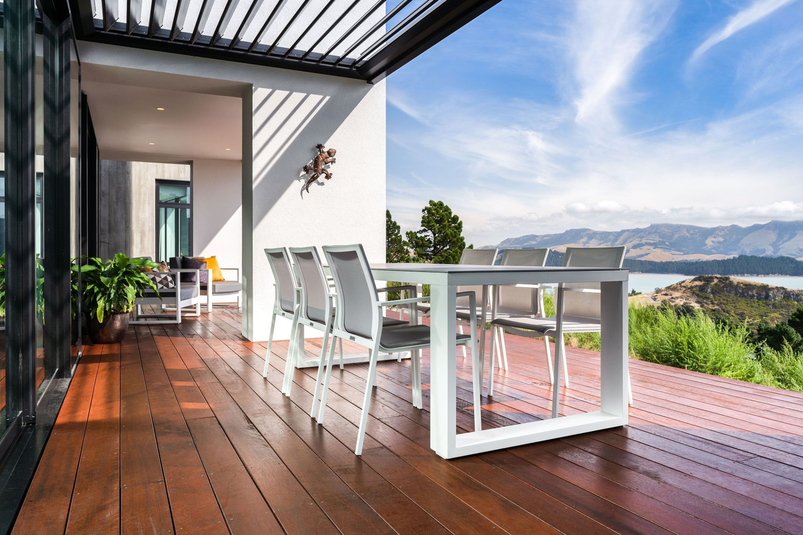 ArchiPro Project Summary - A contemporary family home designed to maximize panoramic views of Lyttleton Harbour, featuring a series of light, glass-filled structures with durable tilt panel walls, concrete floors, and steel framing, all wrapped in a solid AAC panel finish.