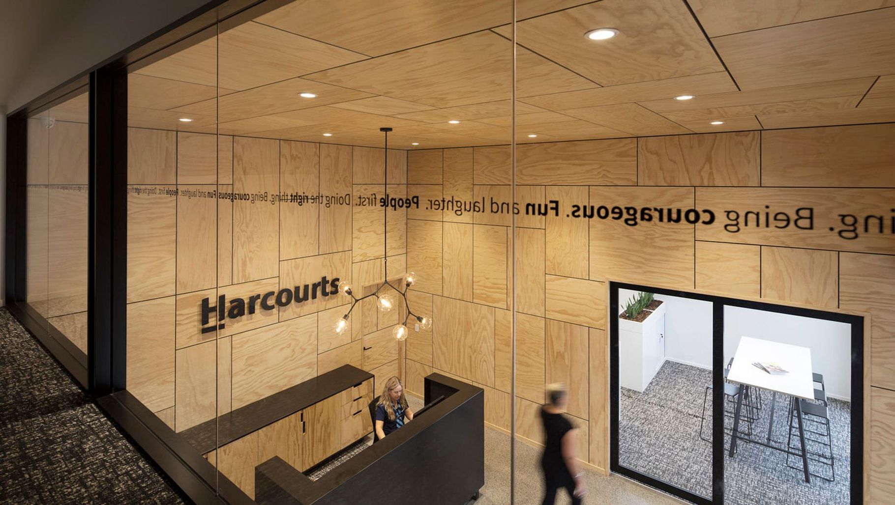 ArchiPro Project Summary - Transformation of an old warehouse into a vibrant office and multi-purpose public space for Harcourts Opotiki, featuring custom cabinetry and stunning finishes by Bubble Interiors, completed in 2018.