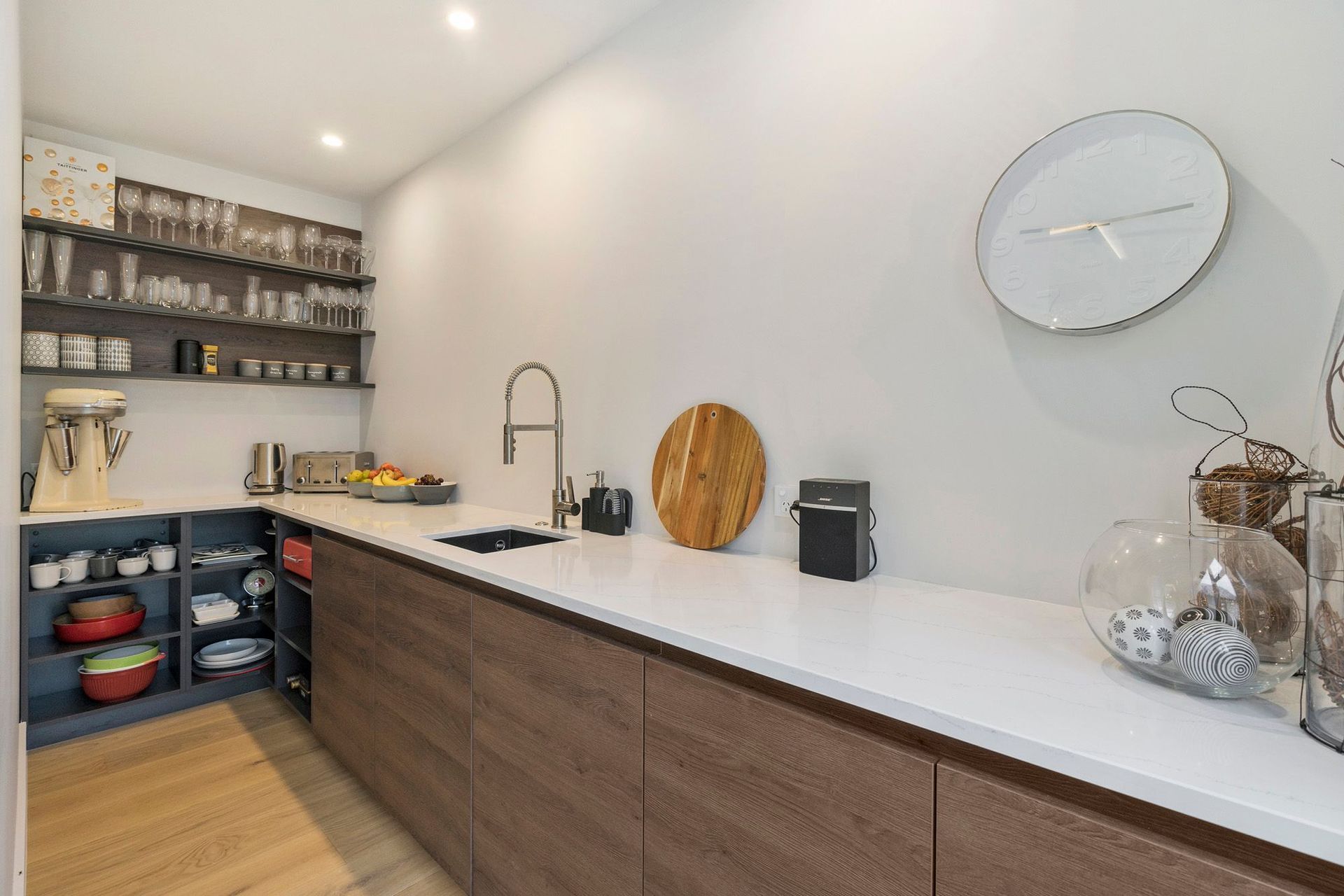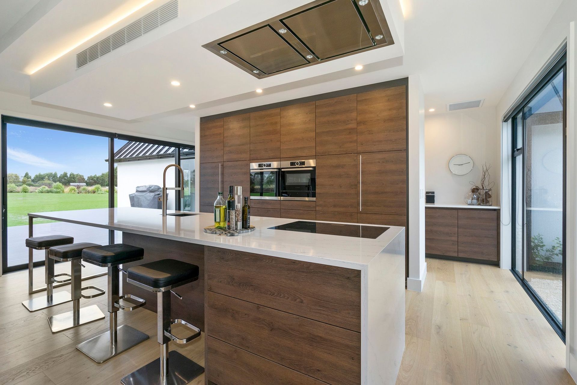 In the kitchen, the cabinetry was brought in from Germany as the couple wanted the look of natural wood with the durability of a laminate material. The benchtop is an engineered stone with the island designed for entertaining, and the sink and hob facing out into the living space. This presented the challenge of how to deal with the extraction ducting, which was solved by constructing the bulkhead above.