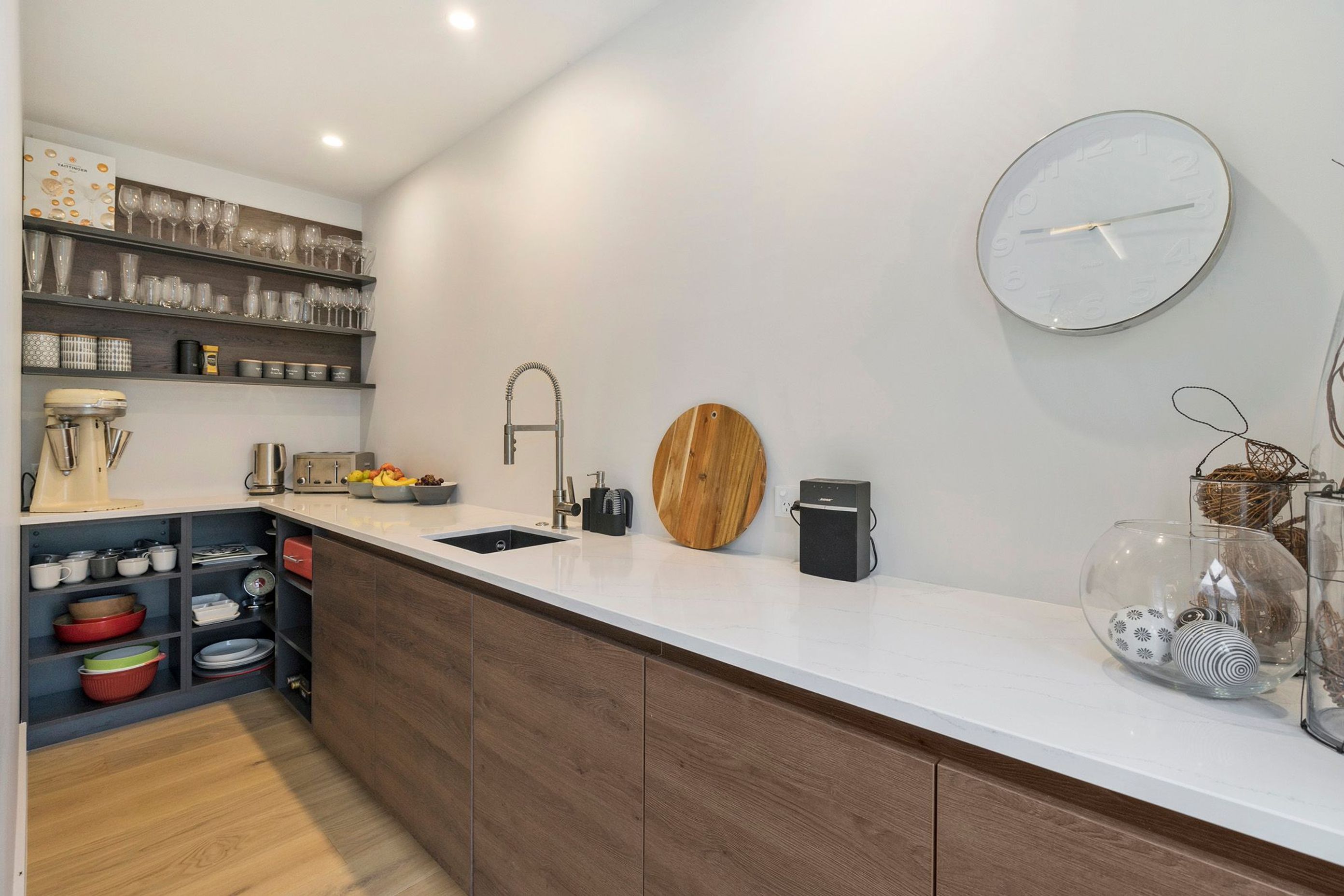 Leo and his team were always on the lookout for ways to improve on the finished result and took a problem-solving approach to making decisions in consultation with Kyle and Rebekah. At one point, when the doors from the kitchen out to the deck were already framed up, Leo stood in the kitchen and realised that where they ended was going to block the view. “It would have been a missed opportunity,” says Kyle. “So he called me and I came to site and we made the decision then and there to change it. Leo would never call with a problem, he would always have some possible solutions ready to go.”