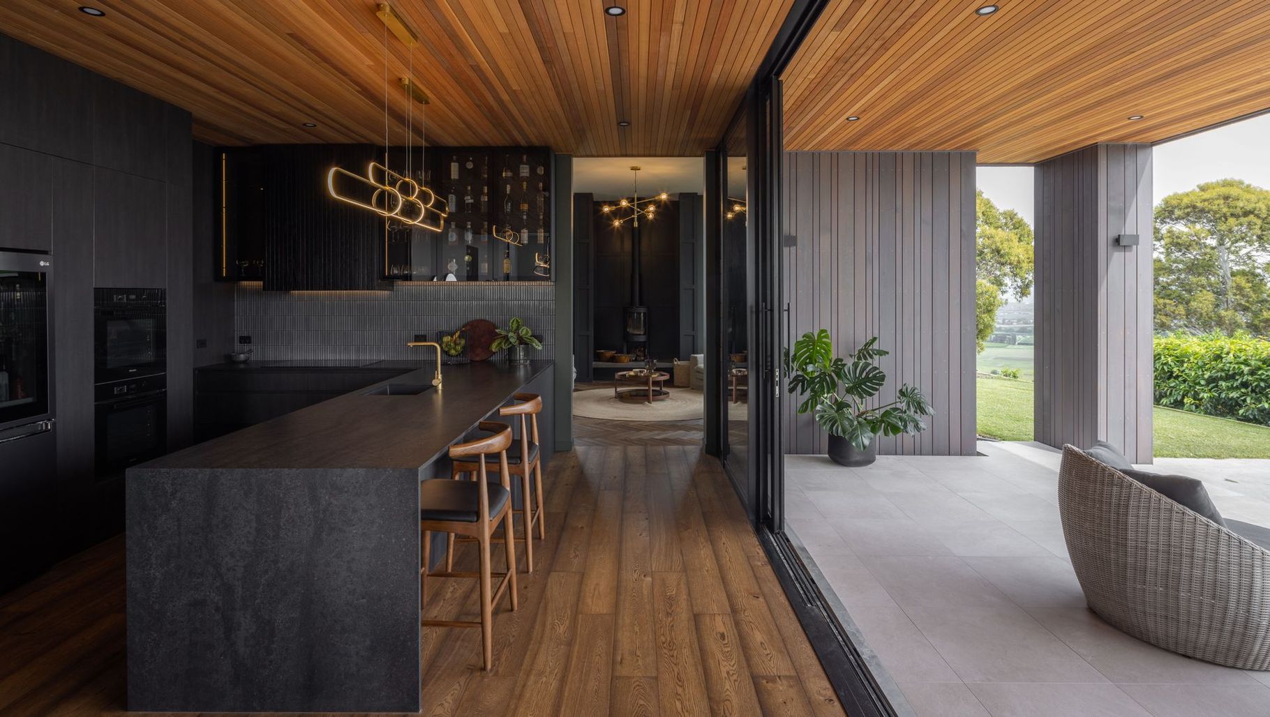 ArchiPro Project Summary - A contemporary masterpiece in Havelock Hills, featuring stunning cedar cladding and Te Kuiti limestone, designed to harmonize with the landscape while offering breathtaking views of Hawke's Bay and Te Mata Peak.