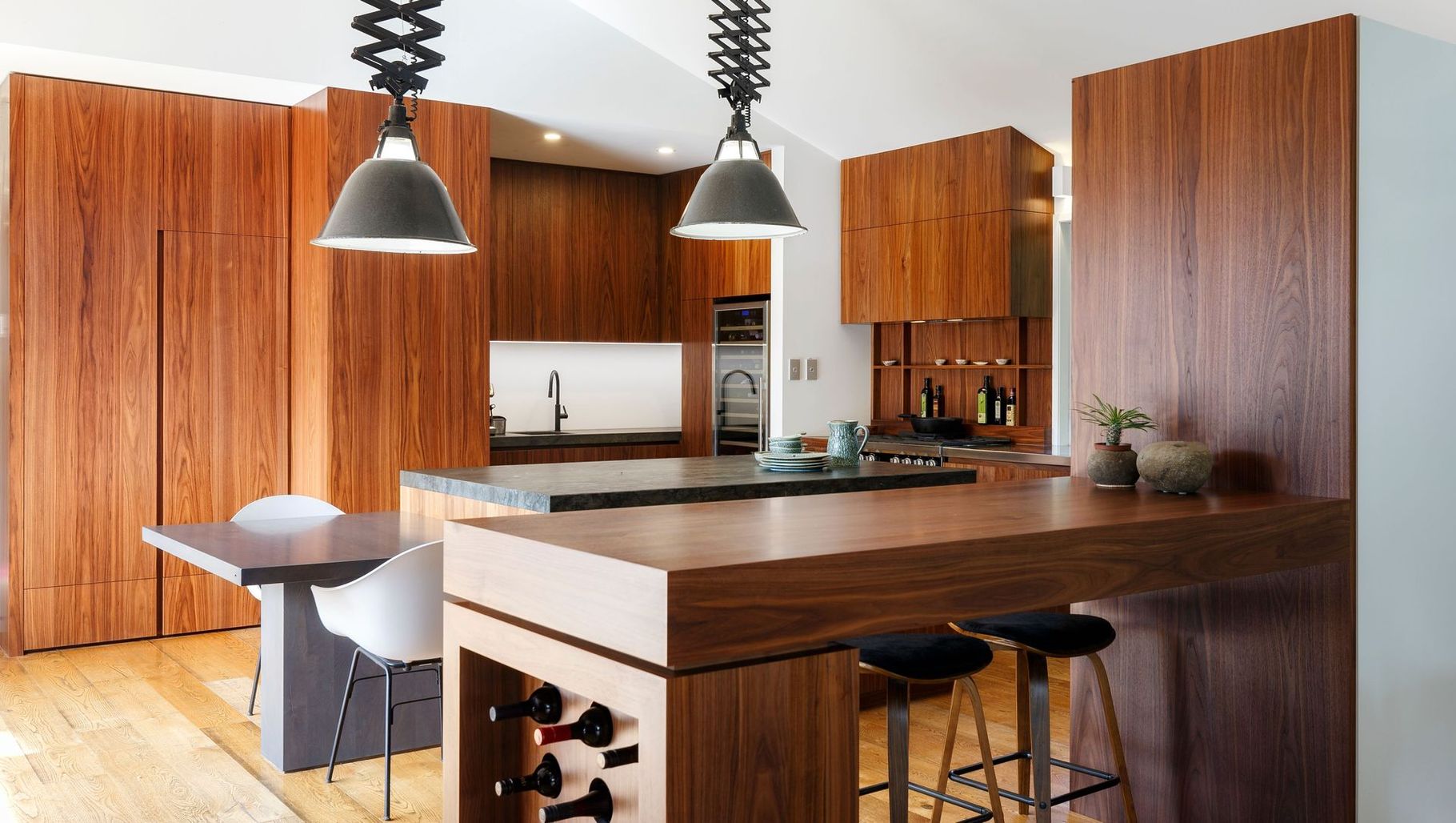 ArchiPro Project Summary - A harmonious blend of rich walnut and modern design elements, Hawks Ridge House showcases a thoughtfully crafted interior that balances functionality and elegance, featuring a bespoke kitchen and cohesive storage solutions throughout.