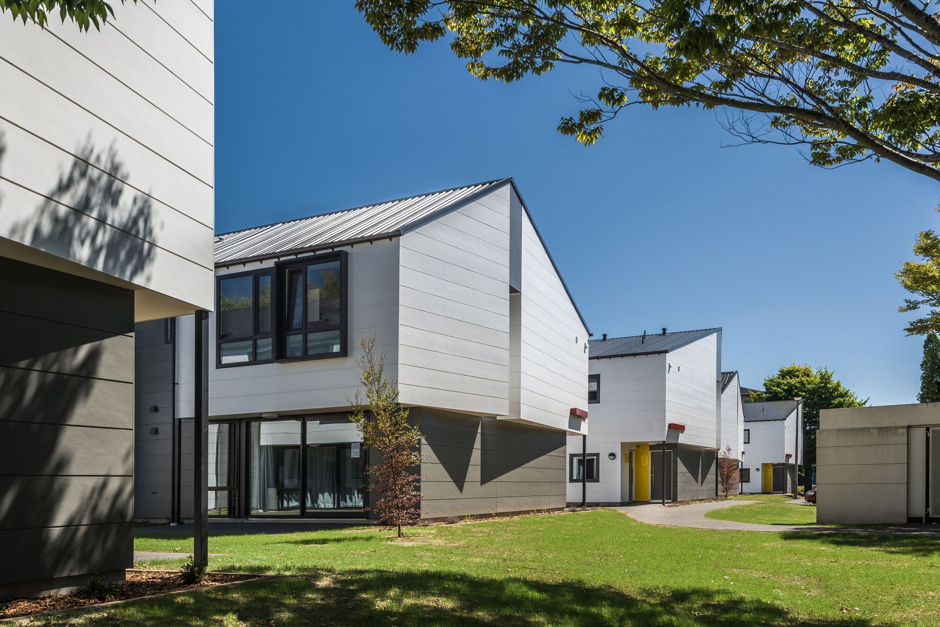 ArchiPro Project Summary - Innovative student accommodation featuring sunlit units with private outdoor spaces, integrated into a park-like setting with communal green areas and thoughtfully designed accessways.