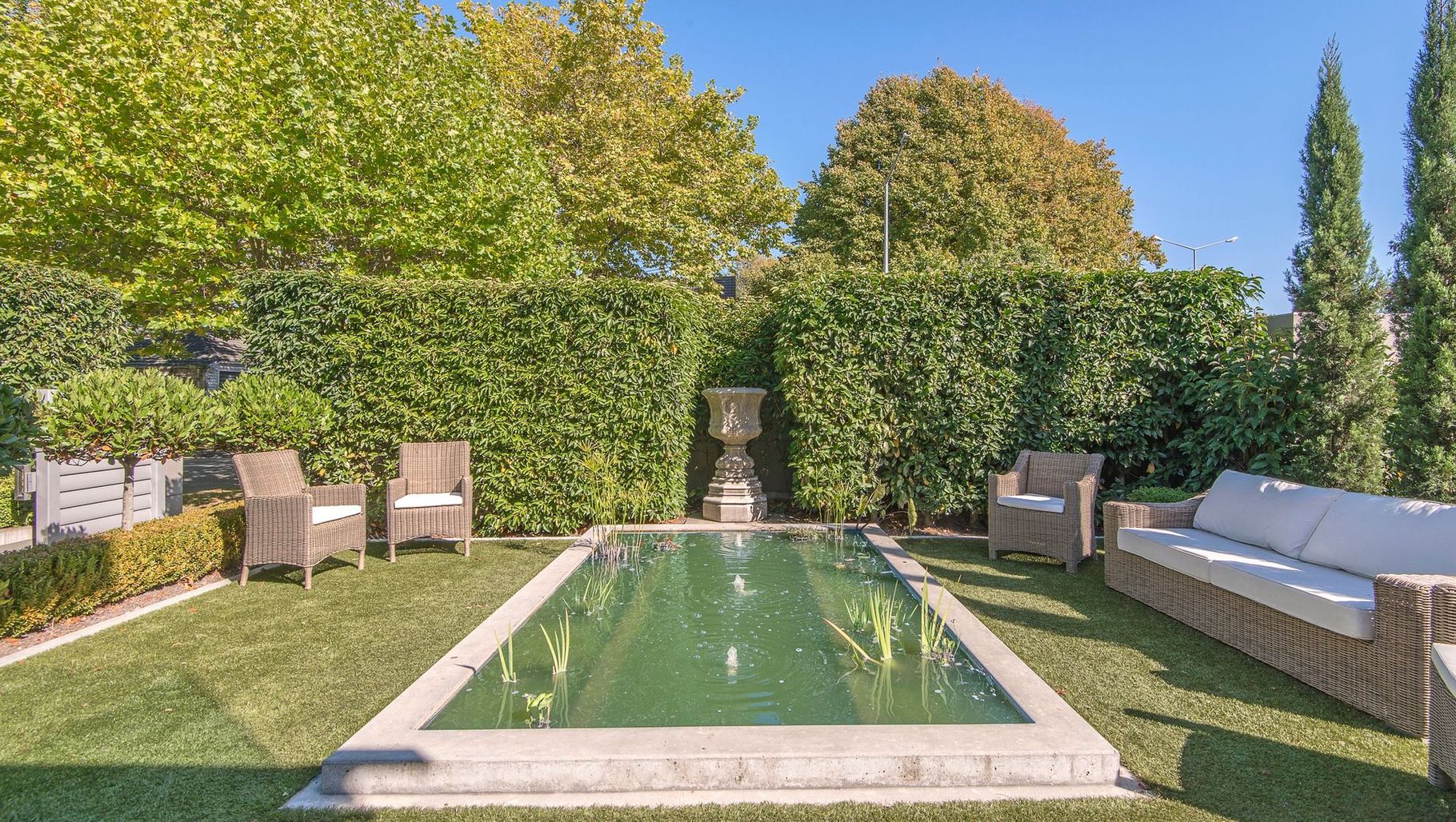 ArchiPro Project Summary - Revitalized garden design featuring limestone tiles, extended courtyards, and a central pond with bubble fountains, complemented by low-maintenance artificial lawn for a serene outdoor seating area.
