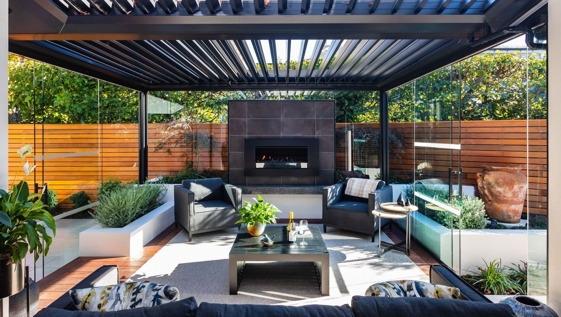 ArchiPro Project Summary - A modern residential renovation in Merivale, Christchurch, featuring a cozy outdoor courtyard with a retractable louvre roof, designed for seamless indoor-outdoor living and low maintenance, completed in 2021.