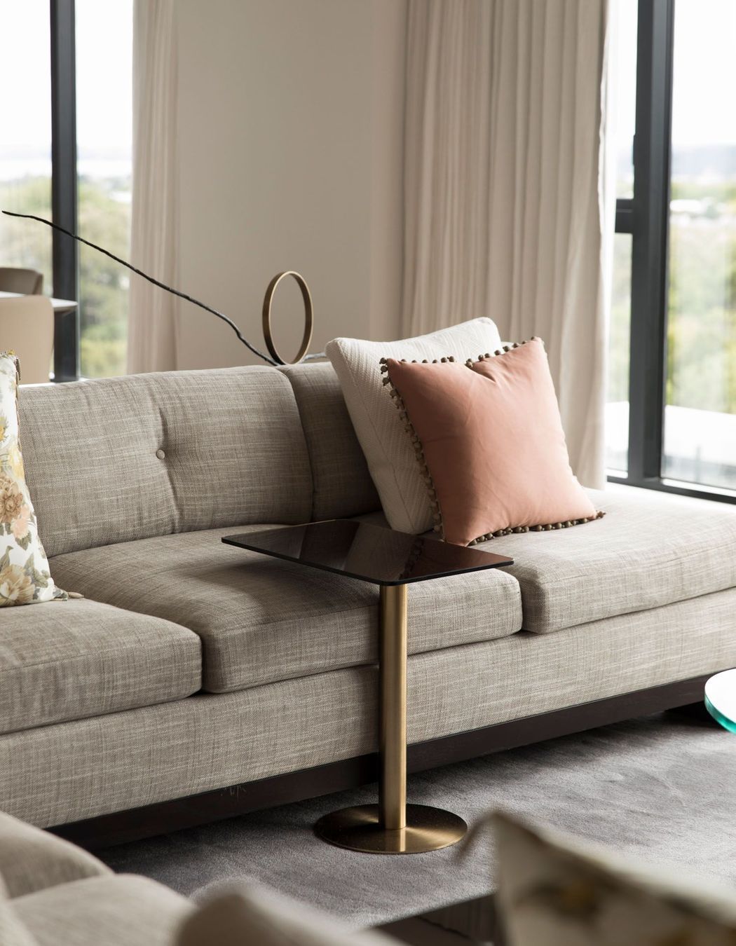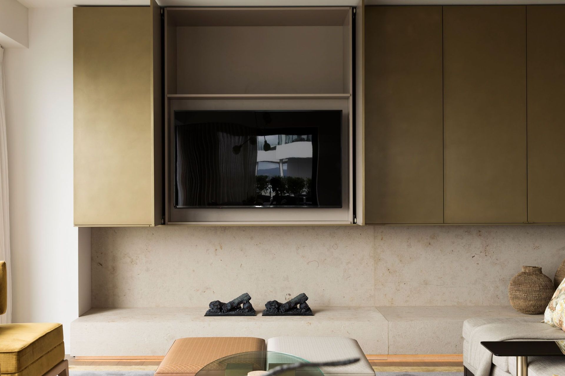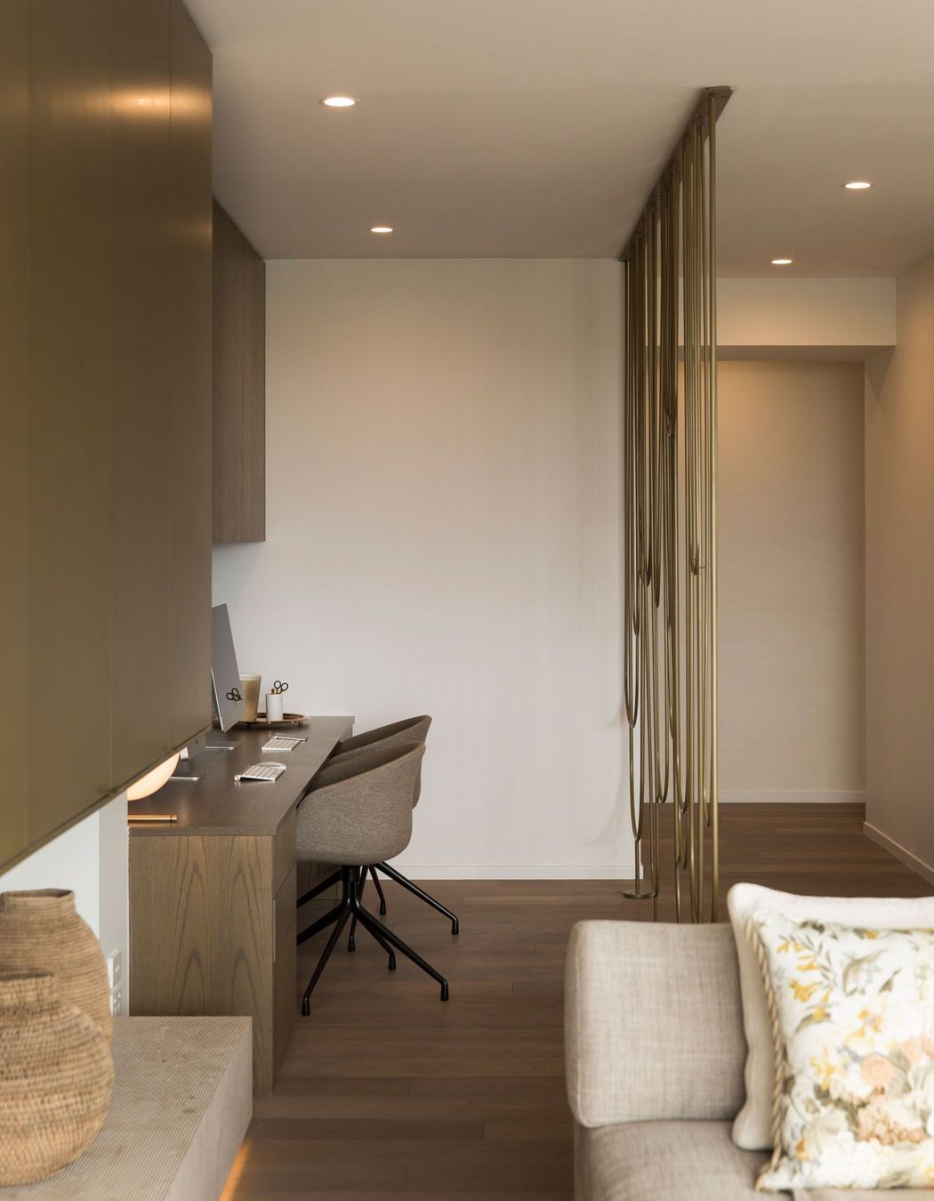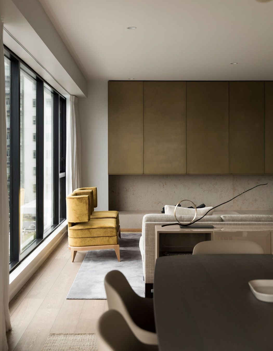 ArchiPro Project Summary - A serene Auckland apartment featuring stunning harbour views, designed by Hare Interiors with a calming palette, textured stones, and a custom brass Art Deco-inspired screen that elegantly separates the study from the living area.