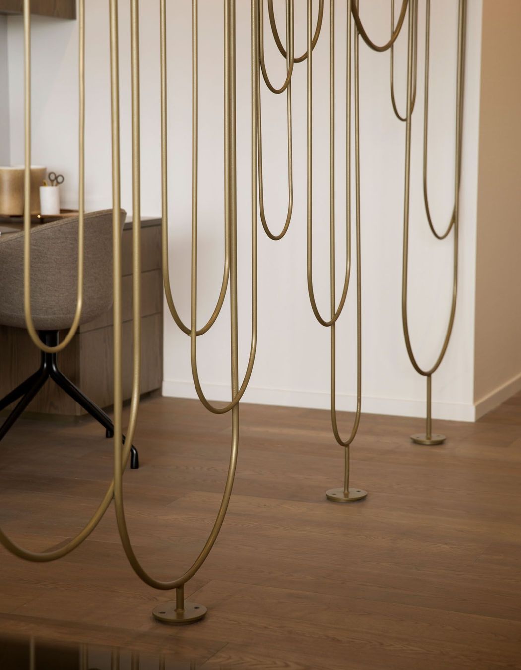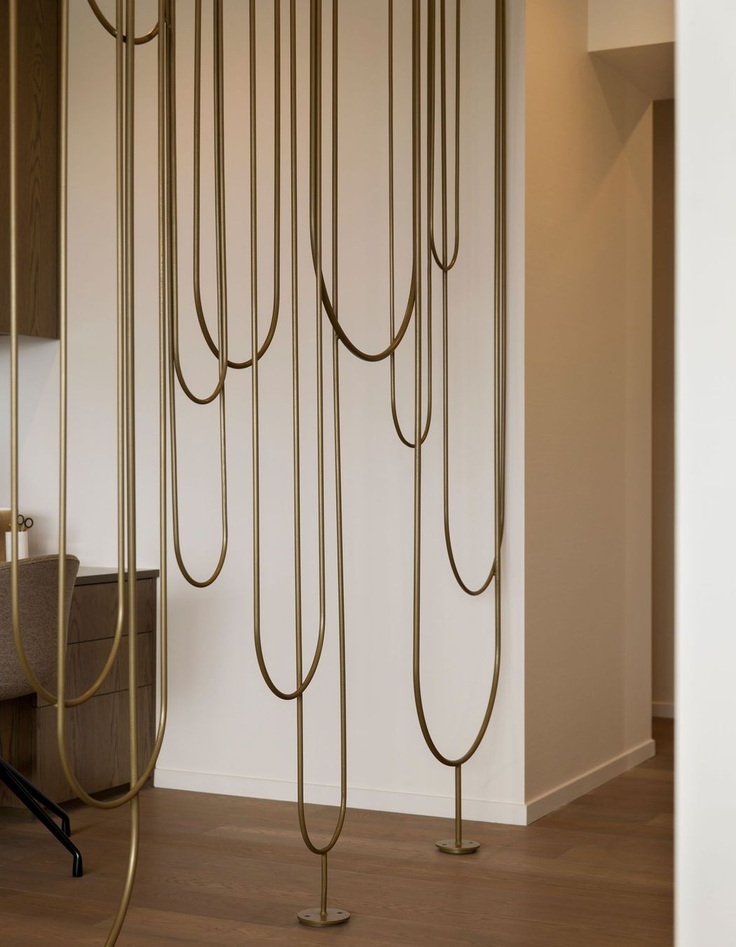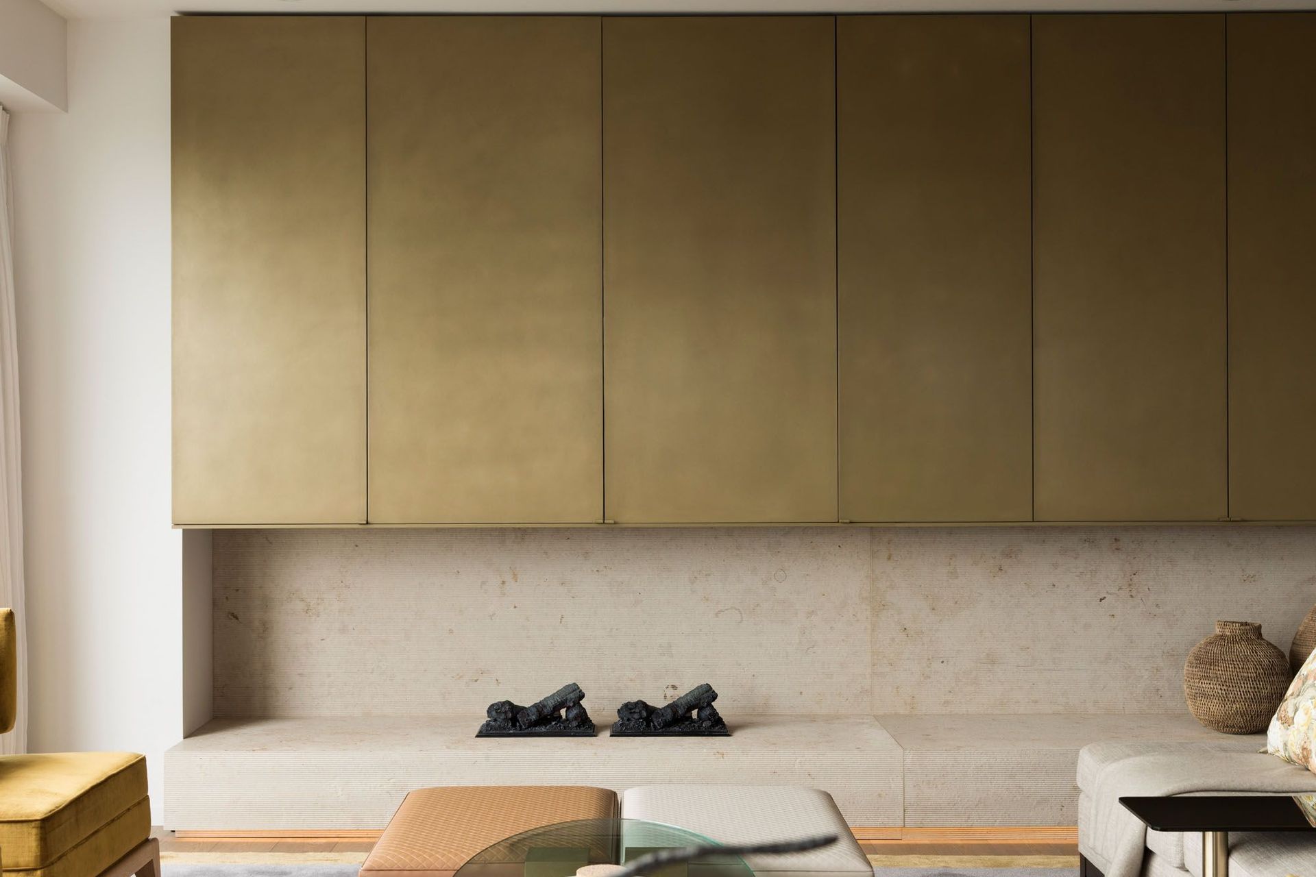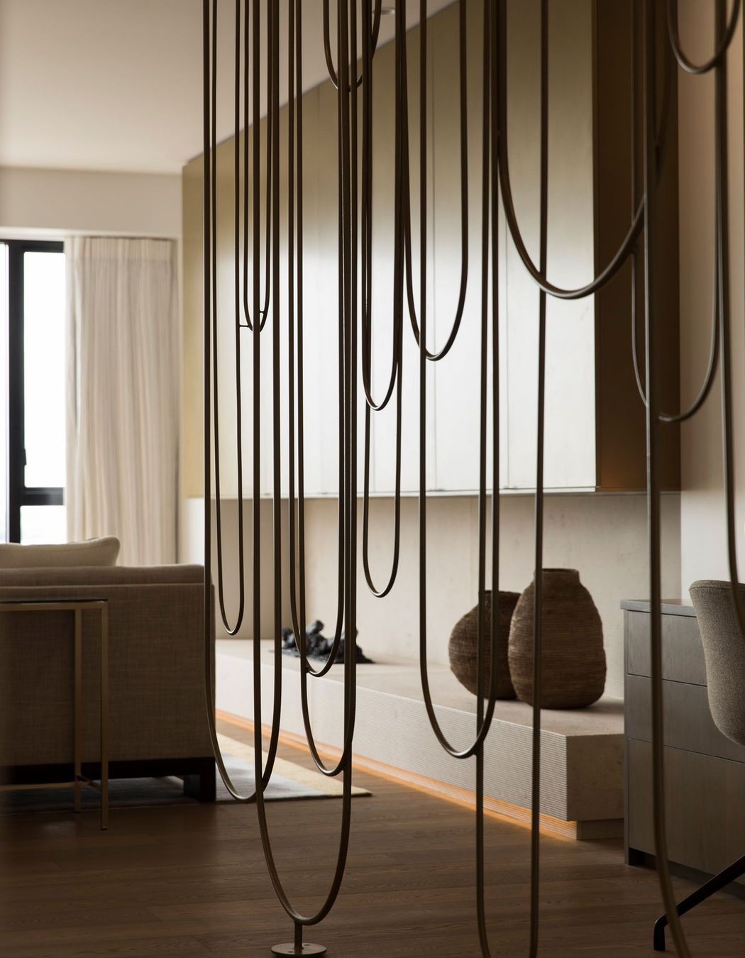ArchiPro Project Summary - A serene Auckland apartment featuring stunning harbour views, designed by Hare Interiors with a calming palette, textured stones, and a custom brass Art Deco-inspired screen that elegantly separates the study from the living area.