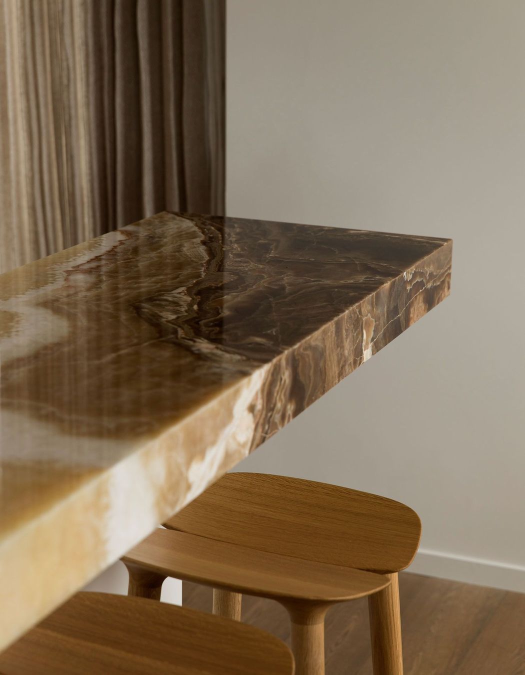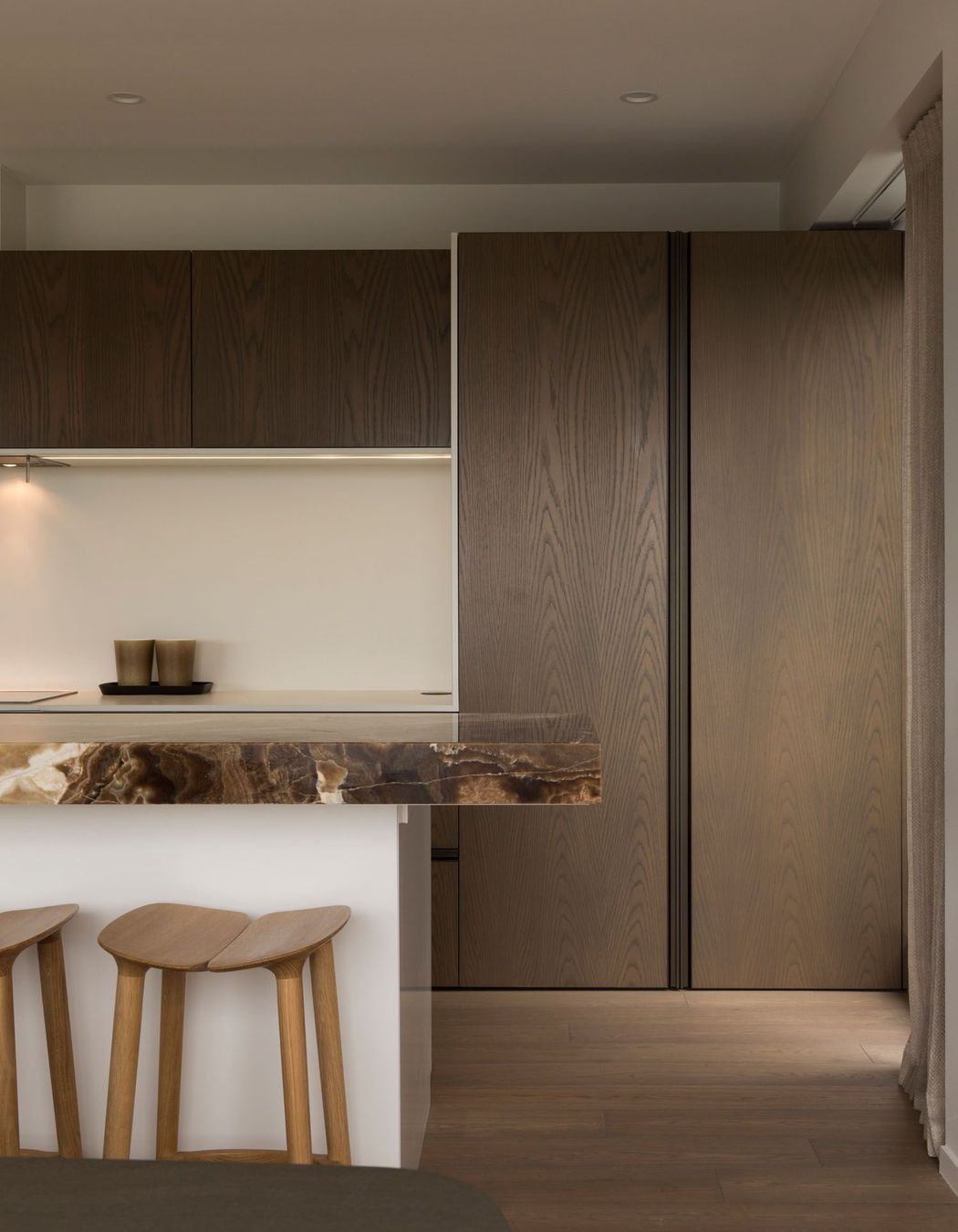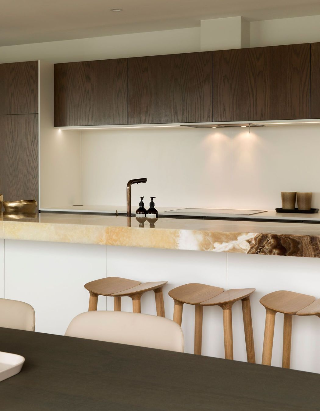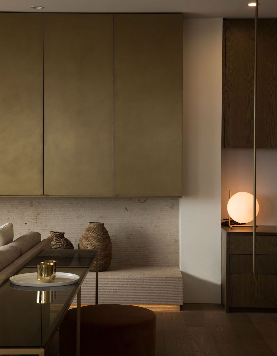 ArchiPro Project Summary - A serene Auckland apartment featuring stunning harbour views, designed by Hare Interiors with a calming palette, textured stones, and a custom brass Art Deco-inspired screen that elegantly separates the study from the living area.