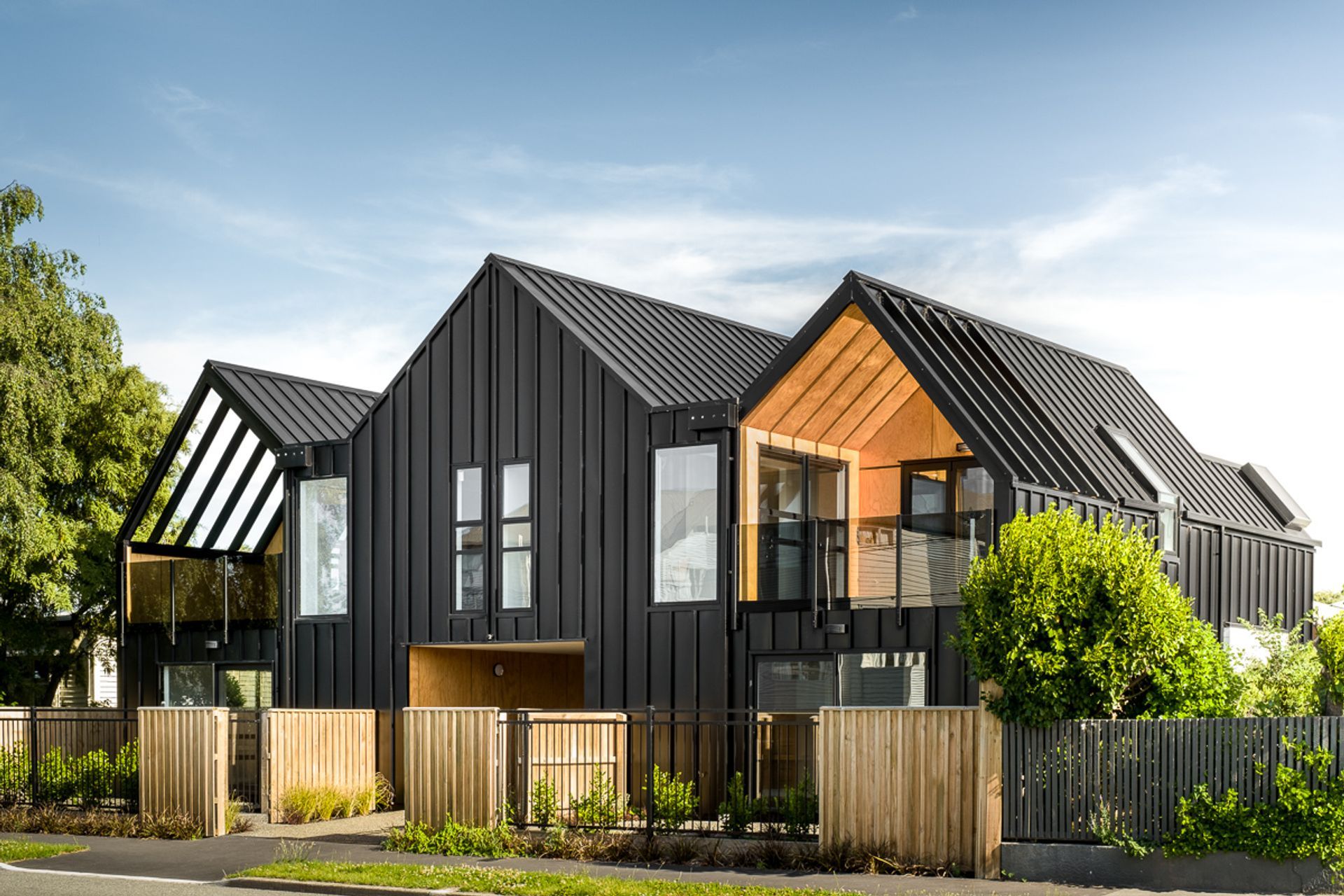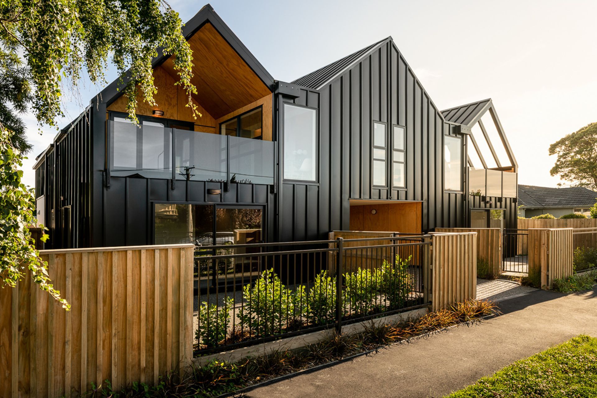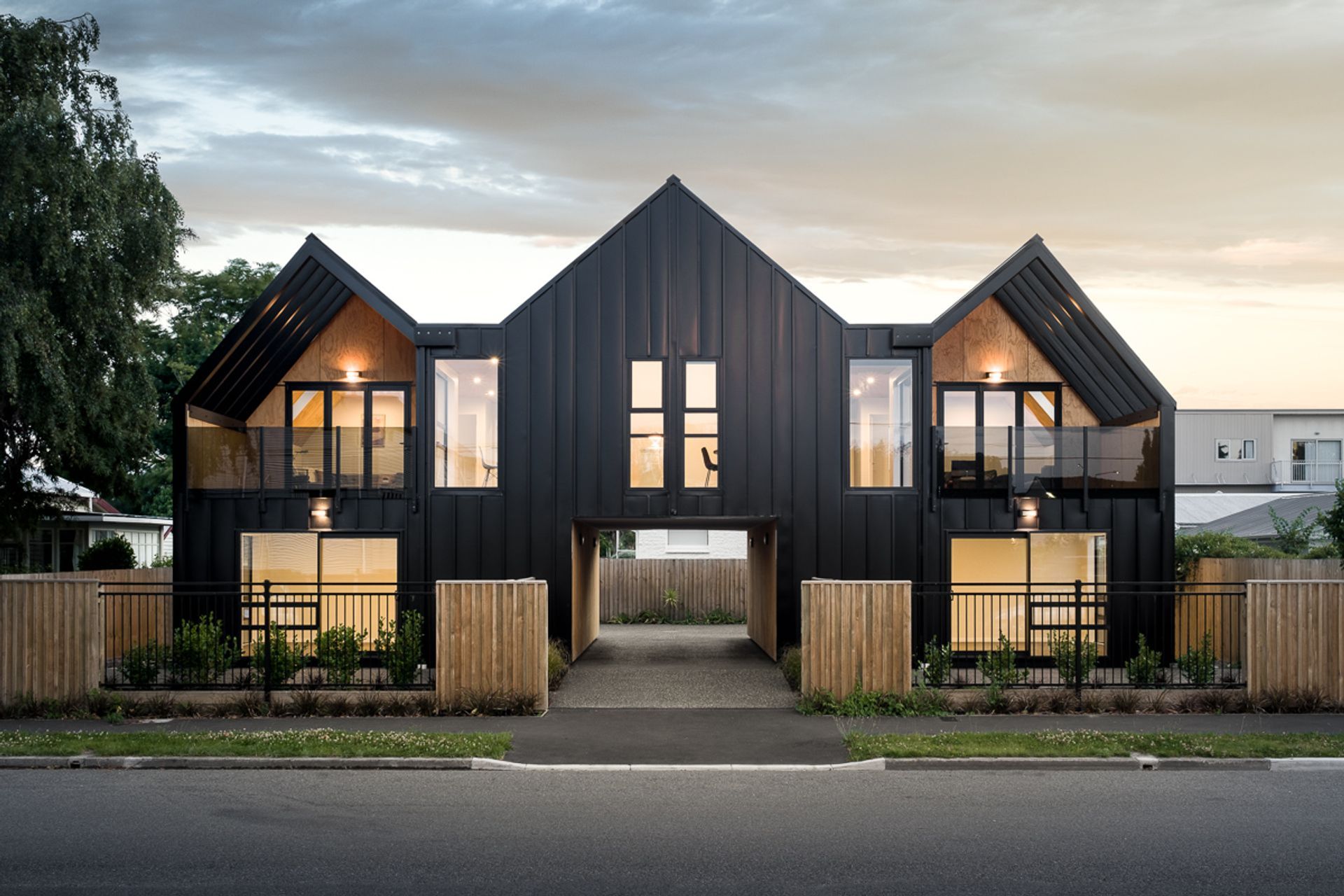 ArchiPro Project Summary - Innovative four-apartment development on a compact inner-city site, featuring a residential façade with gable forms, north-facing courtyards and balconies, and inspired by European loft aesthetics, constructed with lightweight timber and clad in black steel and plywood.