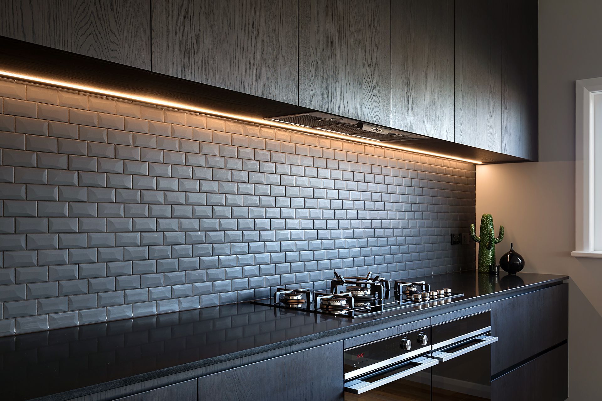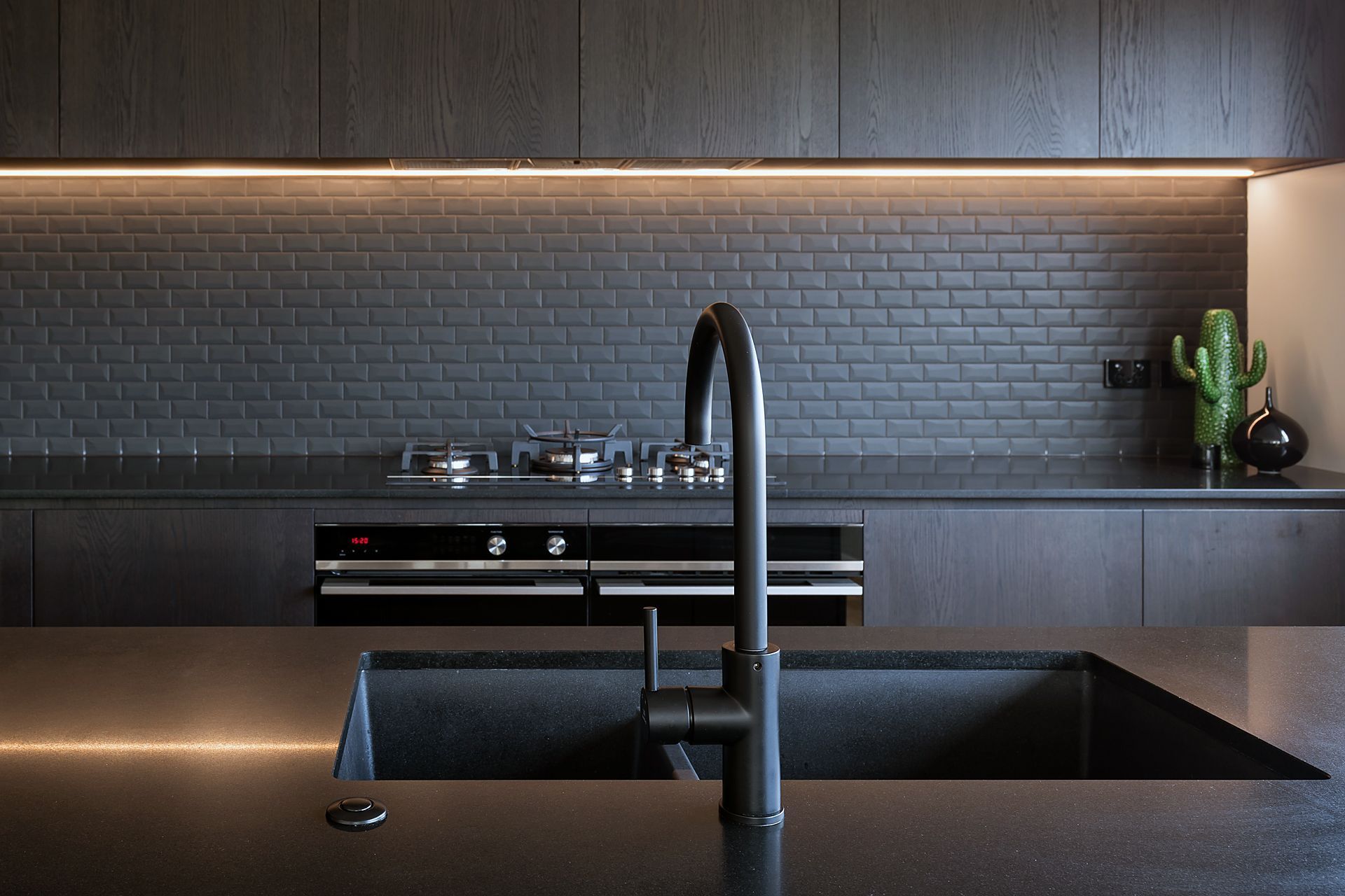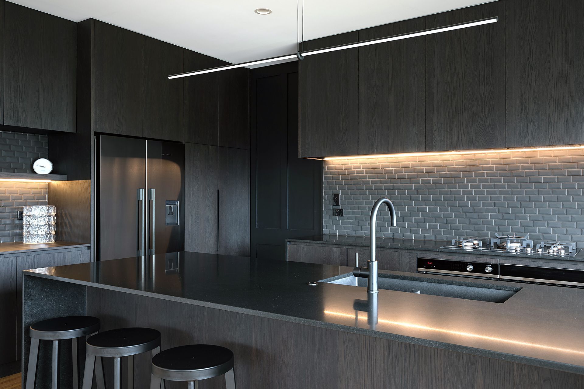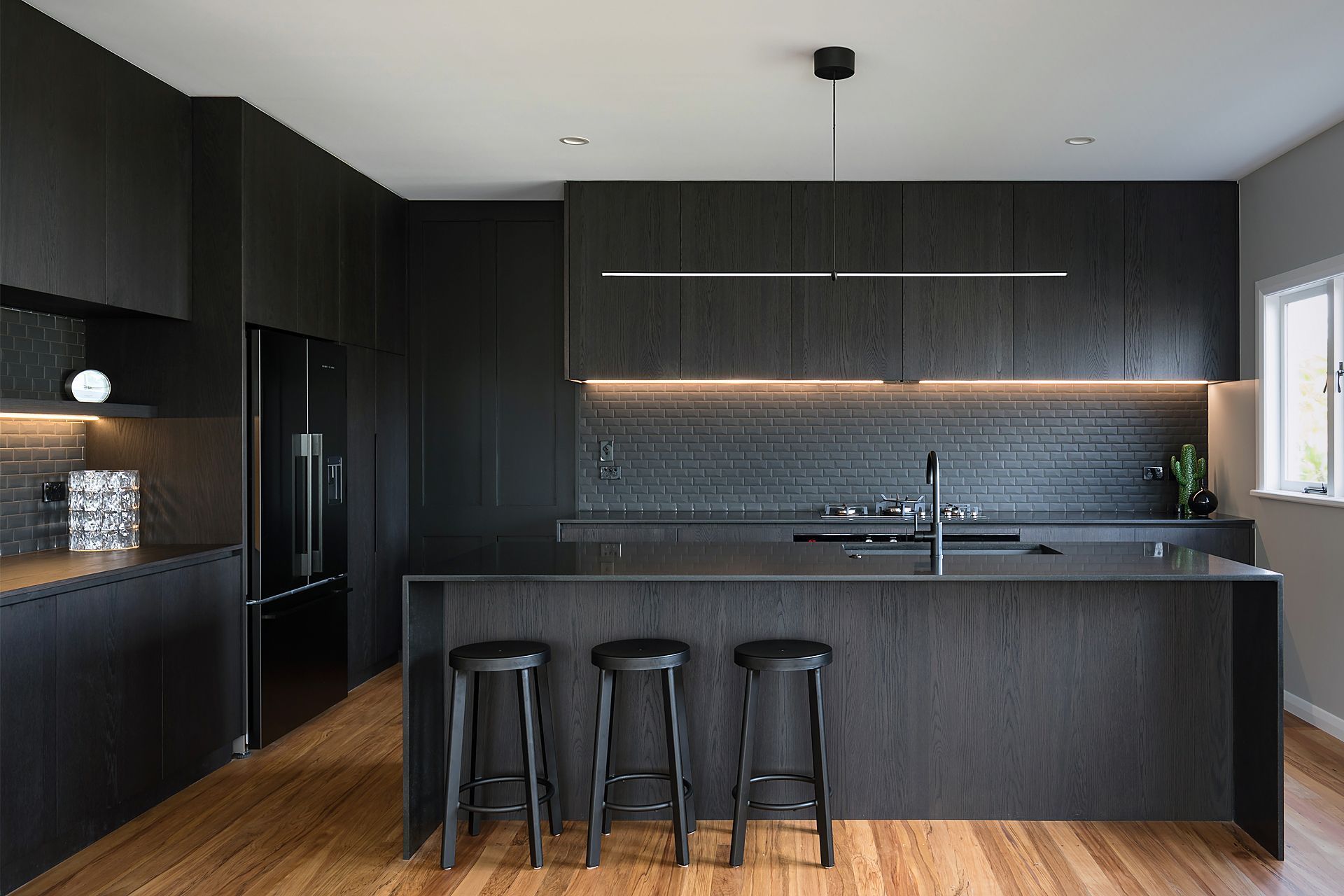 ArchiPro Project Summary - A striking all-black kitchen design featuring black wash oak, honed black granite benchtops, and minimalist lines, optimized for storage with ceiling-height cabinets and illuminated open shelving, creating a dramatic yet elegant culinary space.