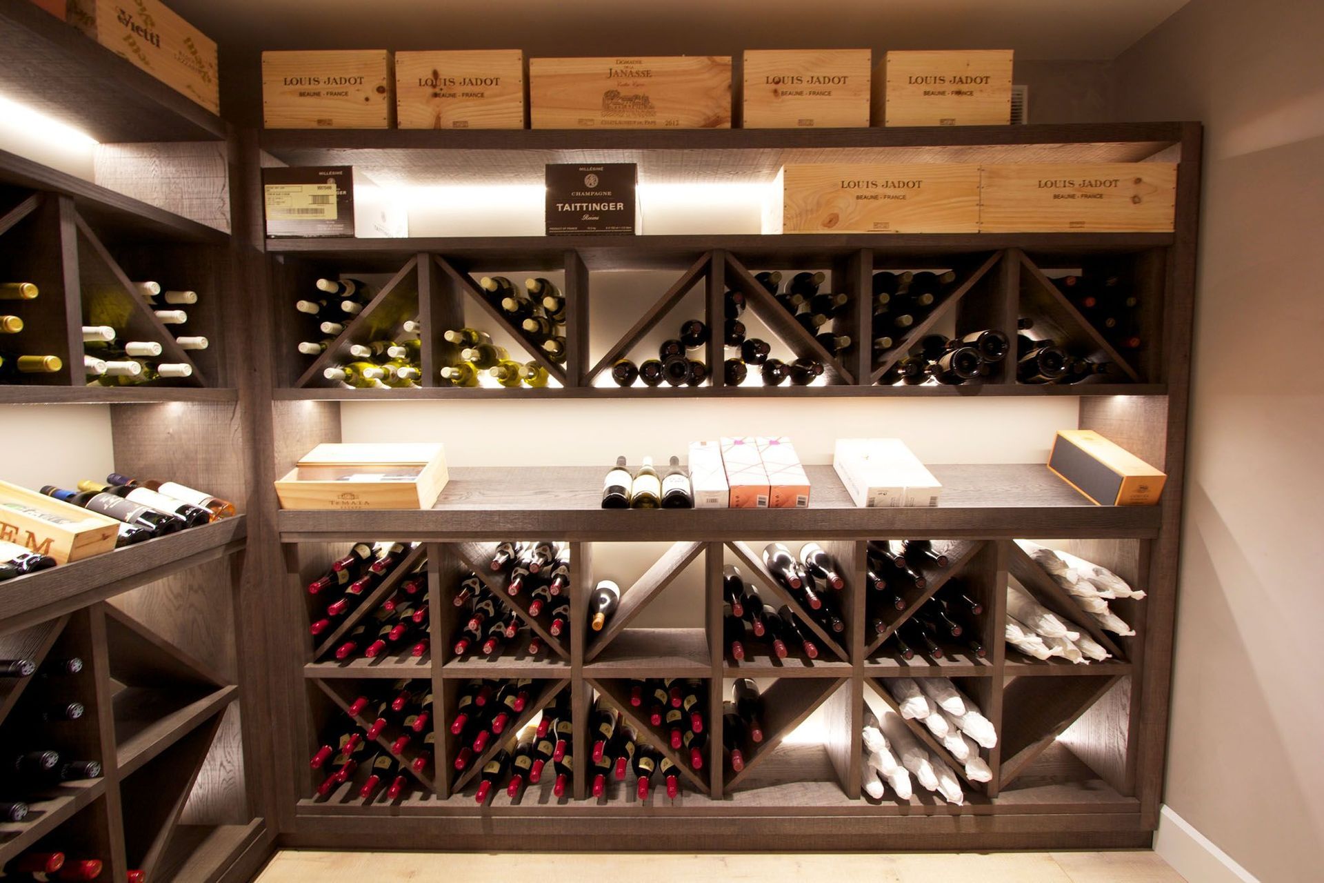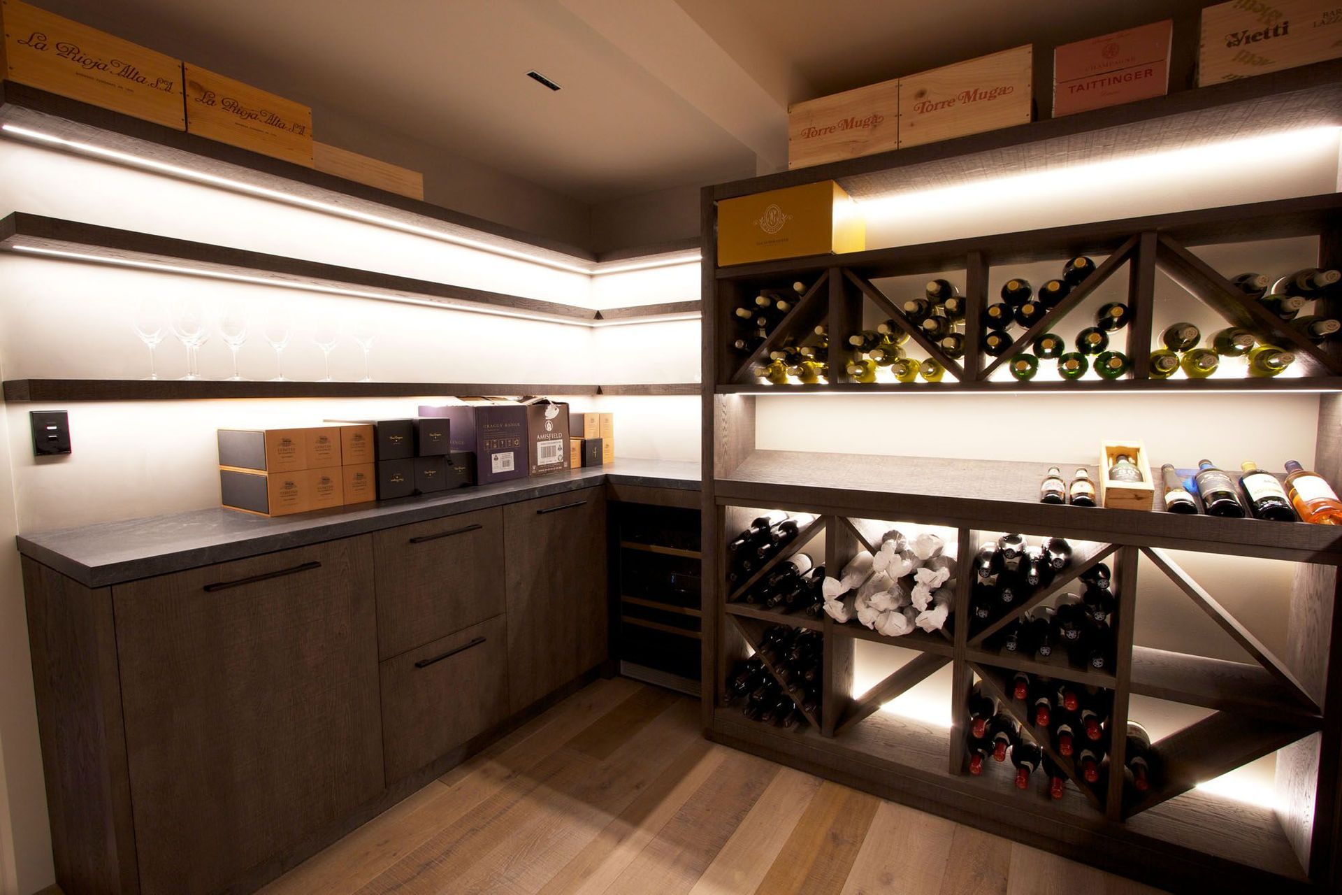 ArchiPro Project Summary - The Herne Bay Wine Cellar features custom shelving and a sophisticated wine rack, showcasing an impressive collection of wine bottles in an inviting retreat.