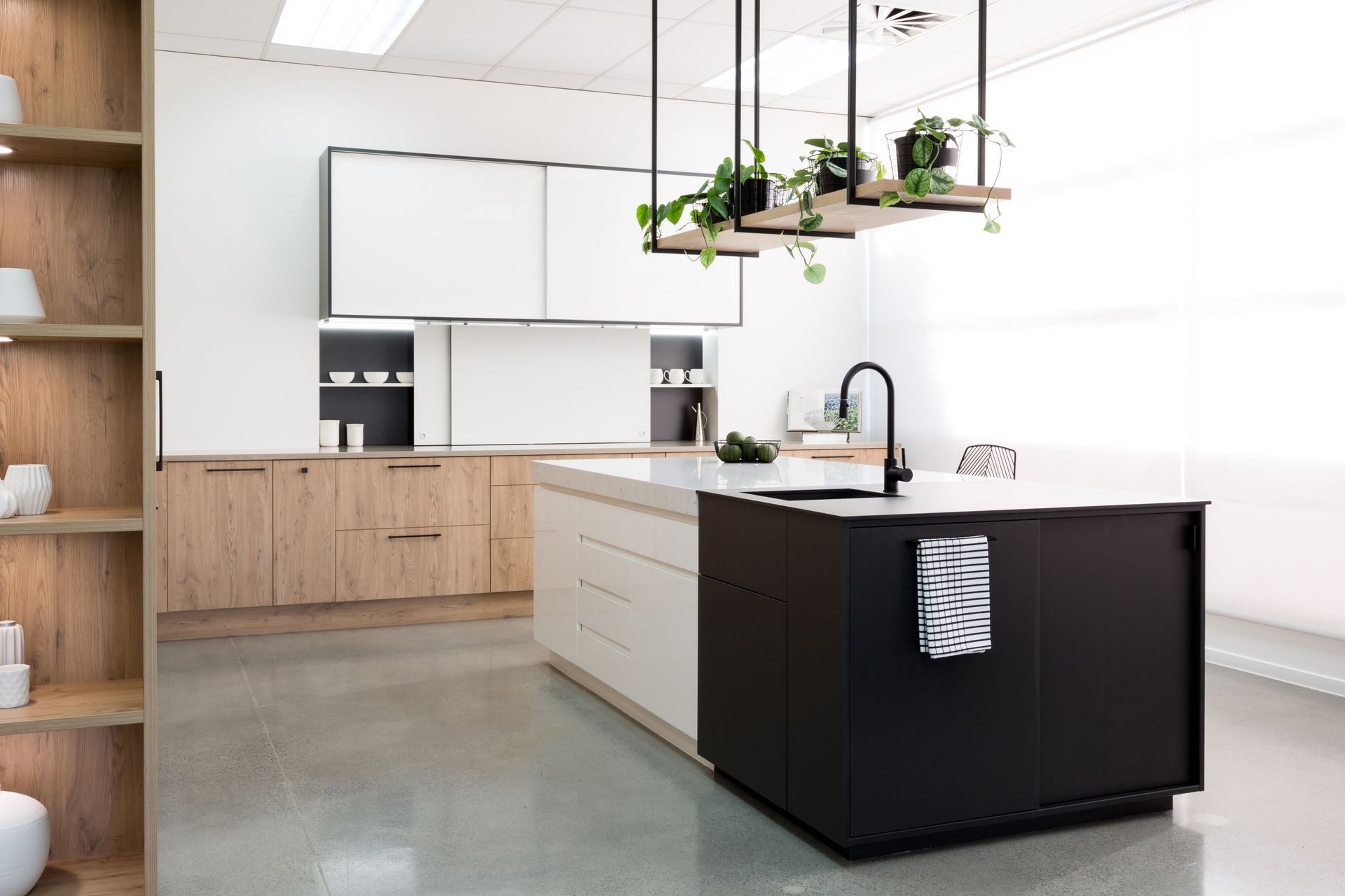 ArchiPro Project Summary - Hettich Showroom showcases a blend of veneer and melamine products from Prime Panels, highlighting a shift towards vibrant coloured melamine options, including Prime Honed Slate, Honed Silica, and Honed Steel, perfectly coordinating with Hettich fittings.