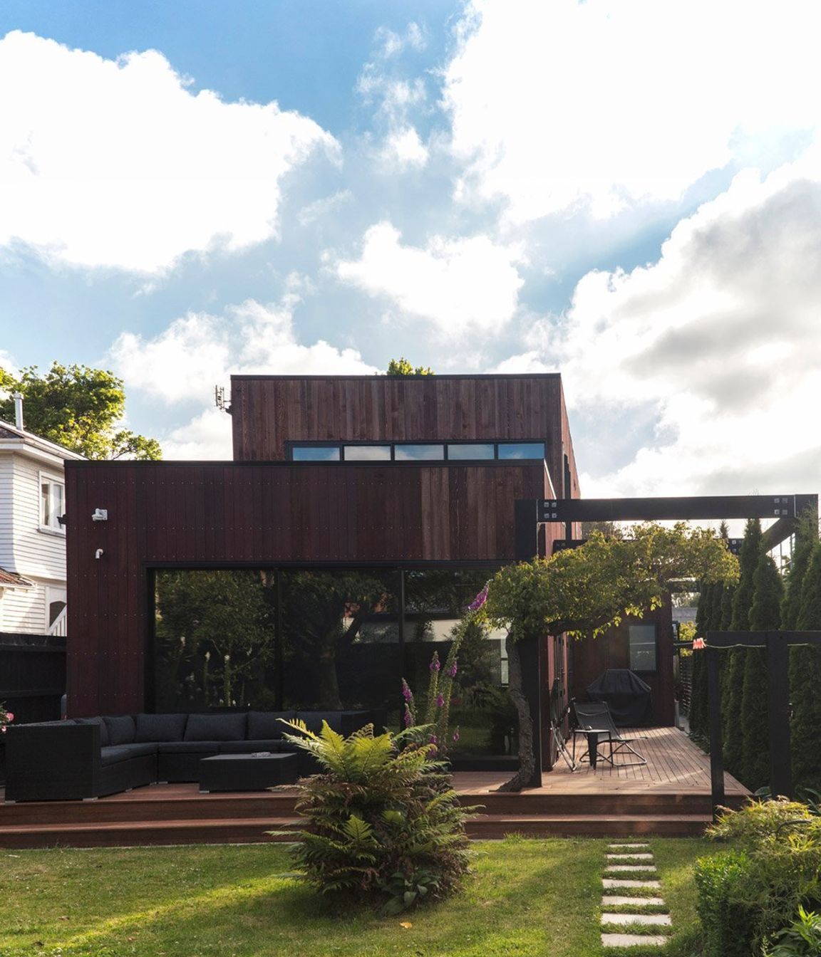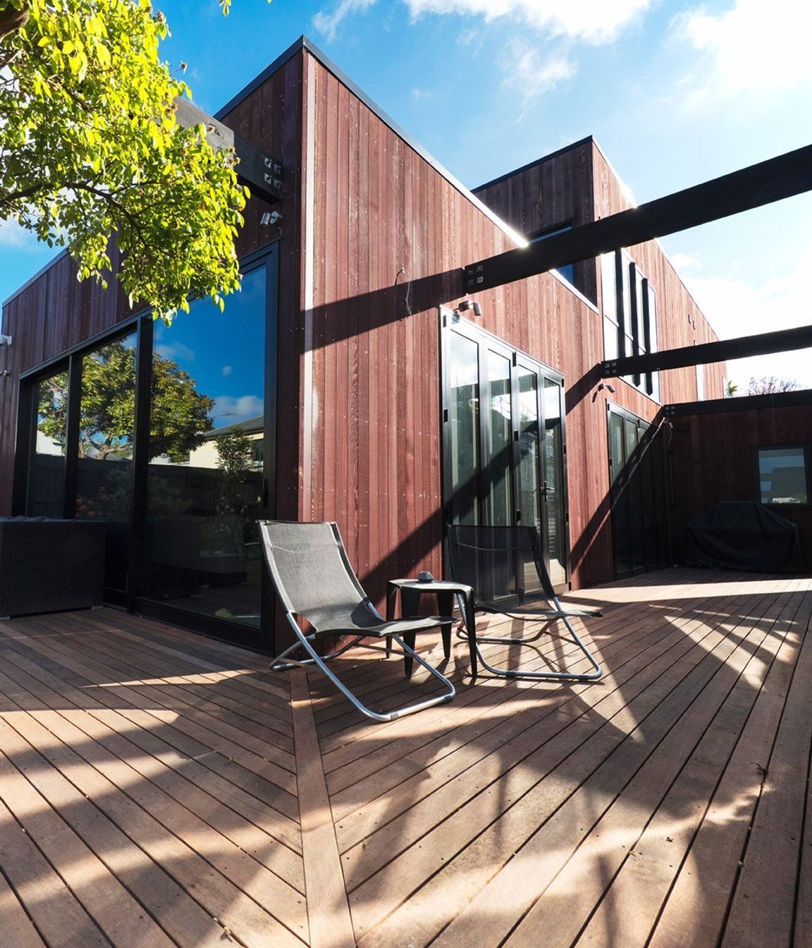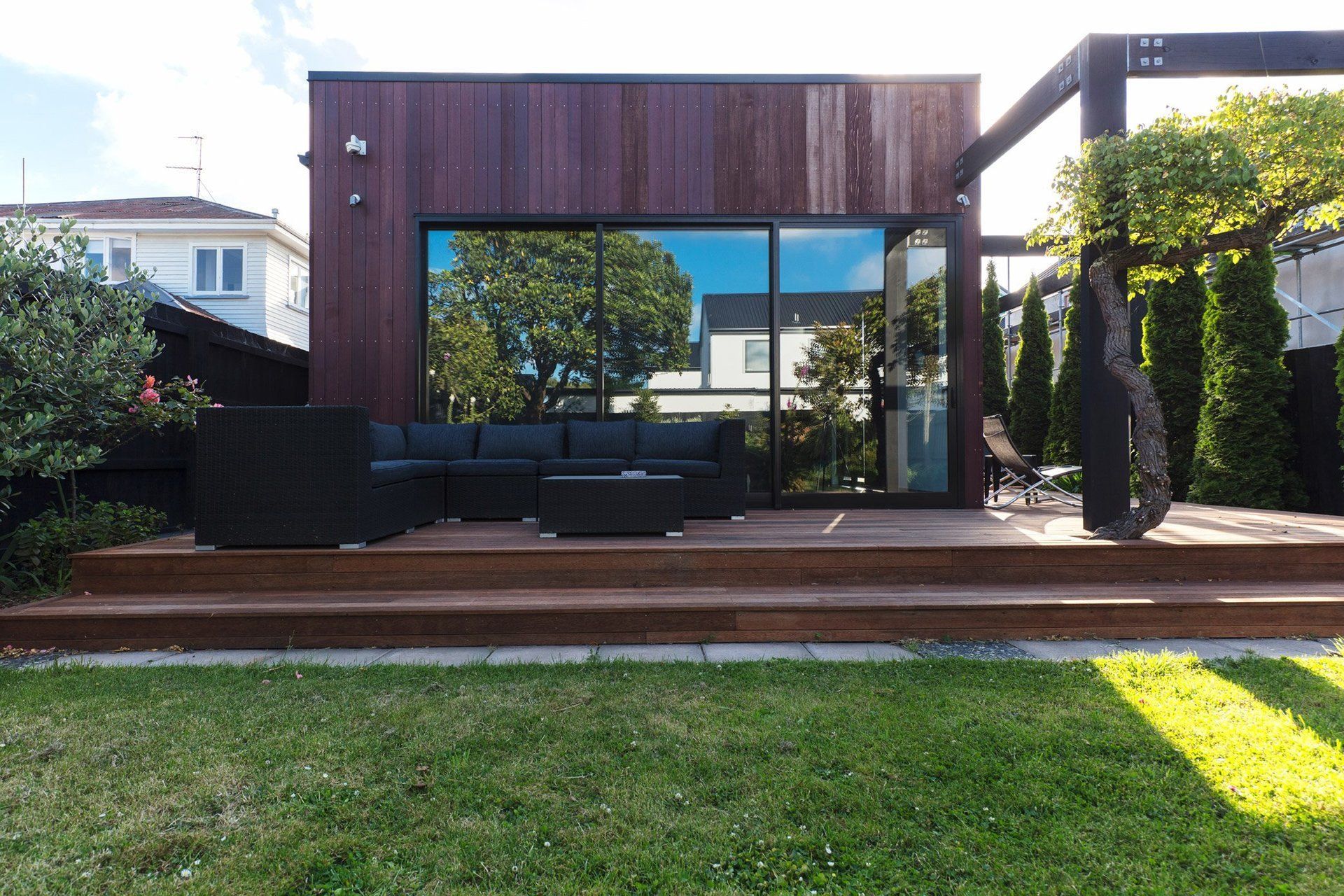 ArchiPro Project Summary - Architecturally designed family home featuring open-plan living, three bedrooms with en-suite bathrooms, cedar cladding, and a spacious deck for entertaining, all delivered on time and within budget.