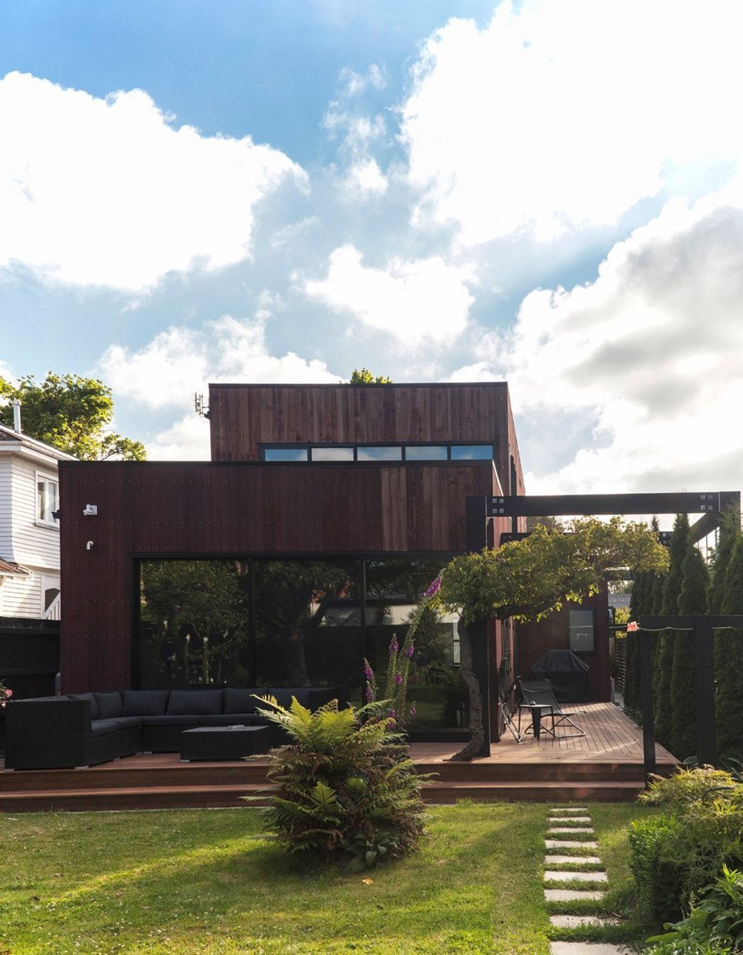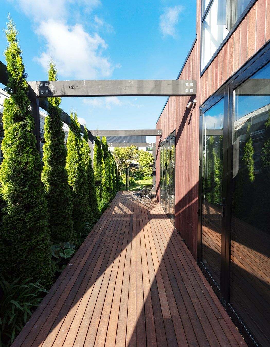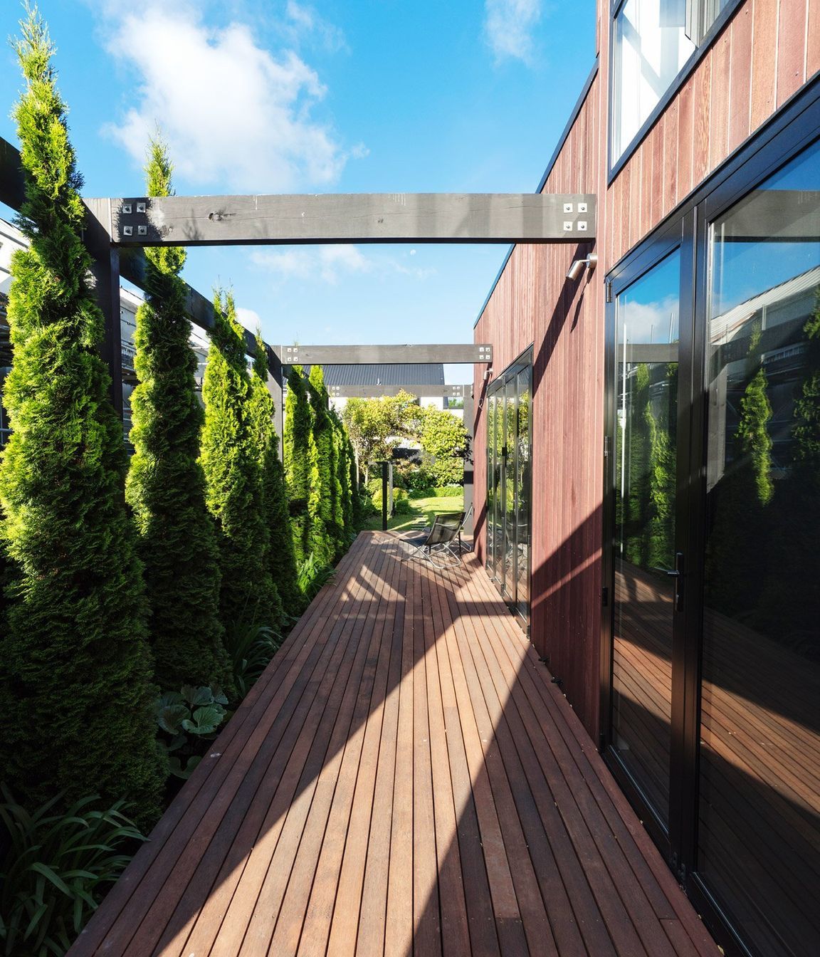 ArchiPro Project Summary - Architecturally designed family home featuring open-plan living, three bedrooms with en-suite bathrooms, cedar cladding, and a spacious deck for entertaining, all delivered on time and within budget.