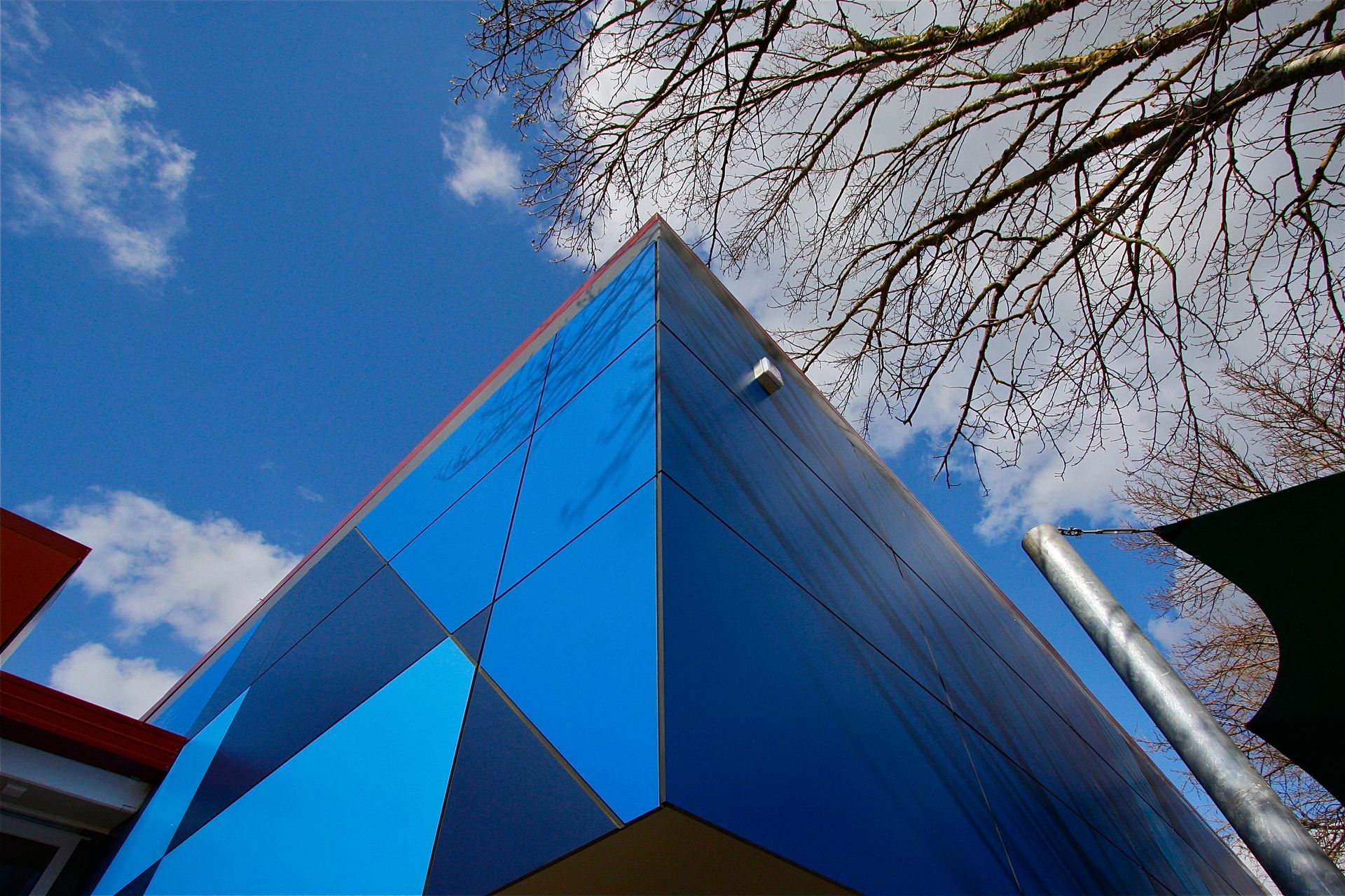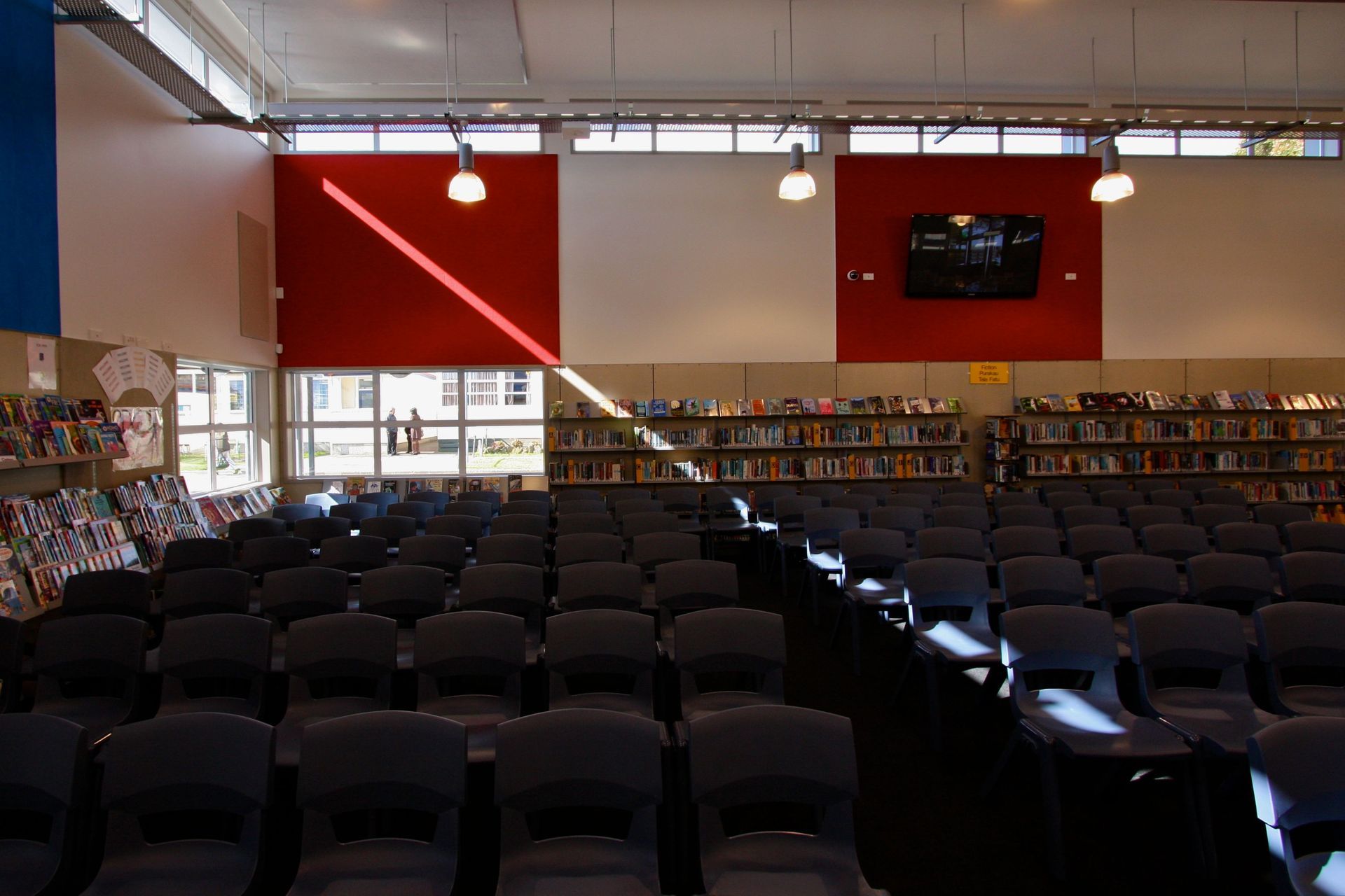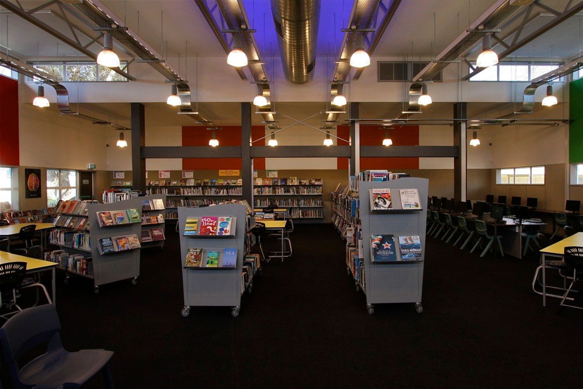 ArchiPro Project Summary - Refurbishment of a 1970s high school library into a vibrant 'Learning Factory' with an industrial aesthetic, featuring colorful Trespa cladding that honors the school's Polynesian heritage and the legacy of James Cook, creating a multifunctional space for learning and events.