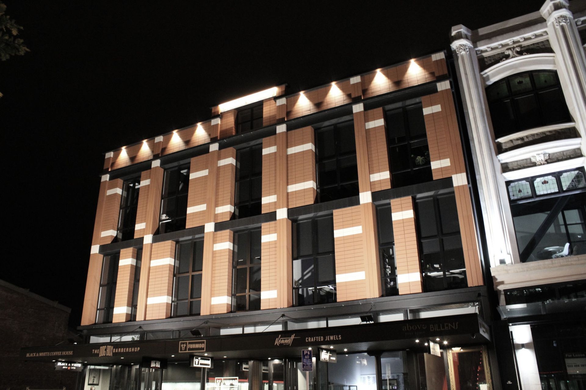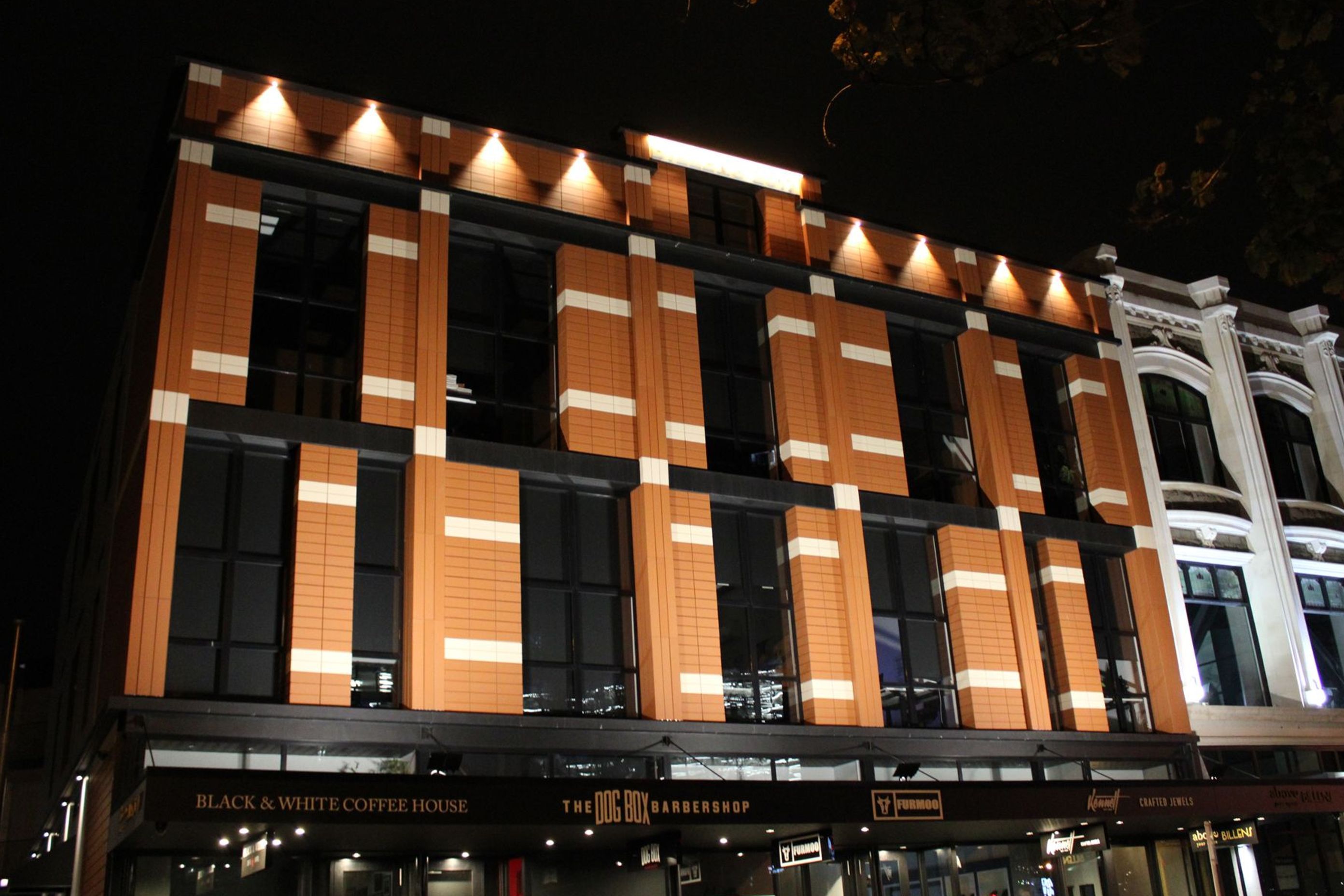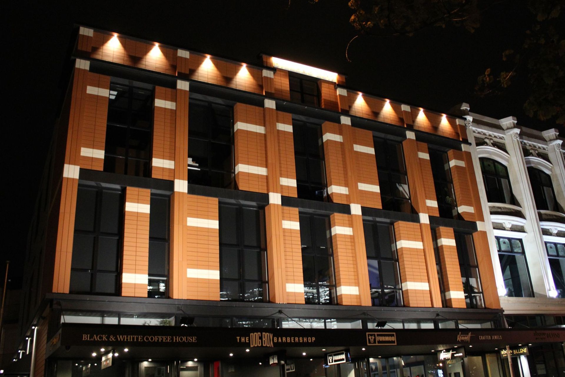 ArchiPro Project Summary - A striking development at 177 High Street, Christchurch CBD, featuring eye-catching red and white Jacobsen's Tiles that enhance the building's aesthetic appeal, completed for the Stockman Group and overlooking the Vodafone building.