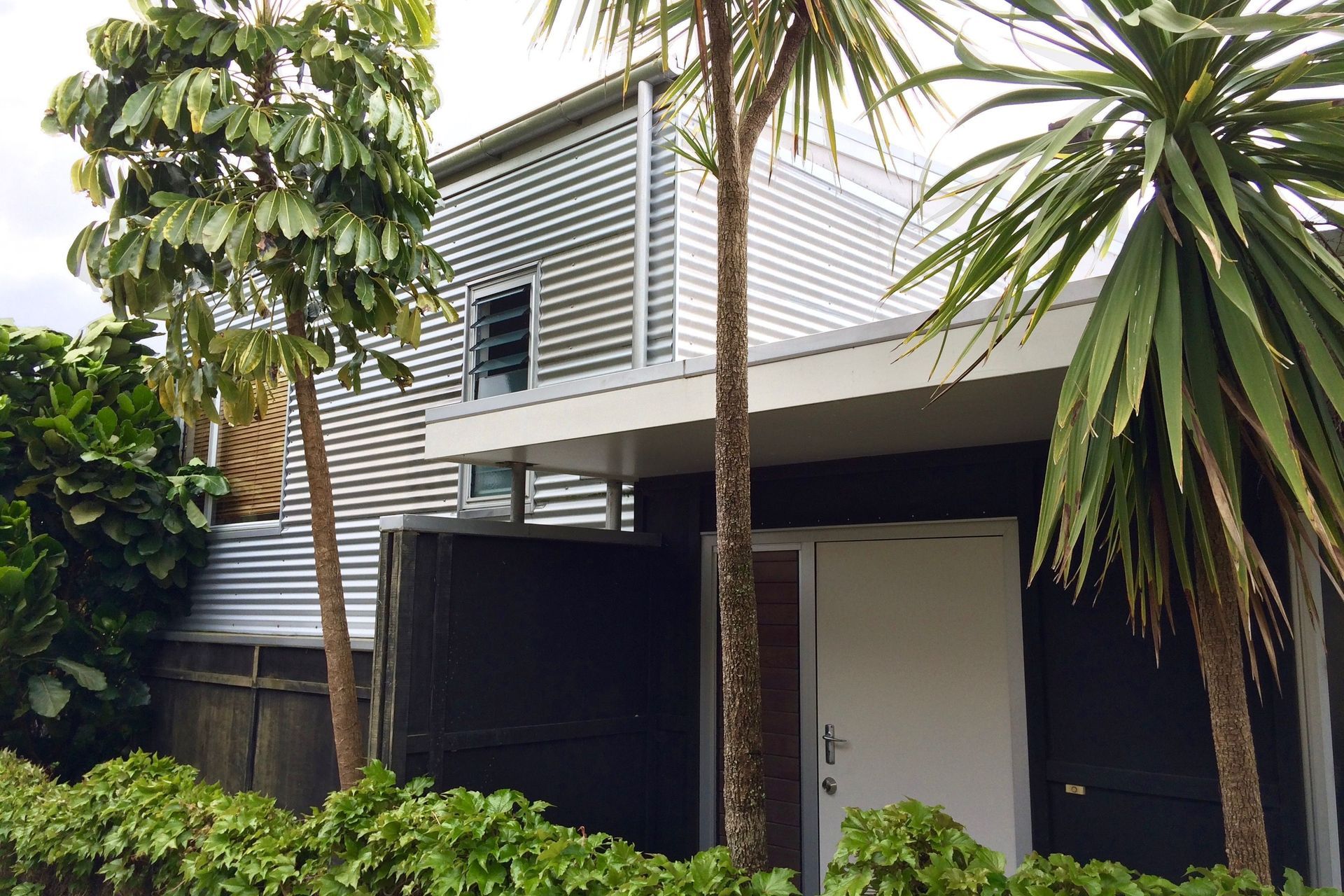 ArchiPro Project Summary - Thoughtfully designed addition to an existing bach, featuring a cohesive form and roof, enhanced with a diverse palette of materials including corrugated iron, stained plywood, and board and batten.