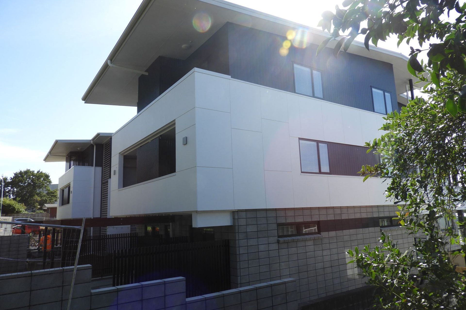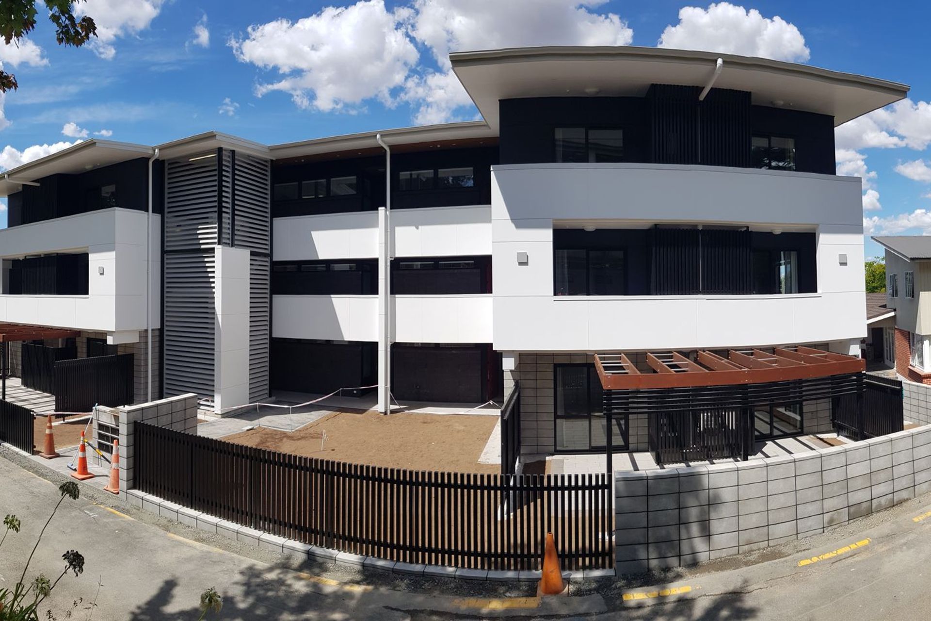 ArchiPro Project Summary - Hillcrest Views: A four-storied apartment block featuring nine luxury apartments with high-end finishes, strategic hillside construction, and stunning views, completed in 2020 for the New Zealand Training Centre.