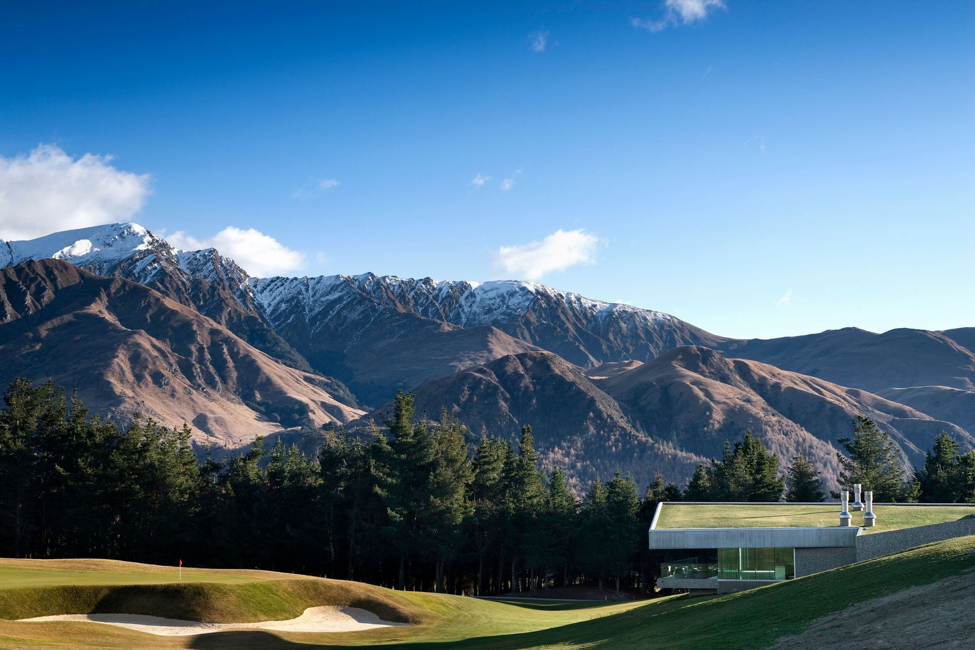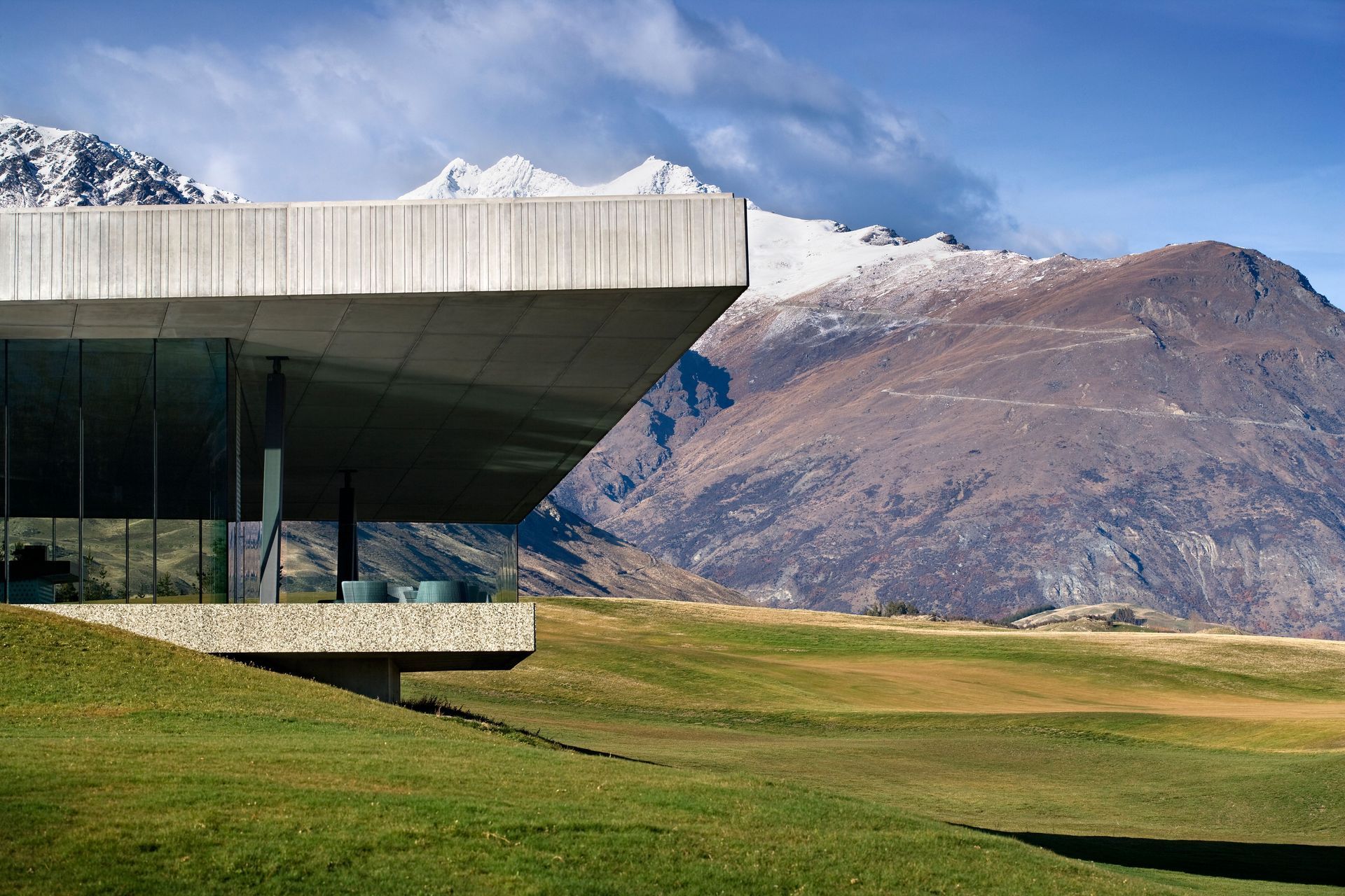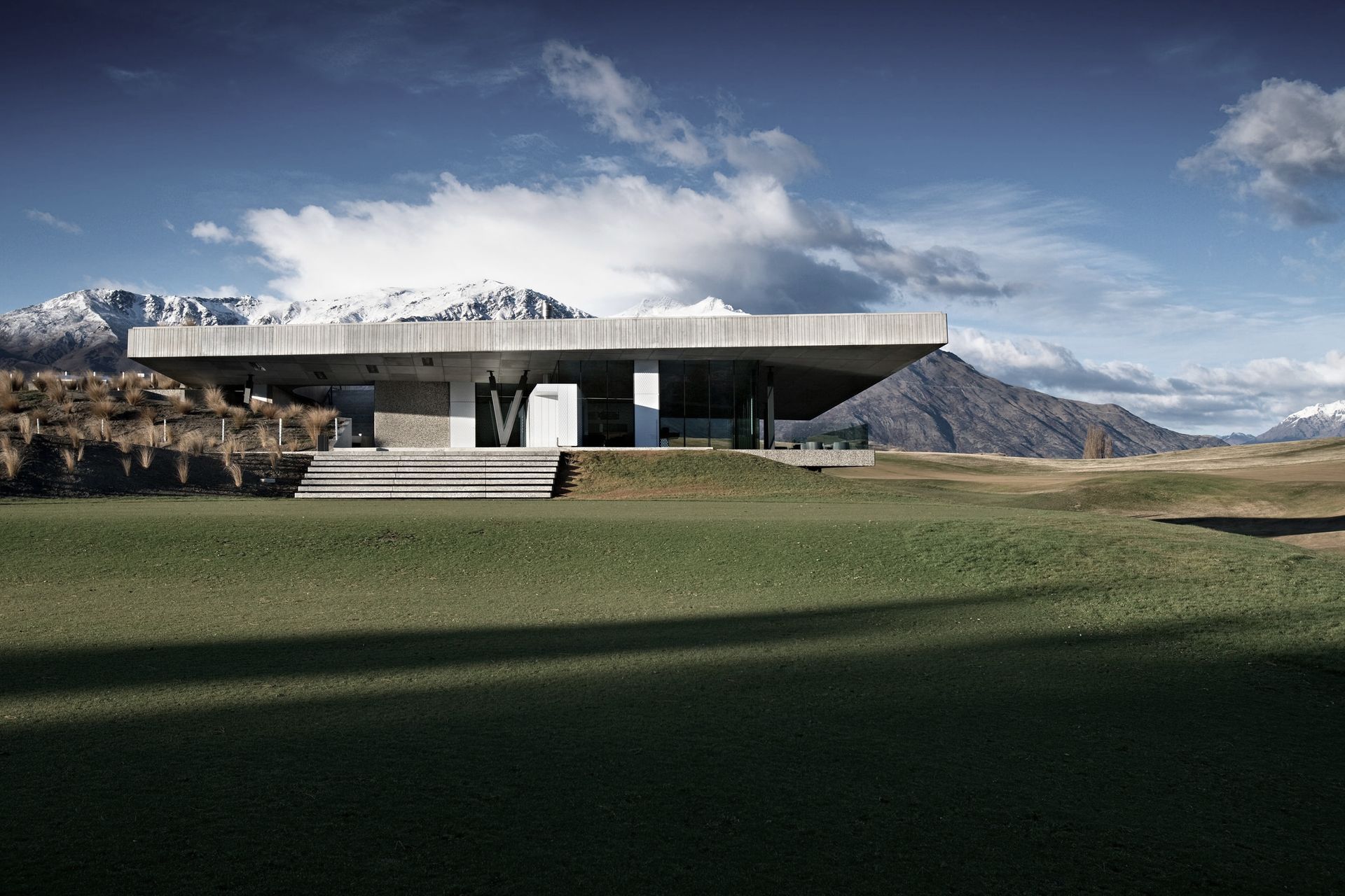 ArchiPro Project Summary - A golf-centric clubhouse harmoniously integrated into the landscape, featuring a unique truss structure and green roof, designed to enhance the relationship between players, the game, and the alpine environment while accommodating both private and competitive events.