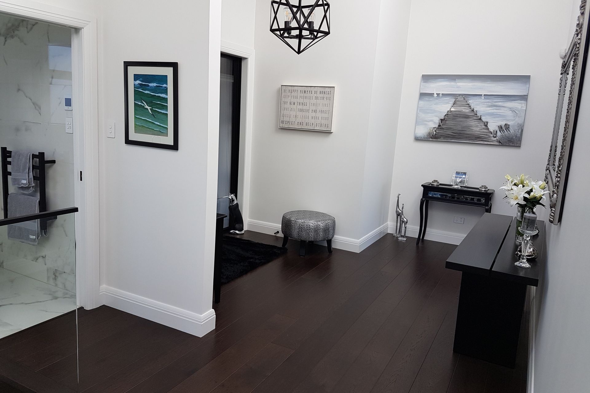 ArchiPro Project Summary - A stunning transformation featuring Kahrs Oak Nouveau Black flooring that beautifully contrasts with the light walls, enhancing the high ceilings and creating an elegant atmosphere throughout the Hillsborough Home.