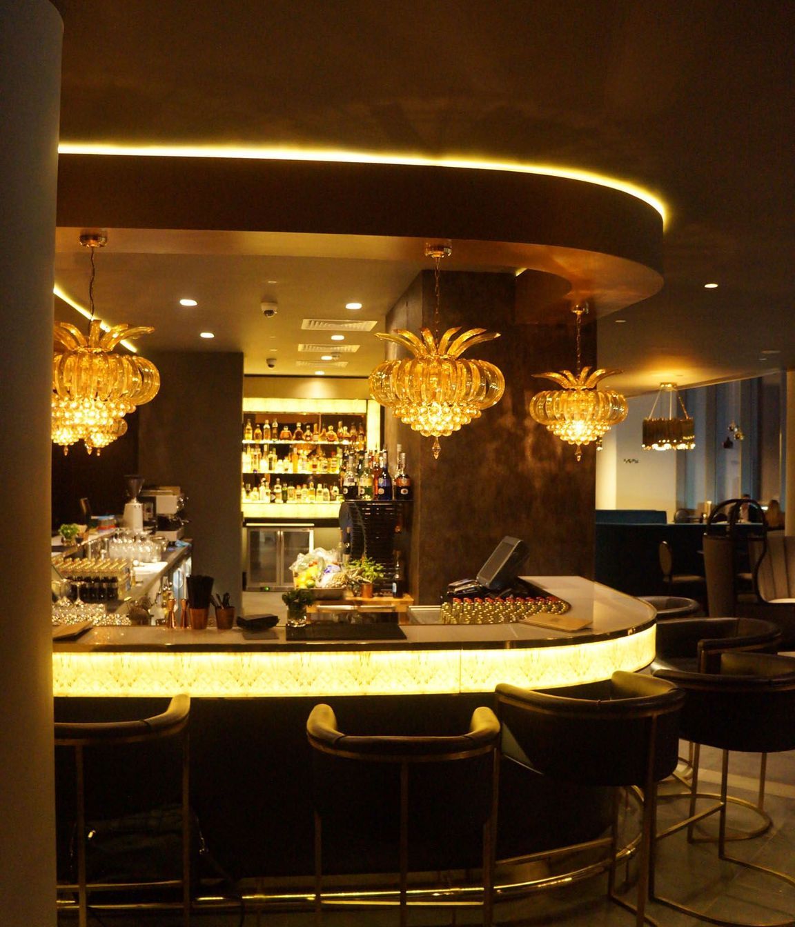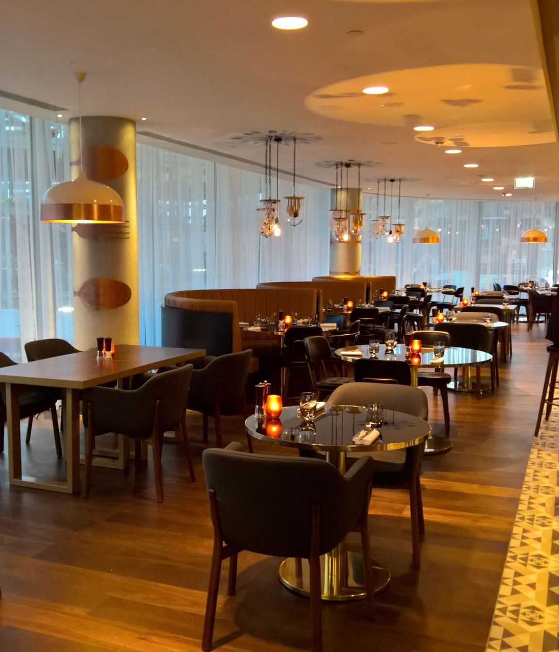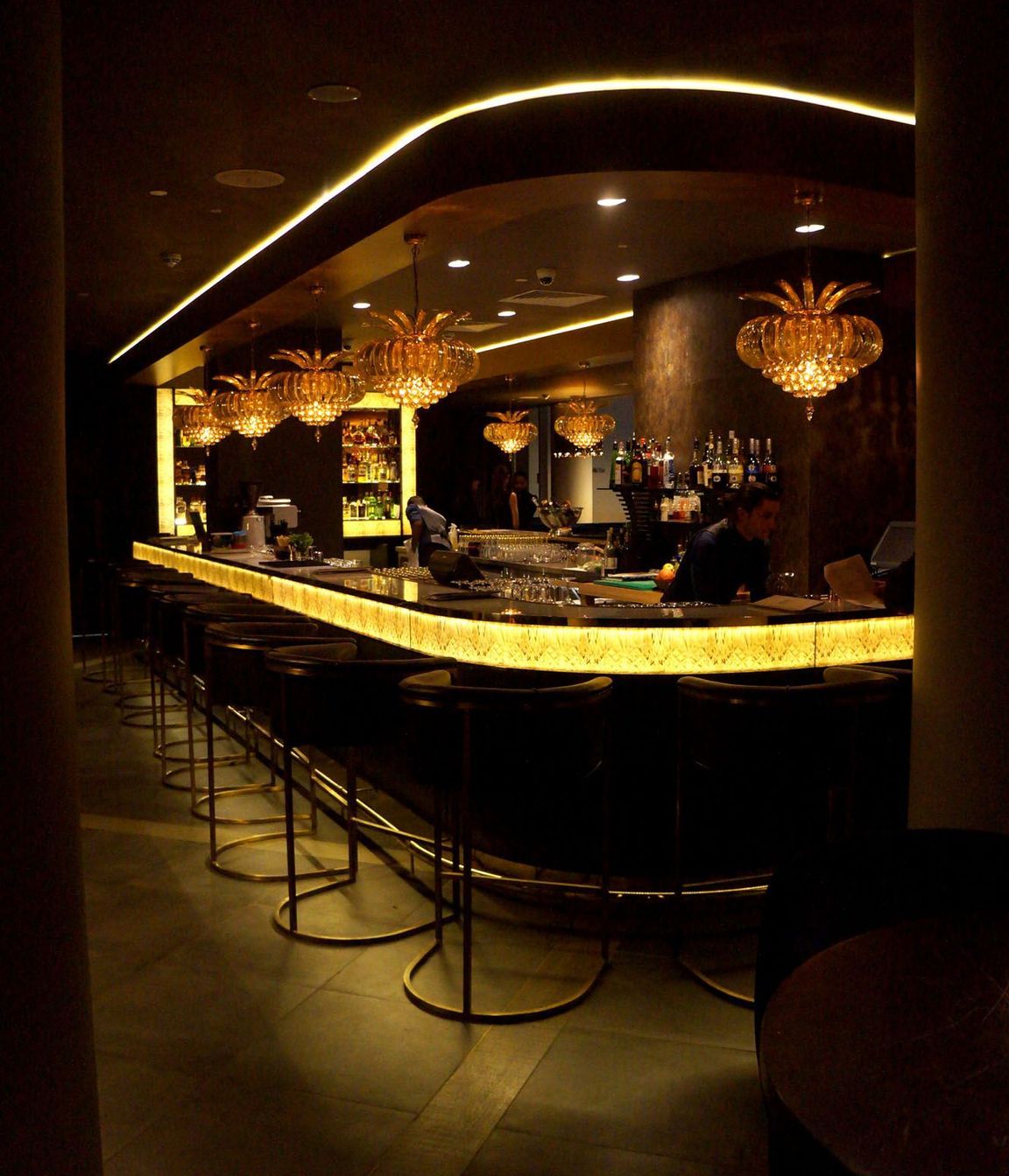 ArchiPro Project Summary - Innovative lighting design for Hilton Bournemouth, featuring bright and airy public spaces complemented by a moody sky bar, created in collaboration with Scott Brownrigg and Ted Baker.