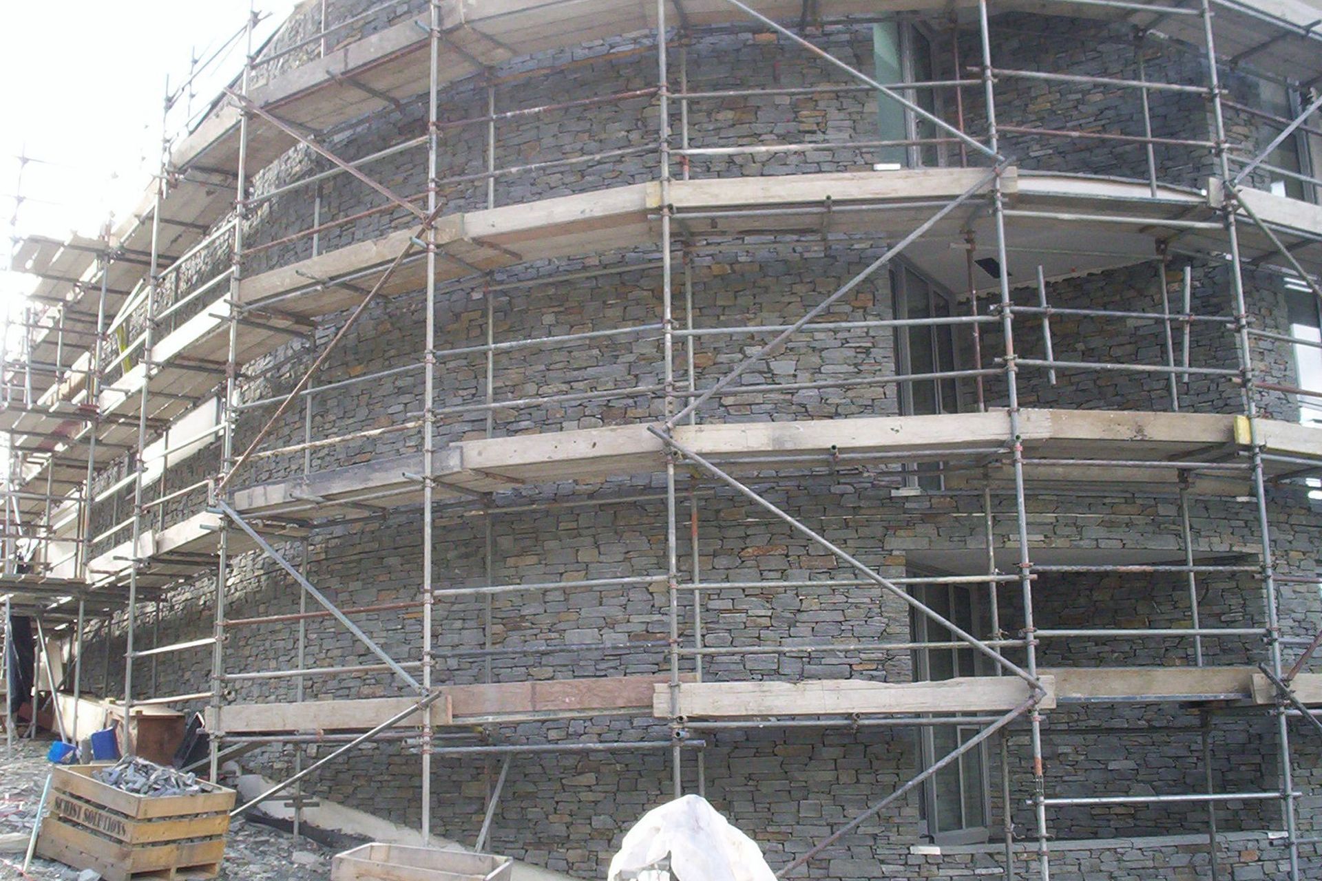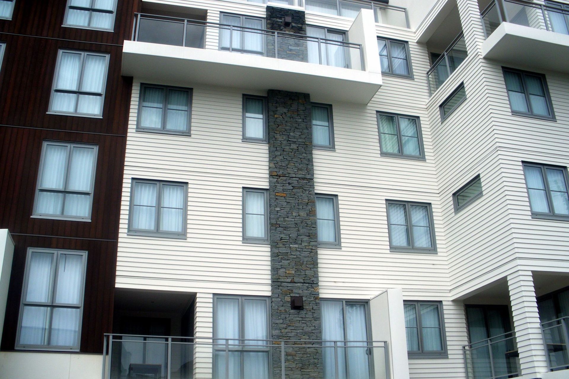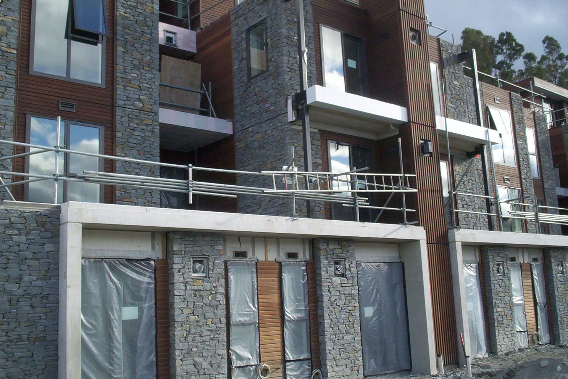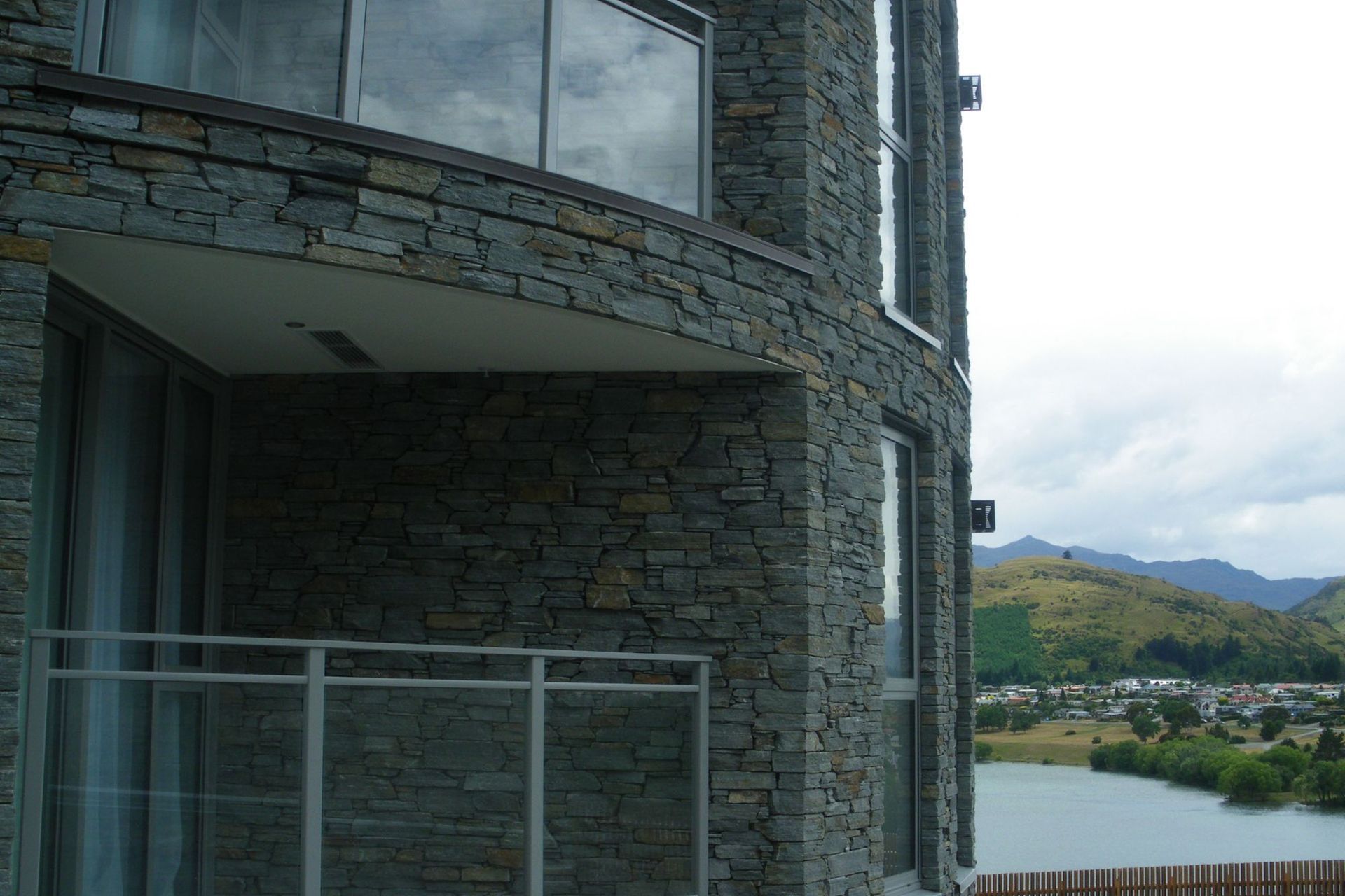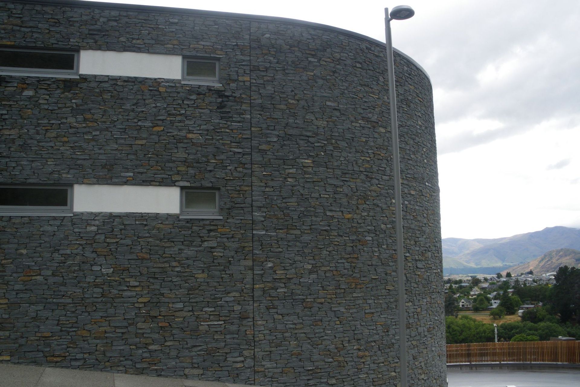 ArchiPro Project Summary - Gibbston Valley Schist cladding for Hilton Hotel, featuring over 3000M2 of lightweight stone installed on a steep hillside, showcasing local materials in a stunning lakeside location, completed on time and within budget.